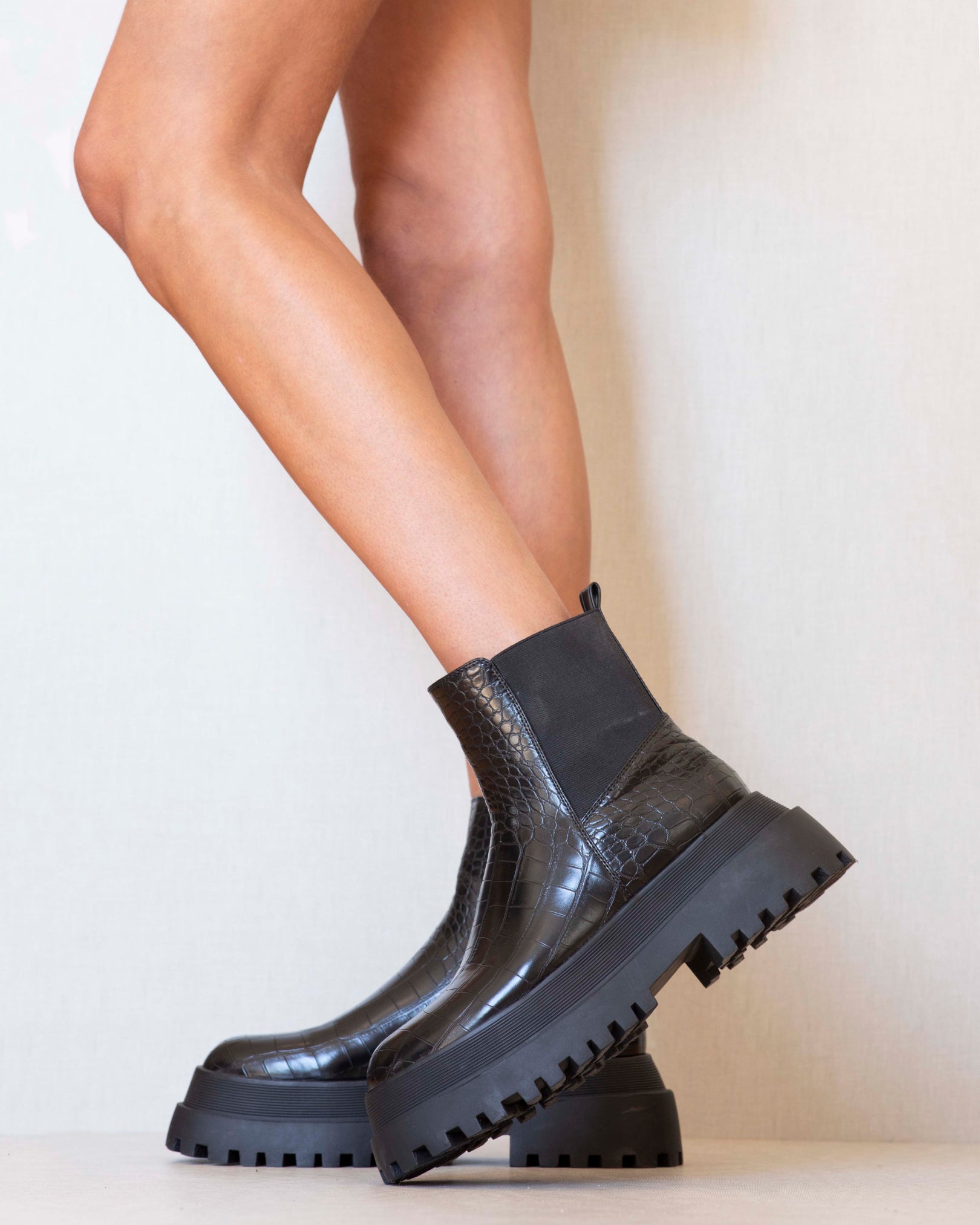 Bota de plataforma en cuero vegano grabado en coco. Goma elástica en el lateral para una mayor comodidad.