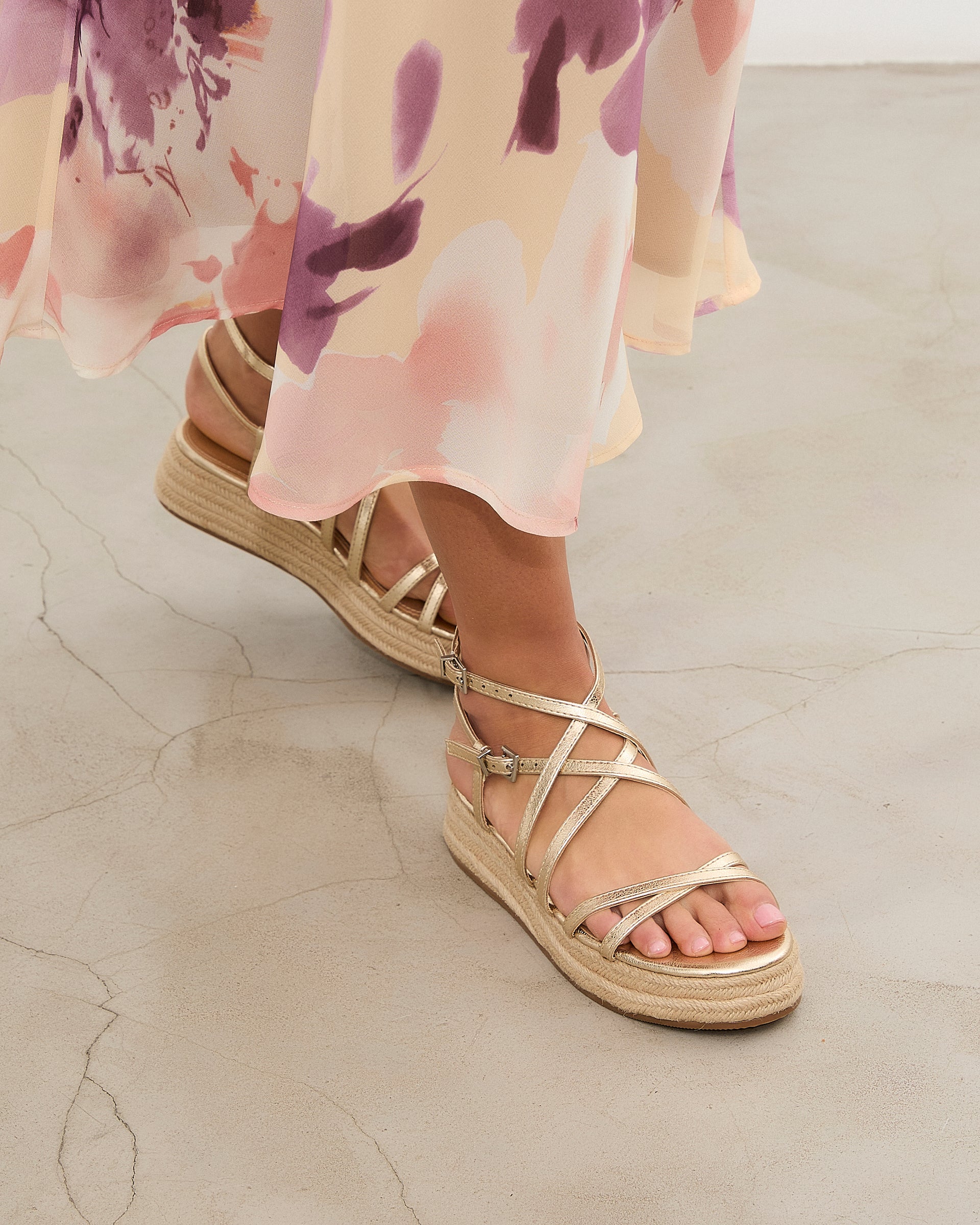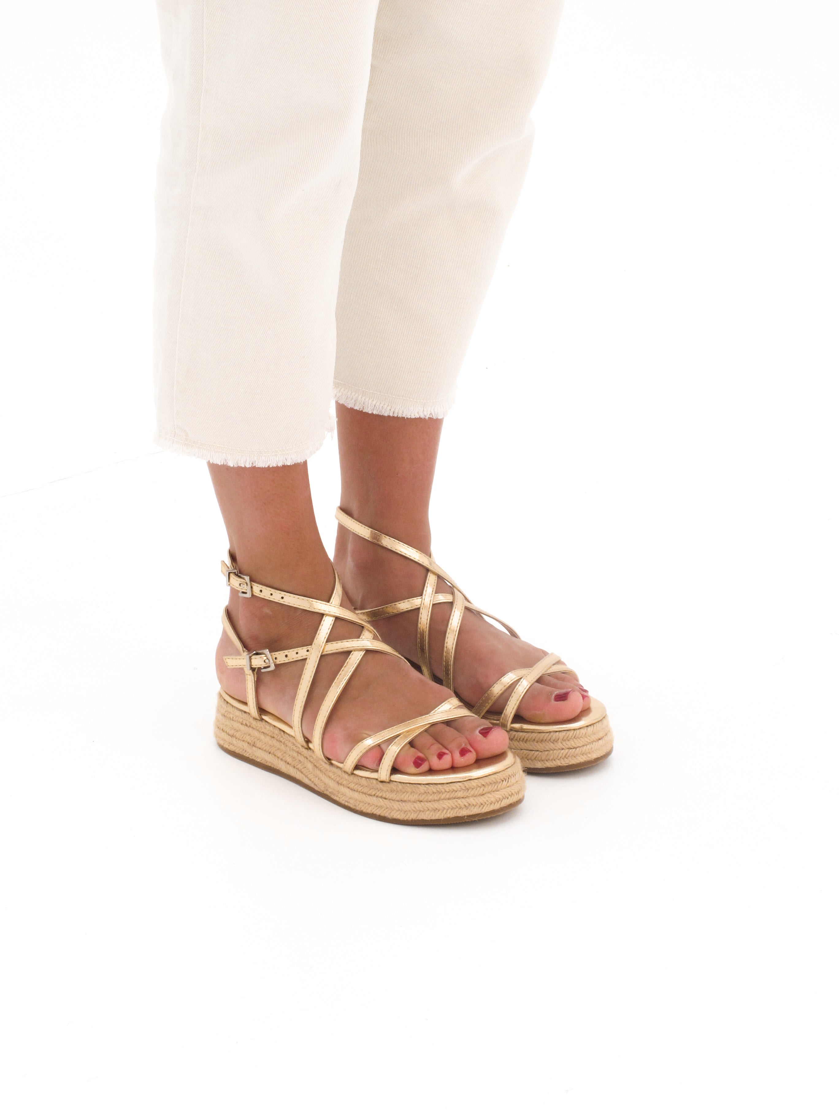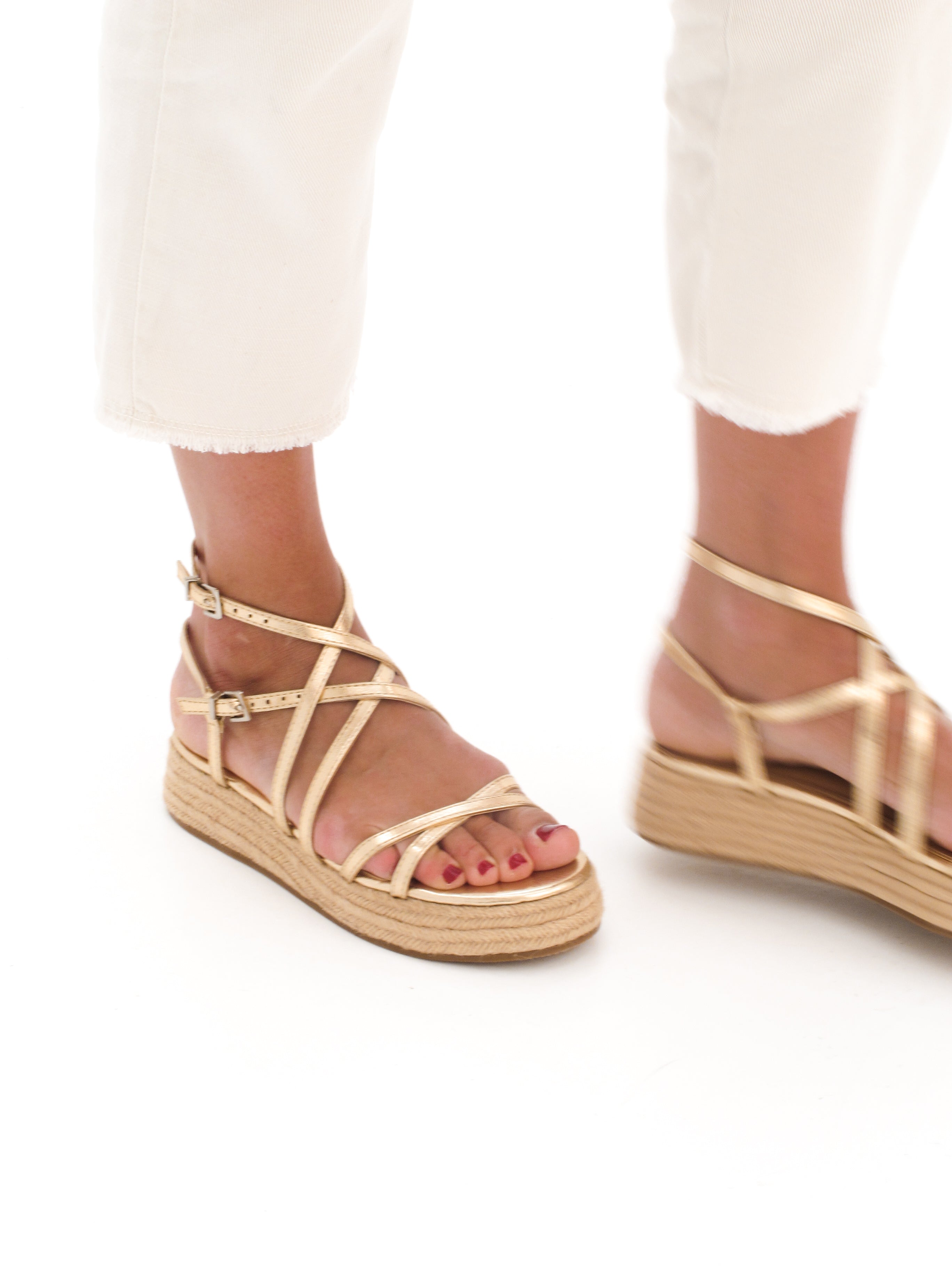 Sandalia con doble suela esparto. Tiras a distintas alturas y sujeción en el tobillo en piel vegano dorado.