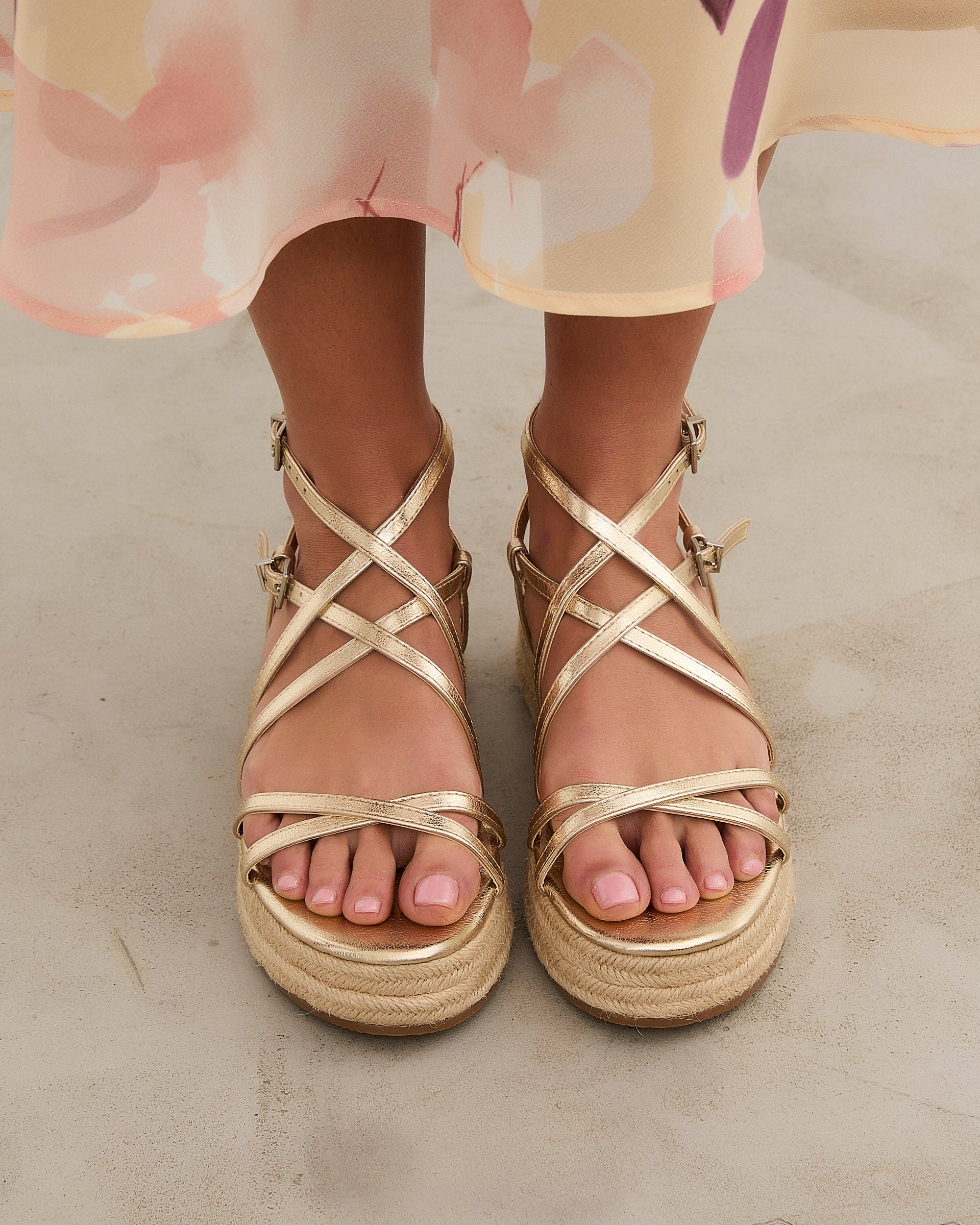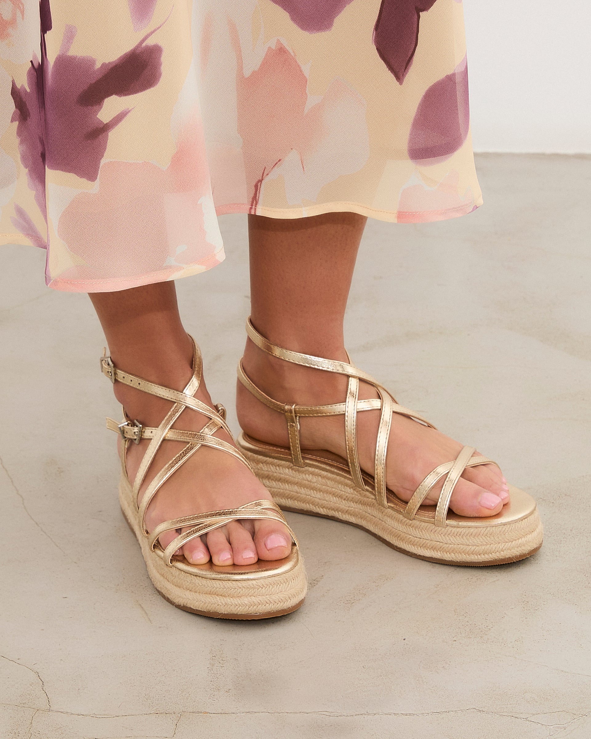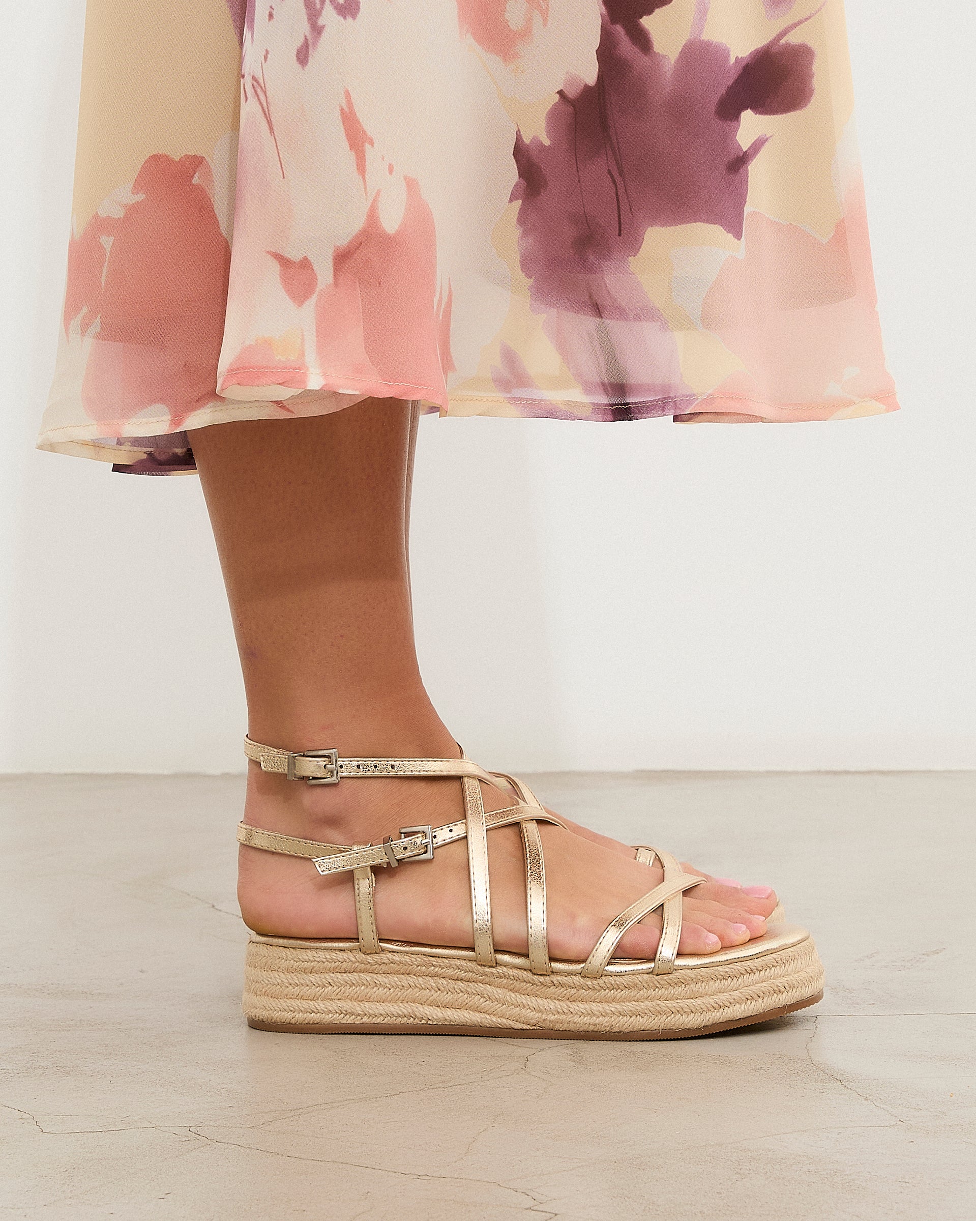 Sandalia con doble suela esparto. Tiras a distintas alturas y sujeción en el tobillo en piel vegano dorado.