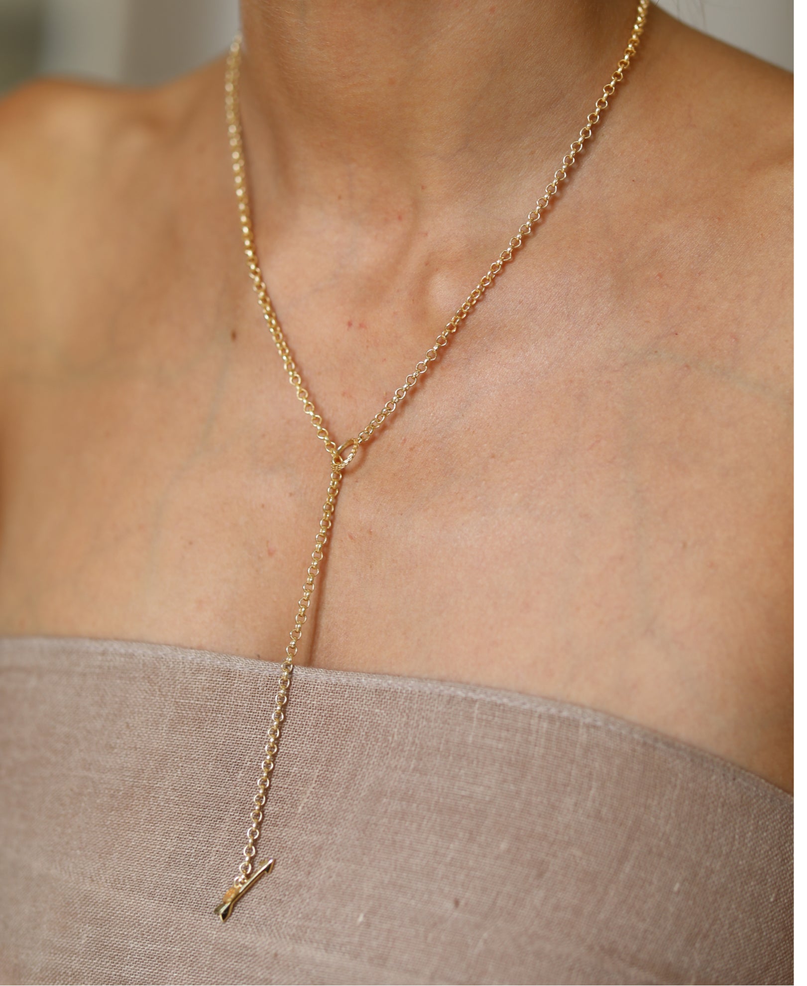 Cadena dorada, con un aro en un extremo y en el otro una flecha. Estos elementos forman a su vez el cierre, que se encuentra en la parte delantera quedando la flecha colgando.