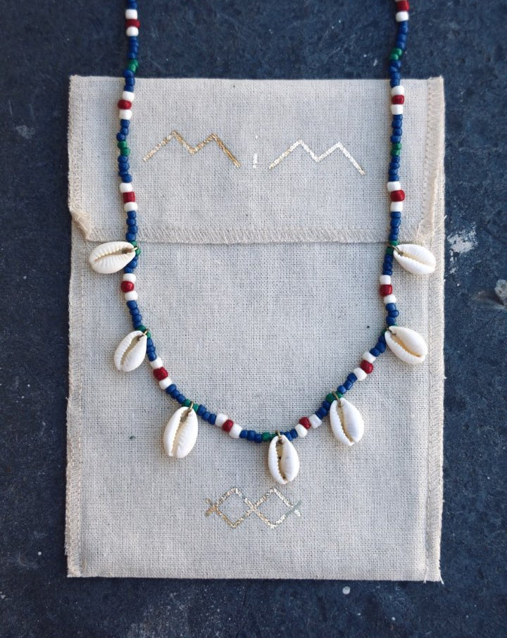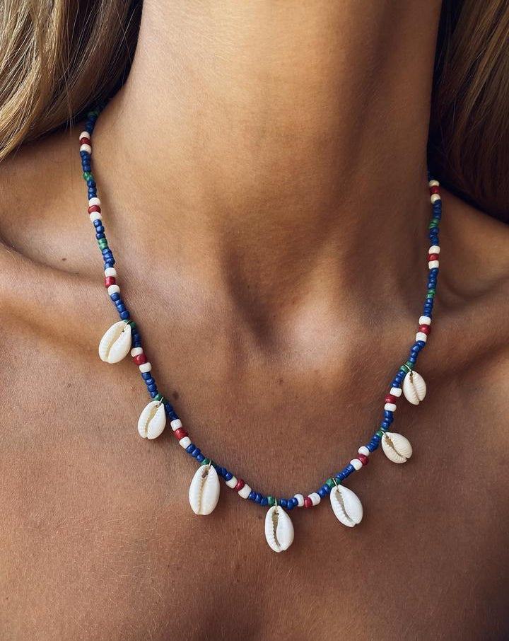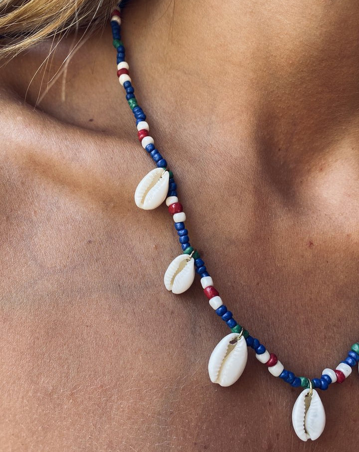 Collar de abalorios color azul con detalles en rojo y blanco. Varias conchas colgadas. Cierre dorado.