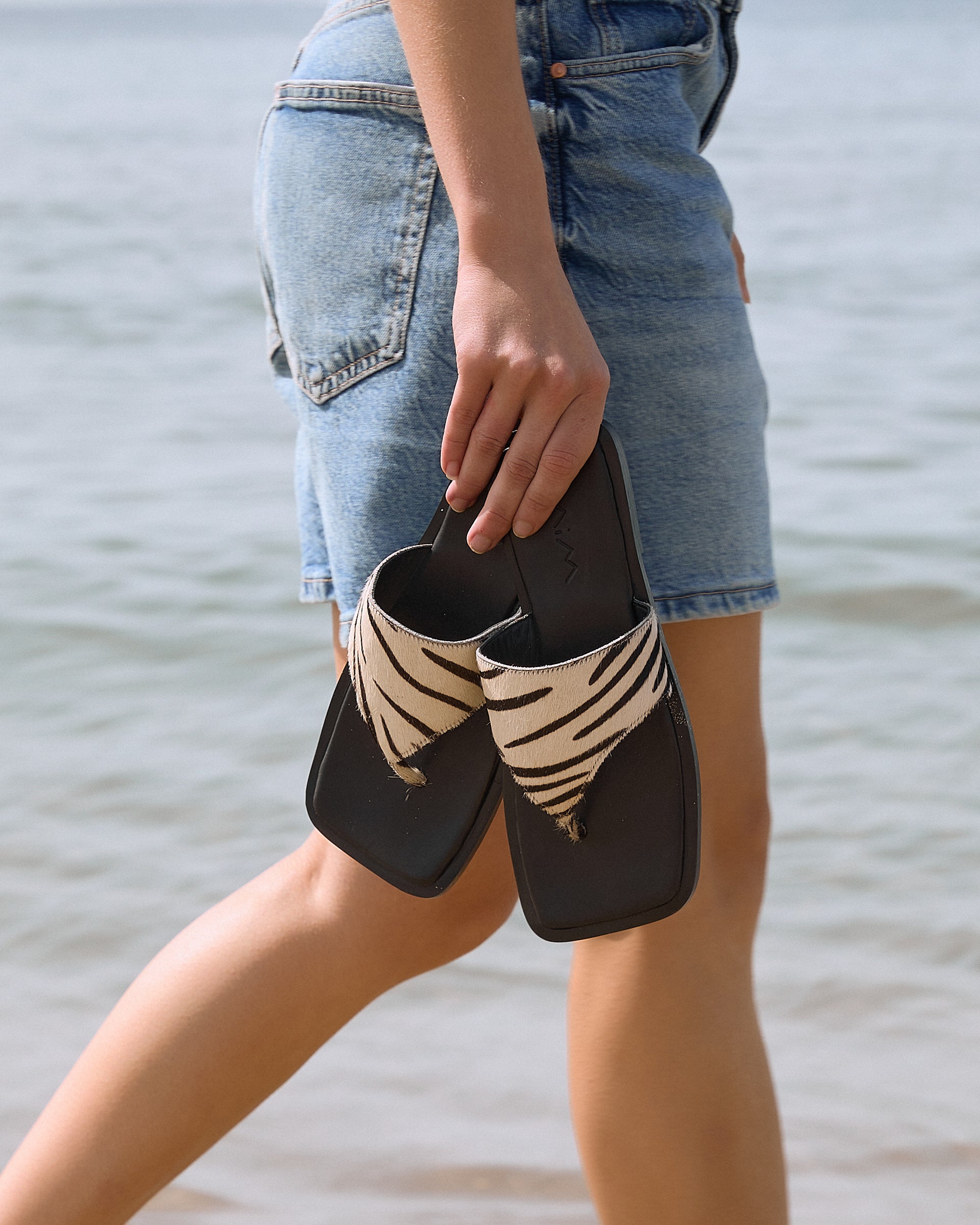 Sandalia plana de piel negra con pelo print cebra con puntera cuadrada. Tira grusa con posición para dedo.