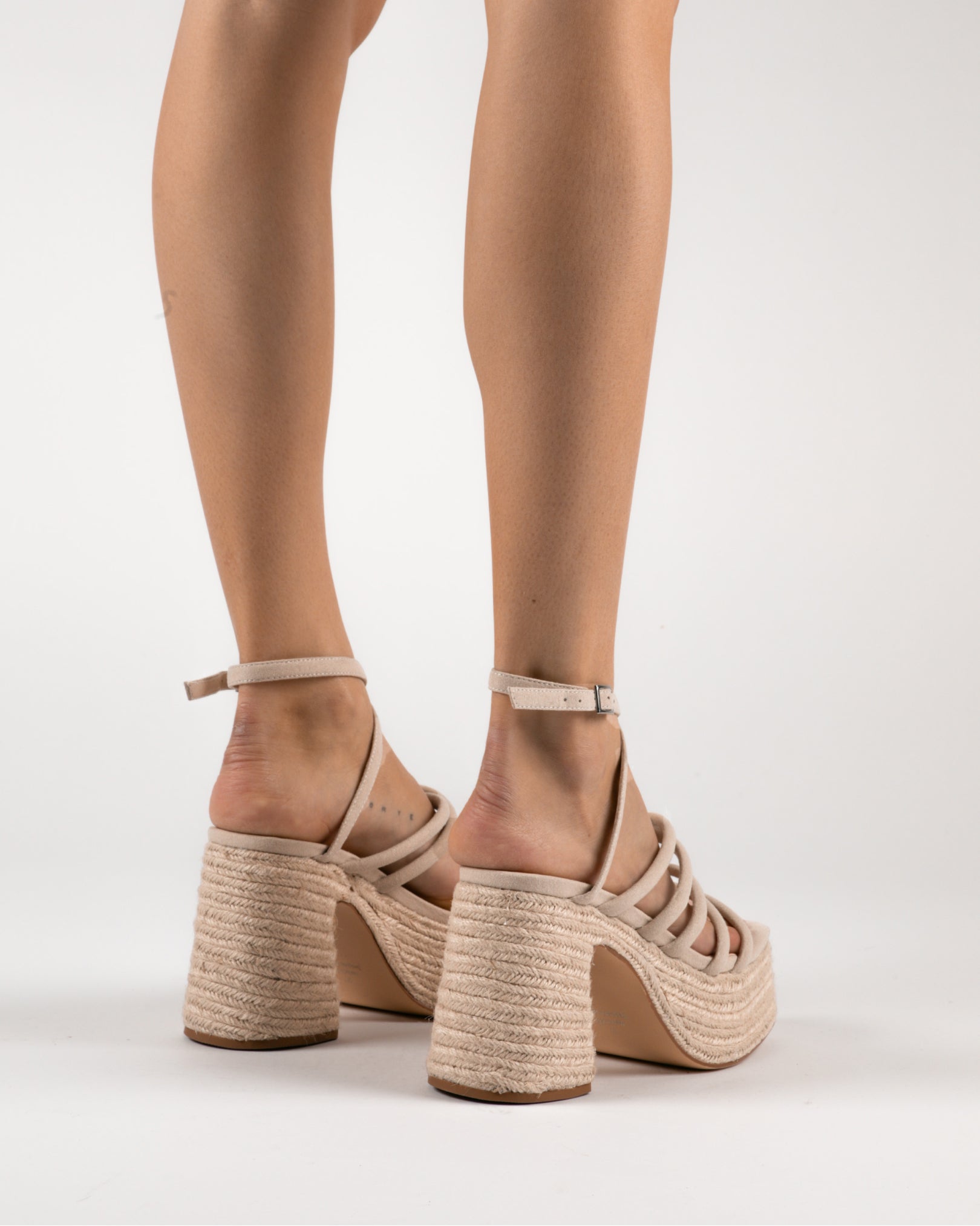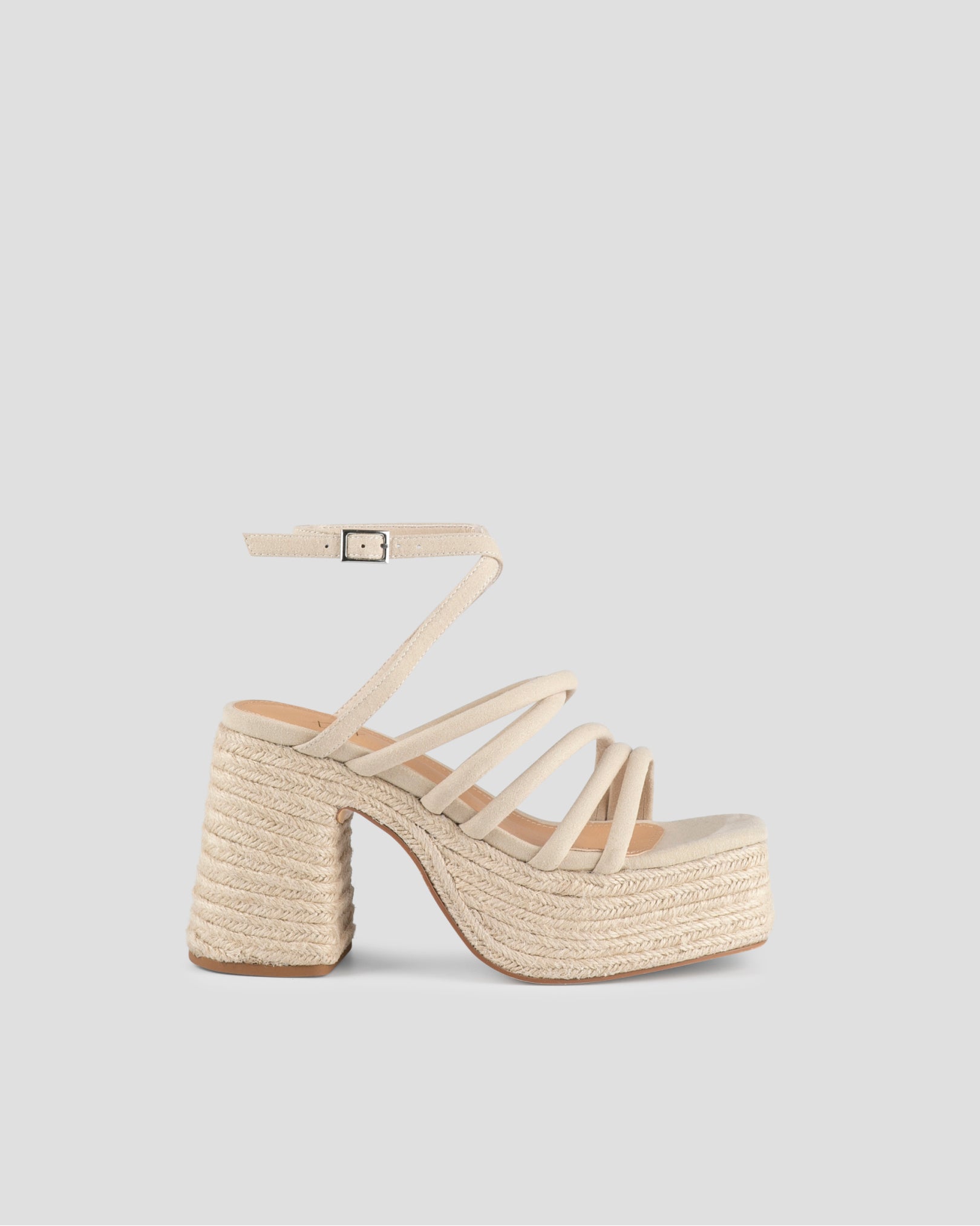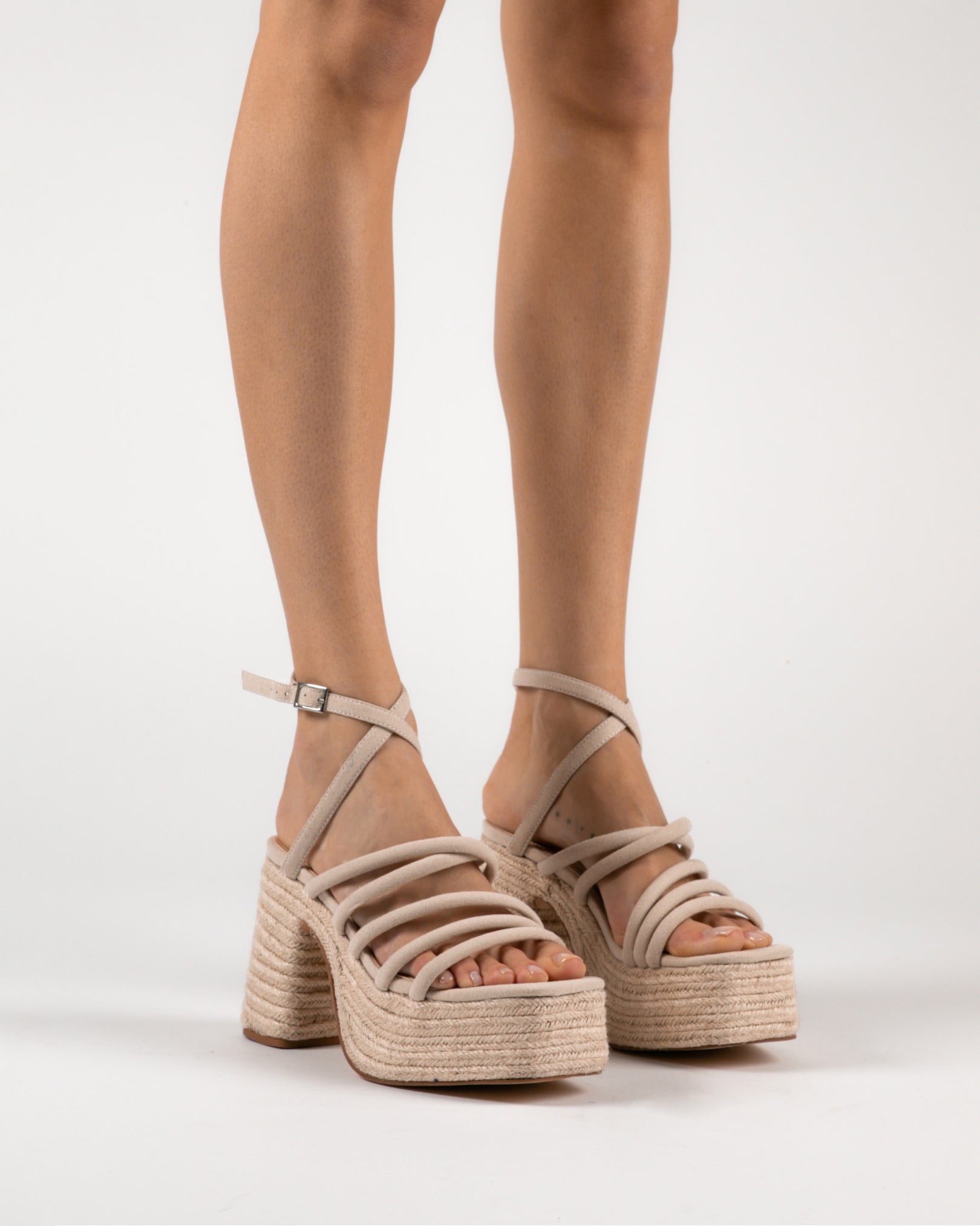 Sandalia de tacón con plataforma de esparto en piel vegana color ecru. Varias tiras a lo largo de toda la parte frontal y tira superior para cierra en tobilo con hebilla.