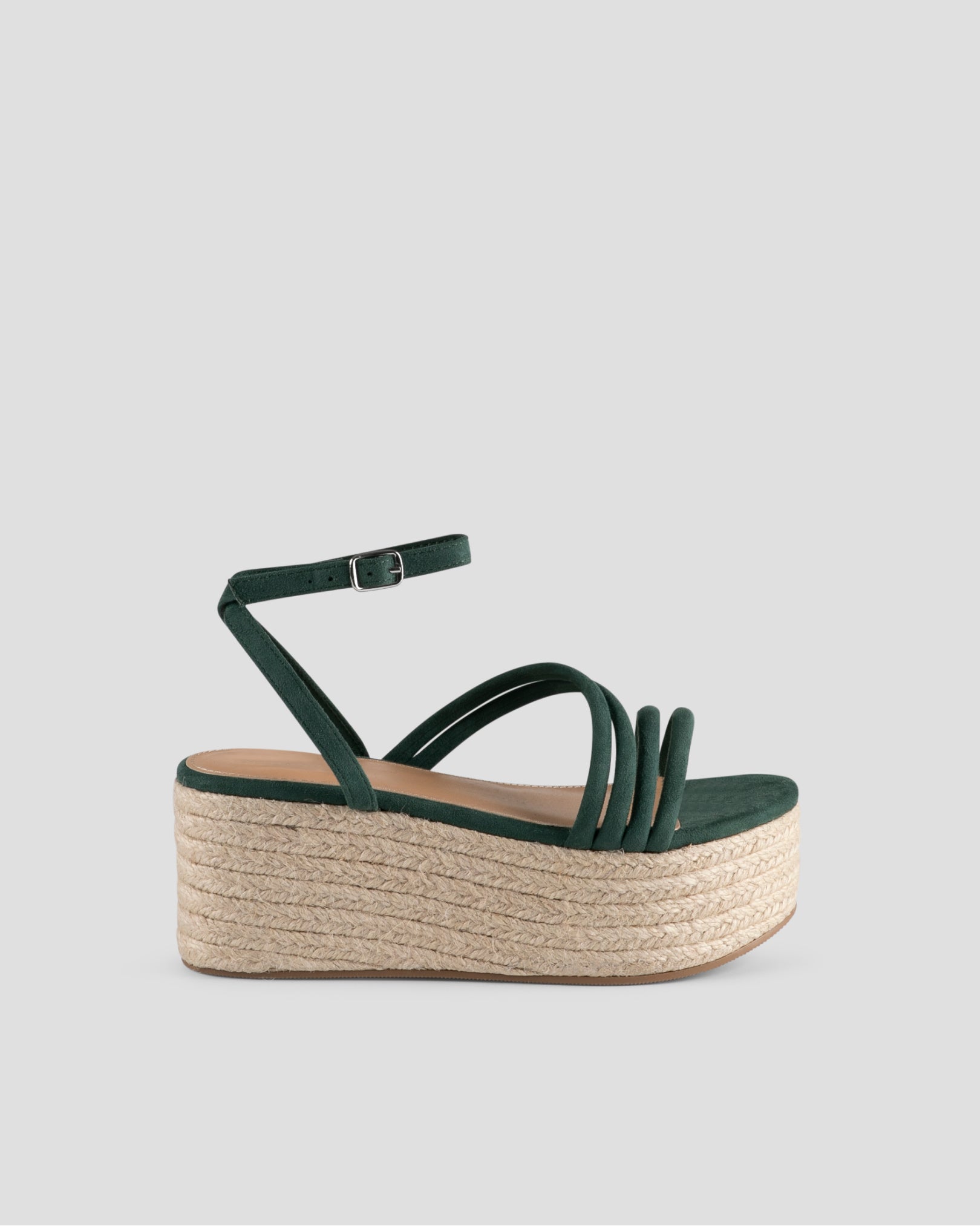 Sandalia de tiras en ante vegano en color aguamarina con plataforma de esparto. Tiras tubulares en la parte delantera y planas en la trasera, para sujección en tobillo y cierre de hebilla.