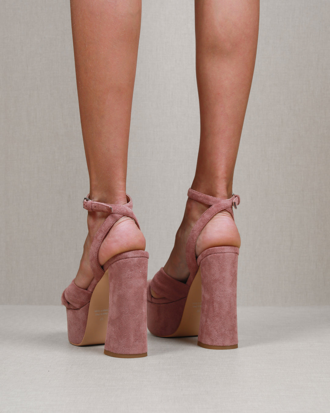 Sandalia de tacón en ante vegano color coral, compuesta de dos tiras delanteras unidas por un nudo y dos tiras traseras para atar en el tobillo.