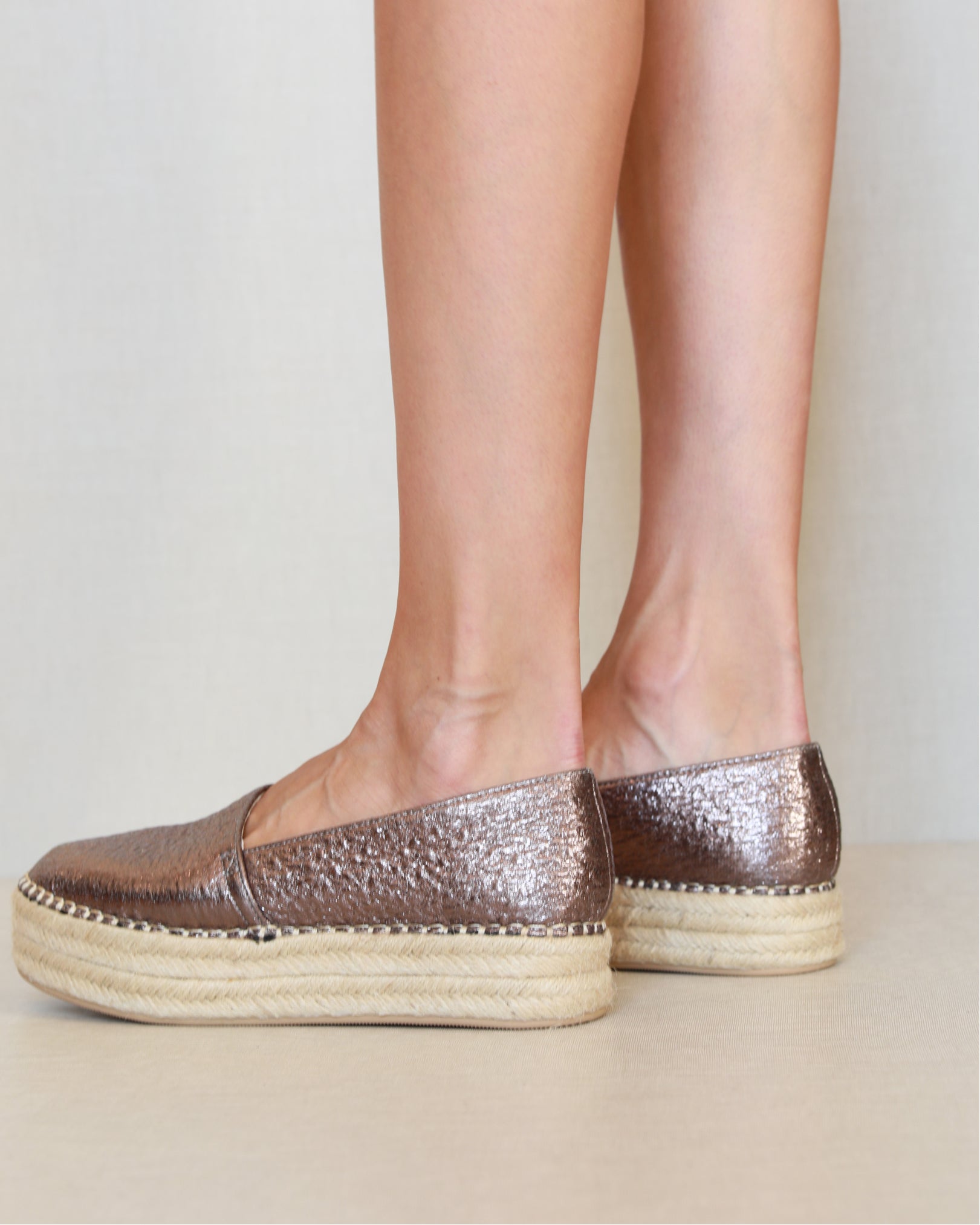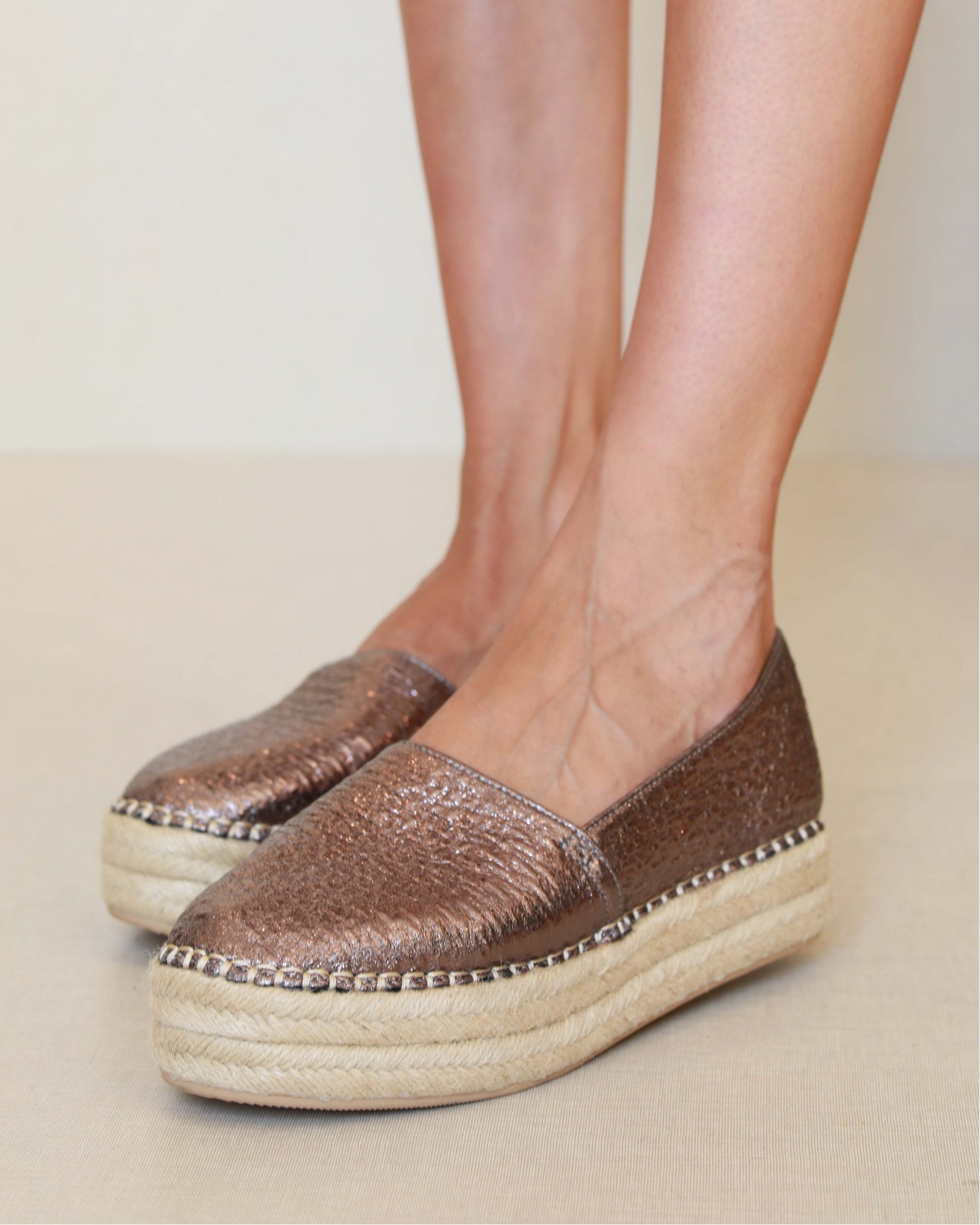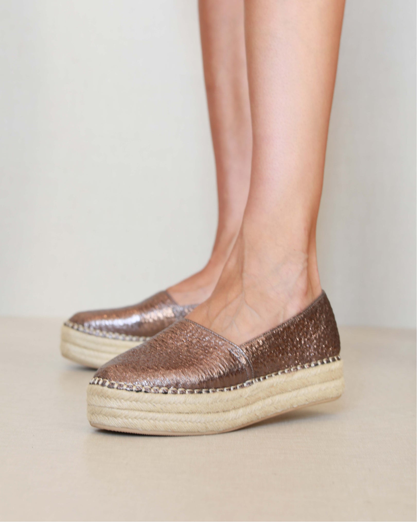 Alpargata cerrada con doble suela de esparto y textil color plata rosado.