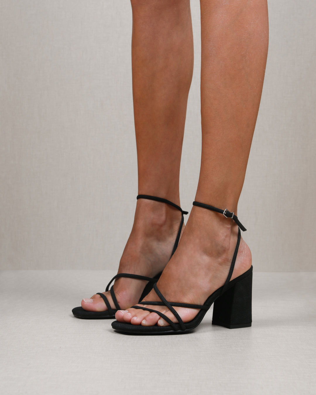 Sandalia de tacón en ante vegano negro con tiras en la parte superior y atada en el tobillo por la parte trasera.
