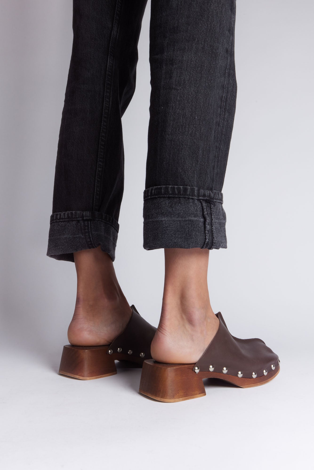Zueco en piel color marrón. Plataforma de madera y detalles con tachuelas en plateado.