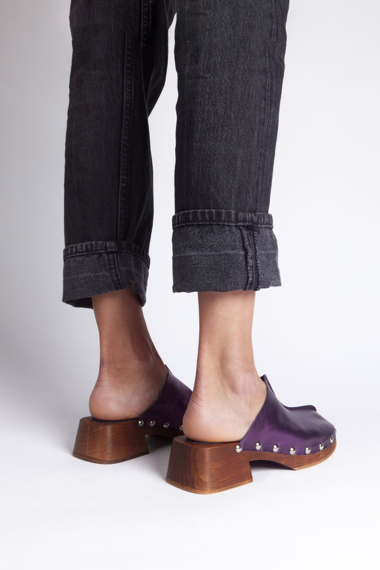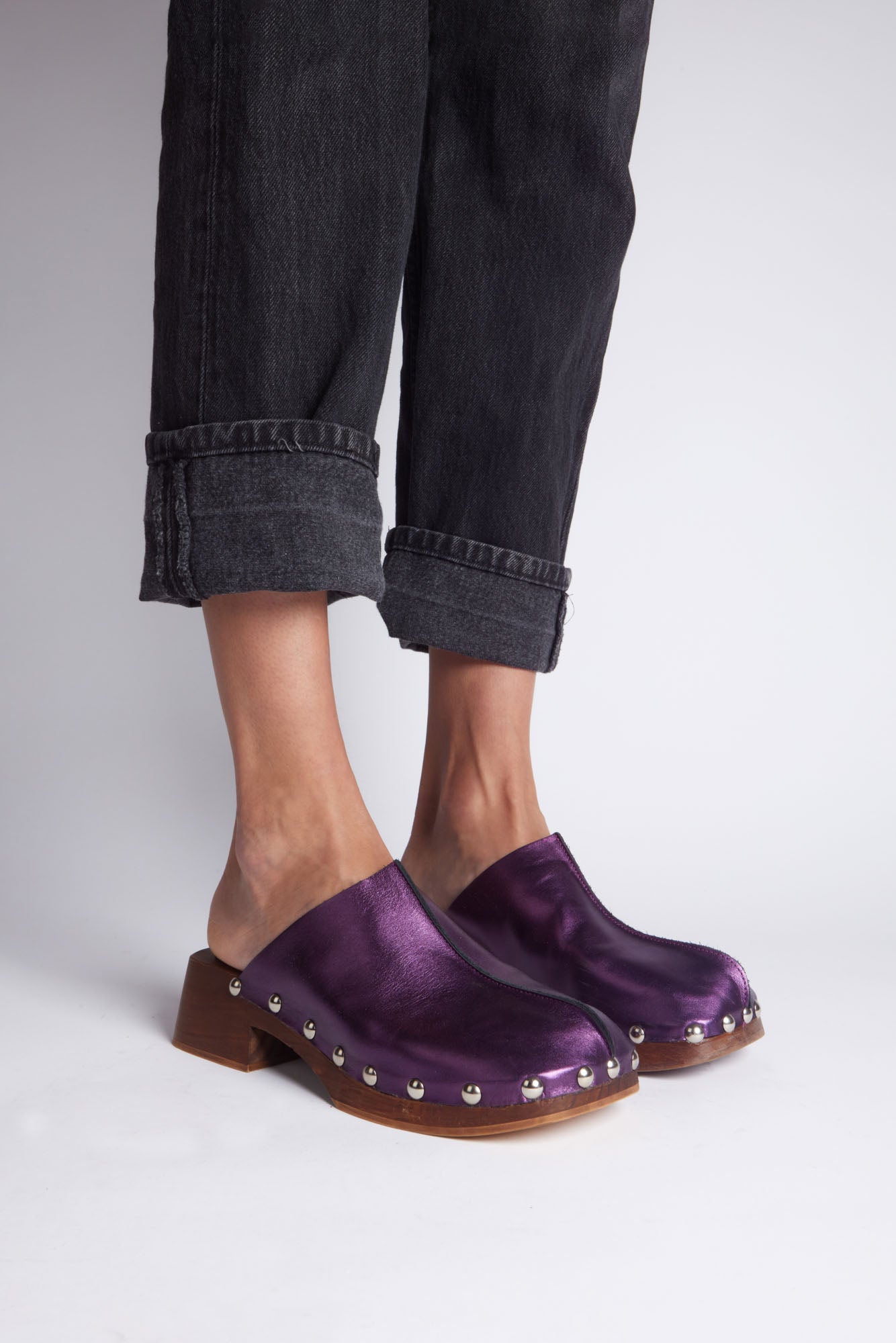 Zueco en piel color morado metalizado. Plataforma de madera y detalles con tachuelas en plateado.