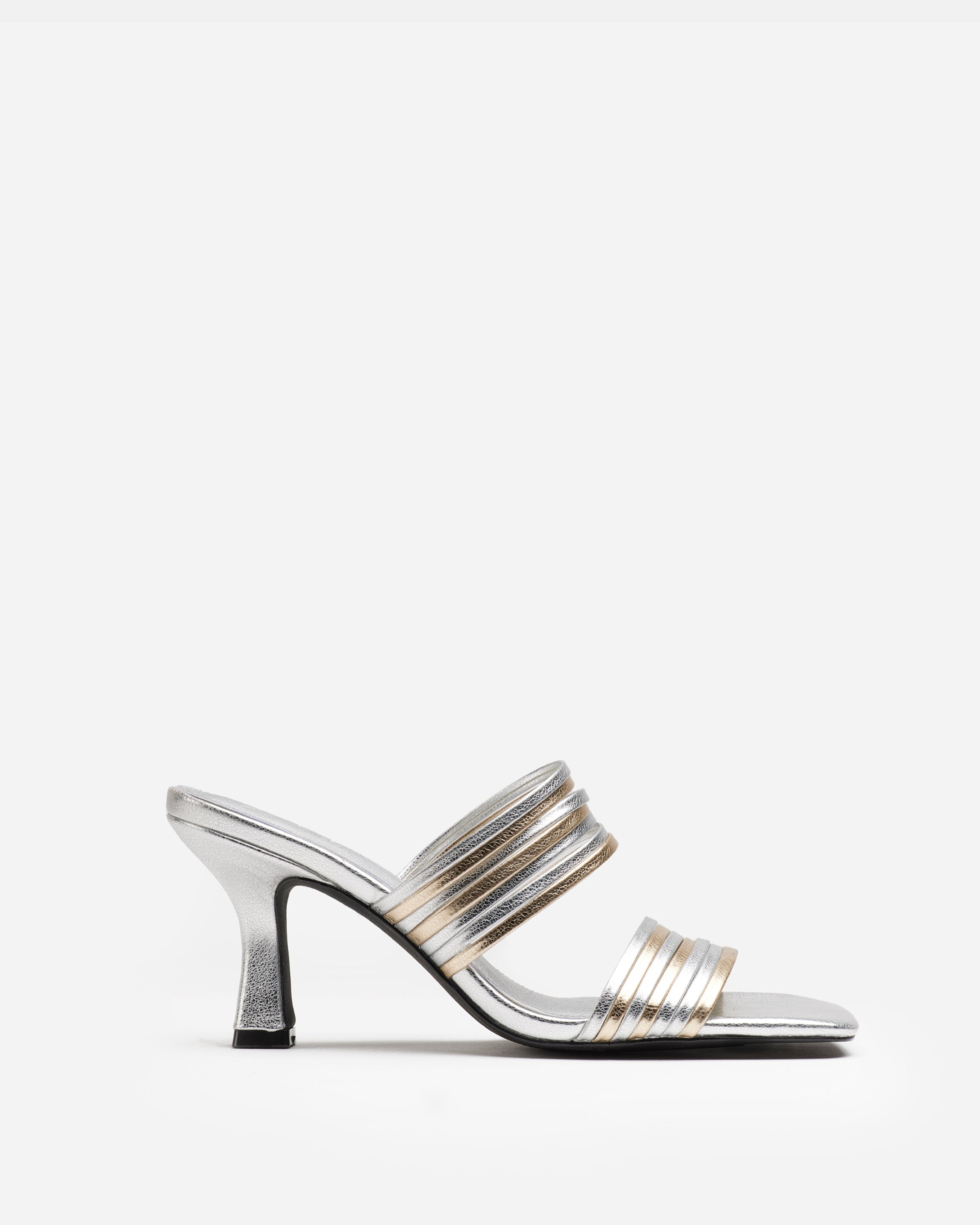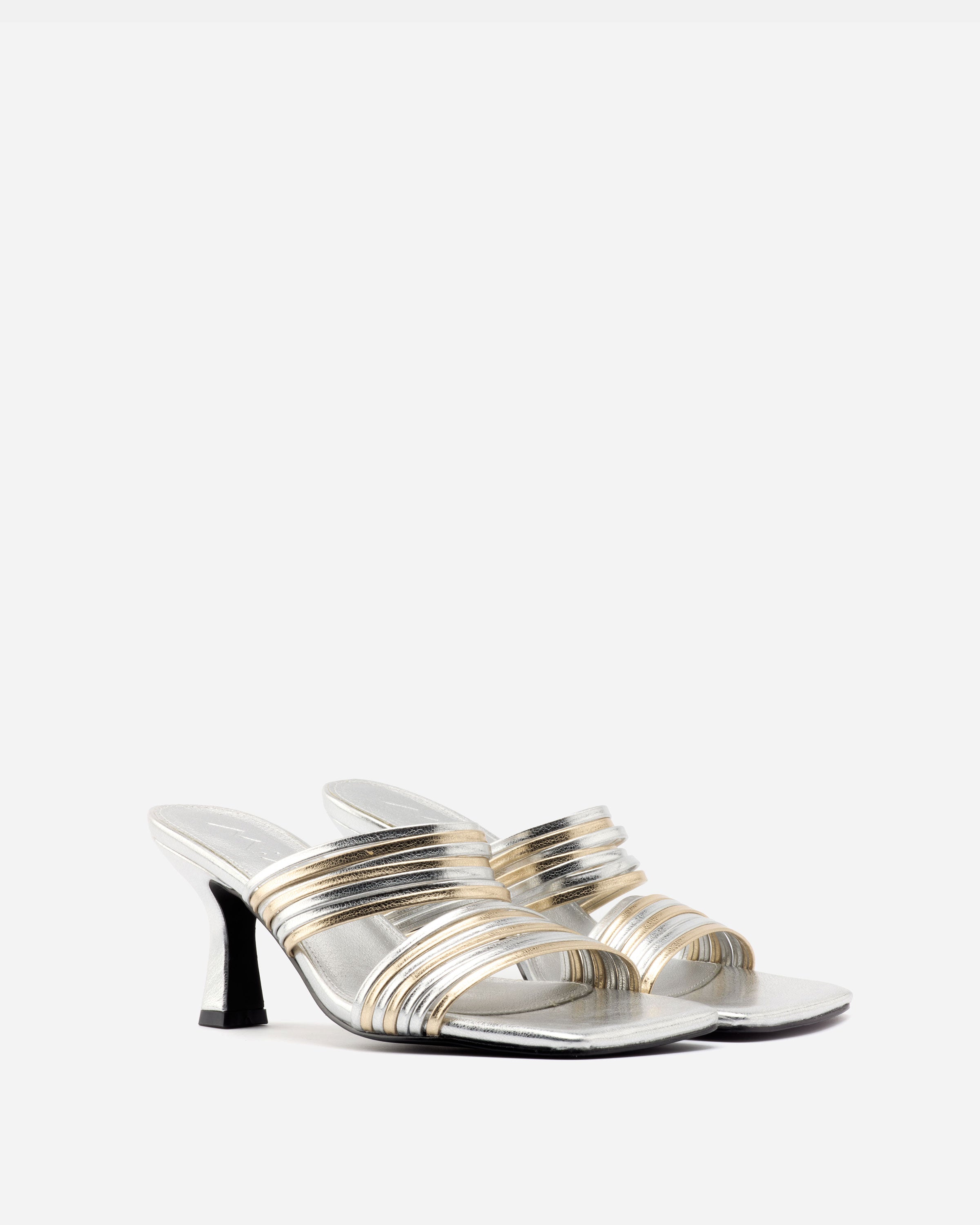 Sandalia de tacon fino geometrico en color plata y dorado. Compuesto por dos franjas de tiras finas en estos dos colores.