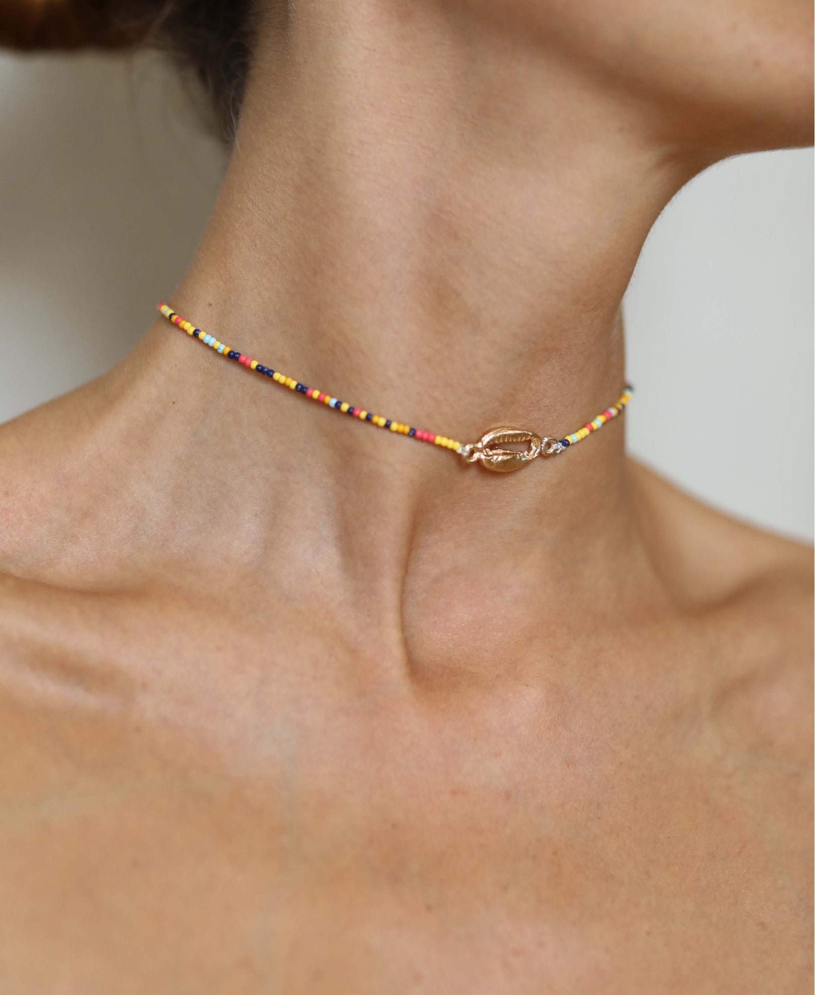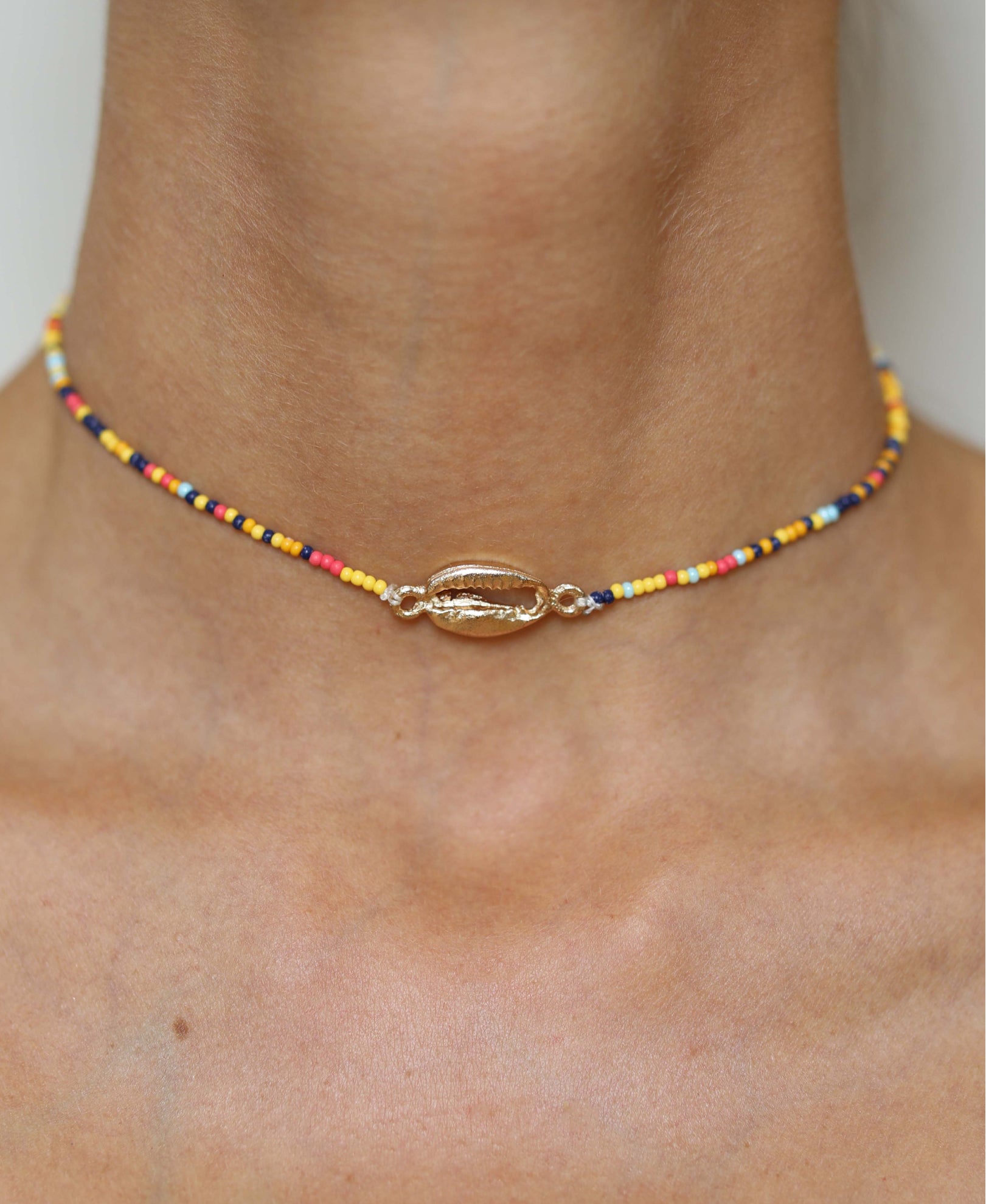 Gargantilla de abalorios en diferentes colores, con una concha dorada en la parte central. Cierre ajustable.