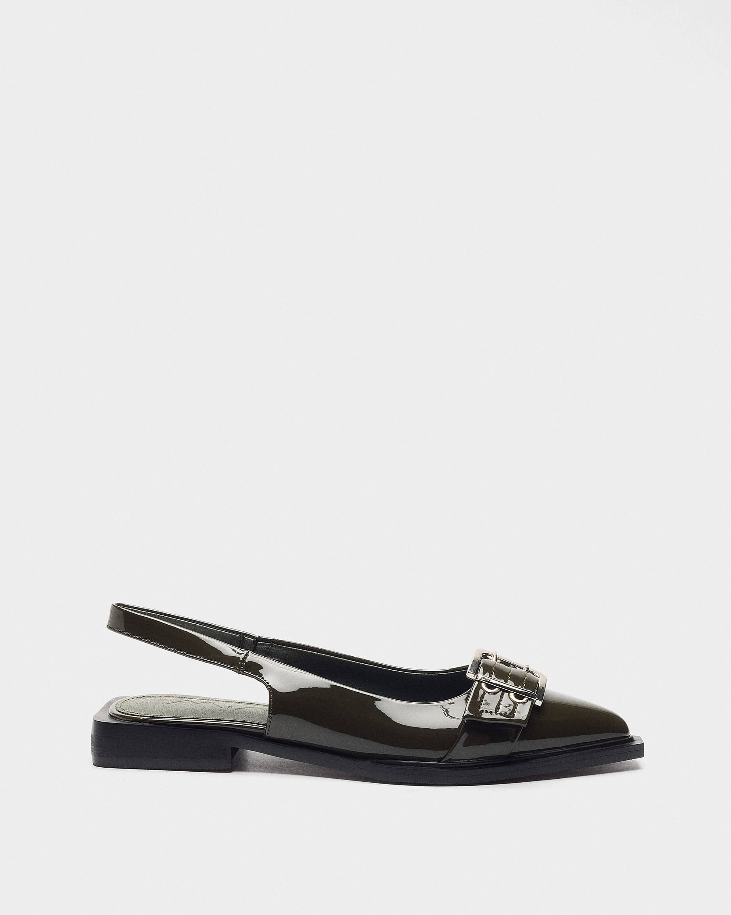 Zapato cerrado efecto charol en punta.Parte trasera destalonada en color kaki.