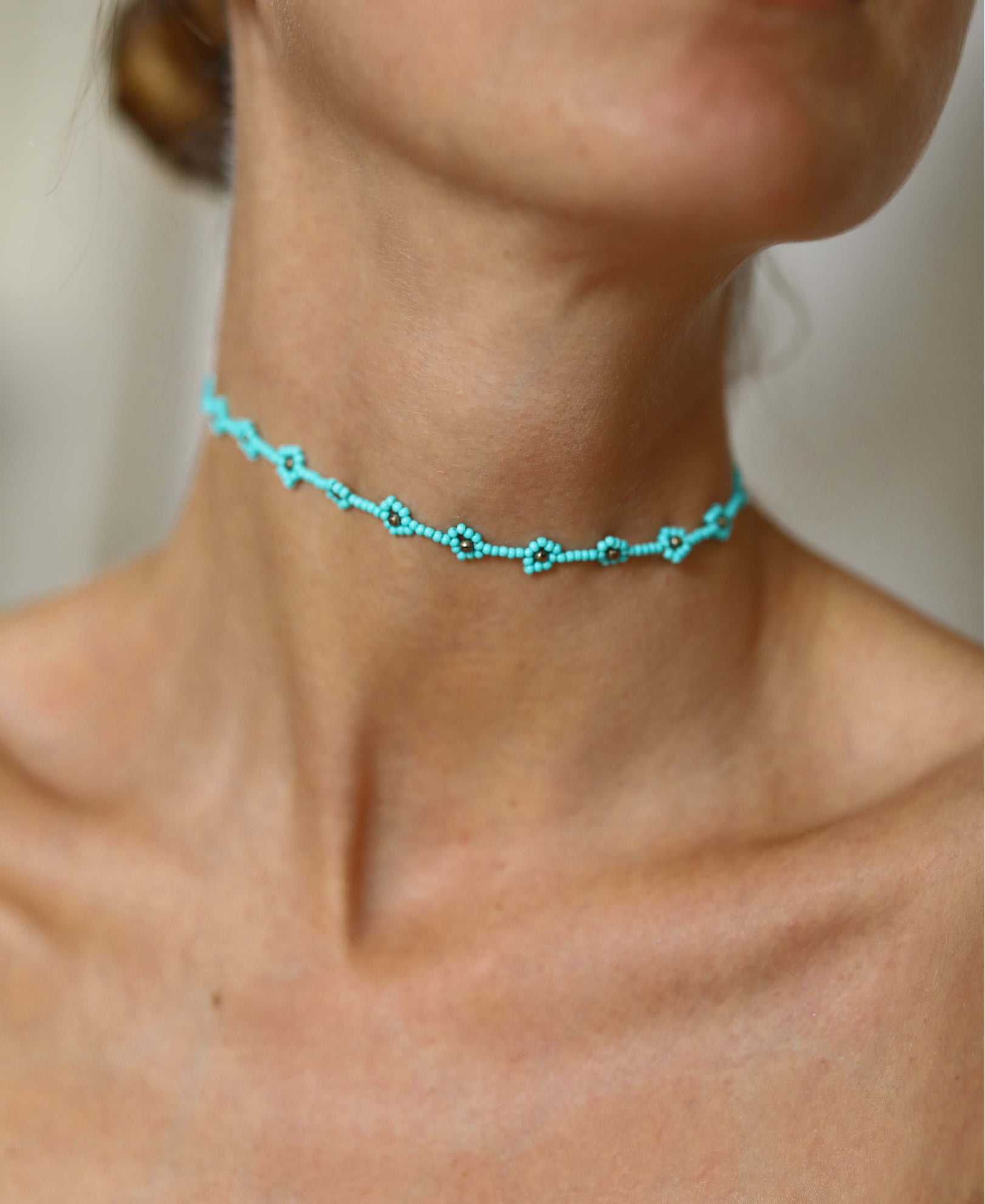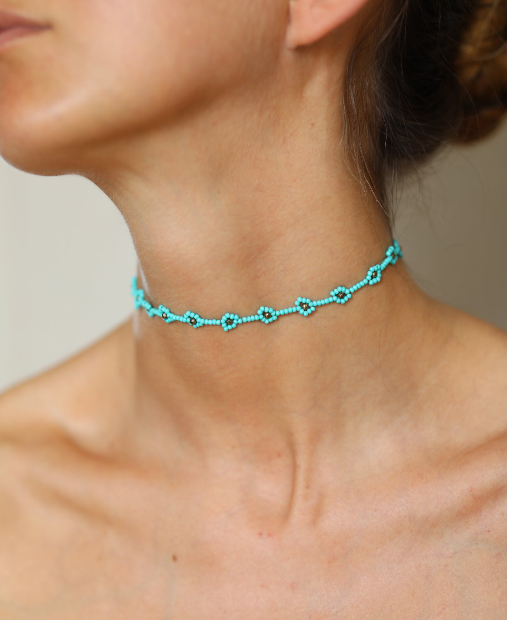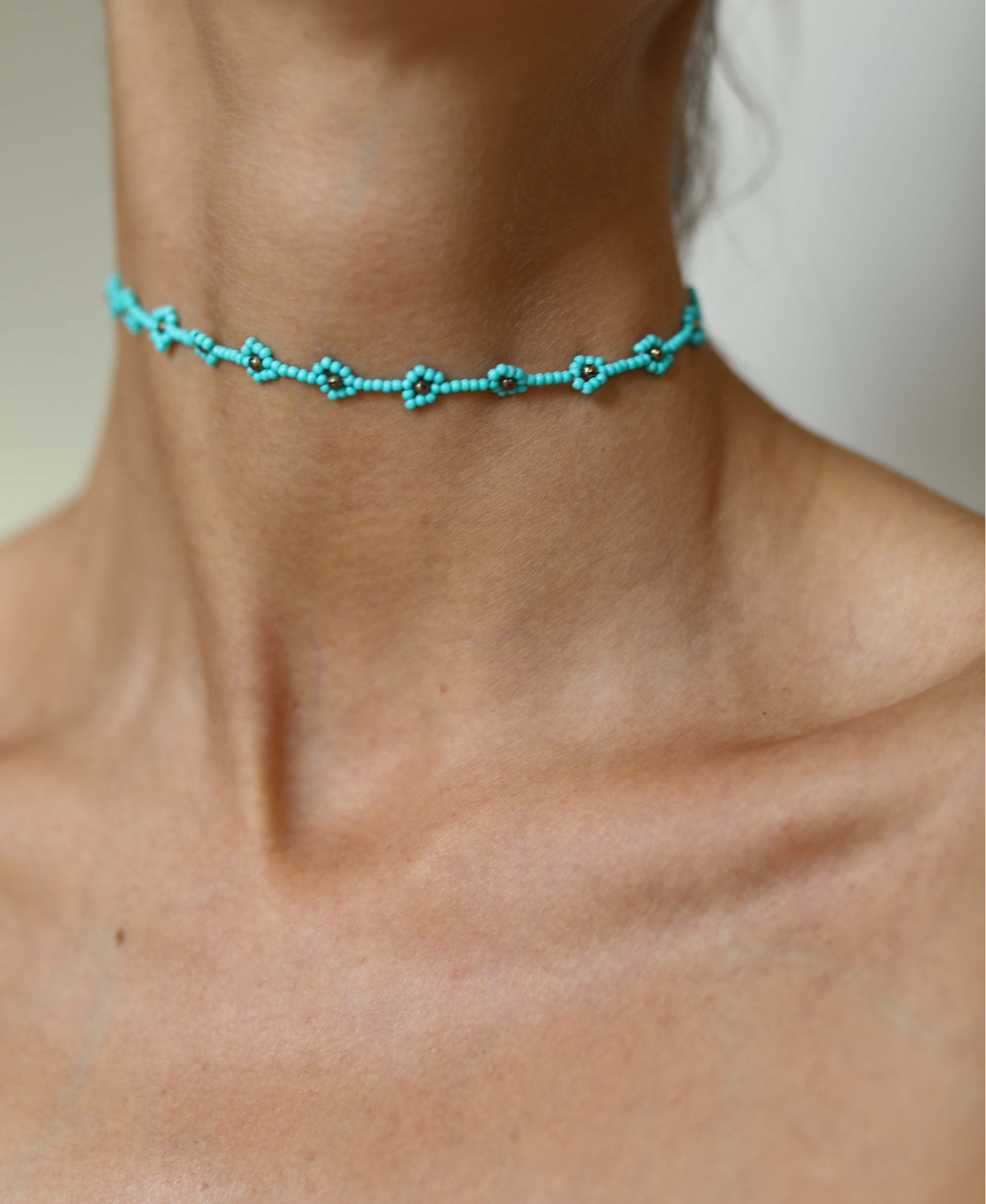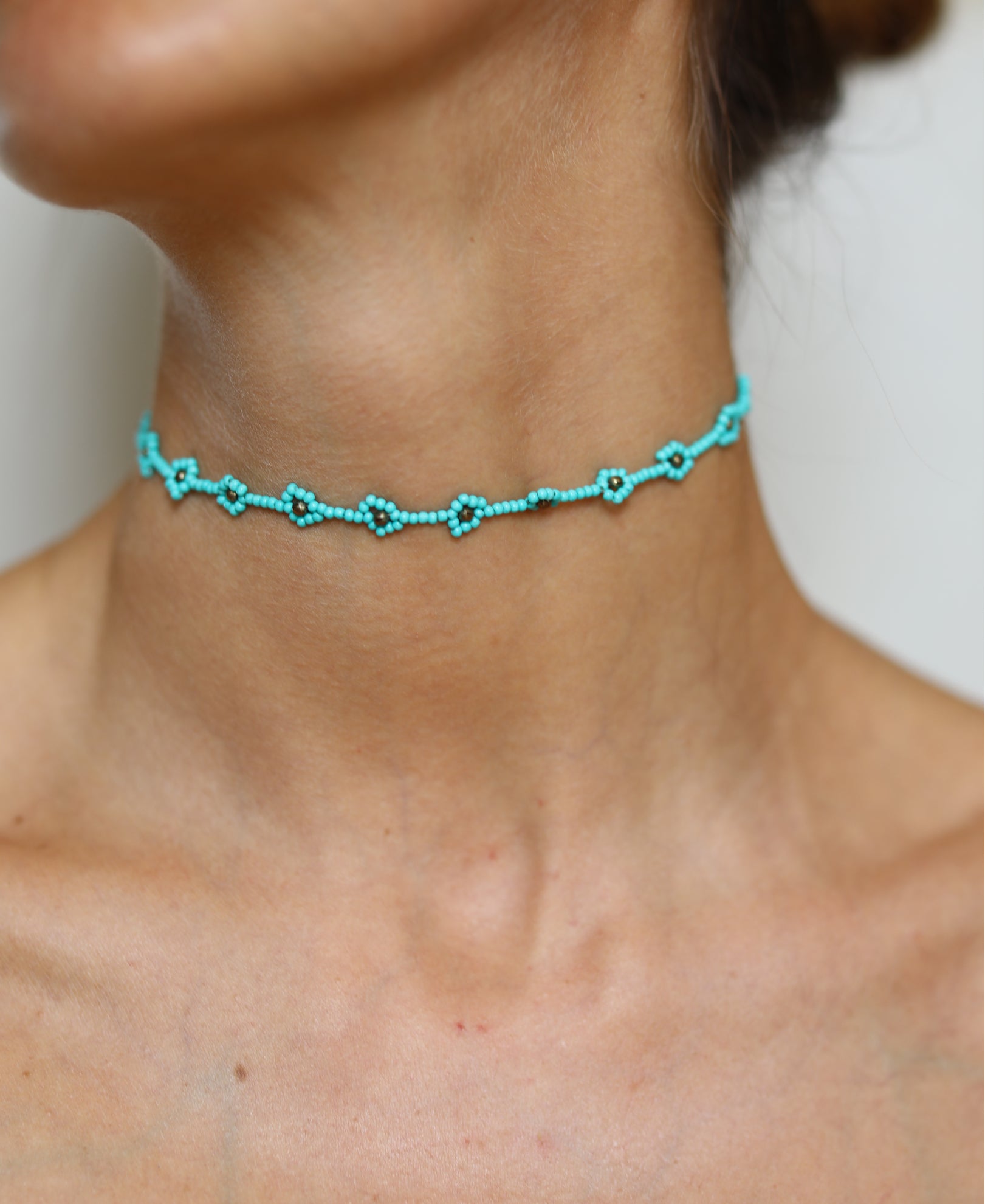 Gargantilla de abalorios con florecitas en tono turquesa. Cierre trasero con abalorios.