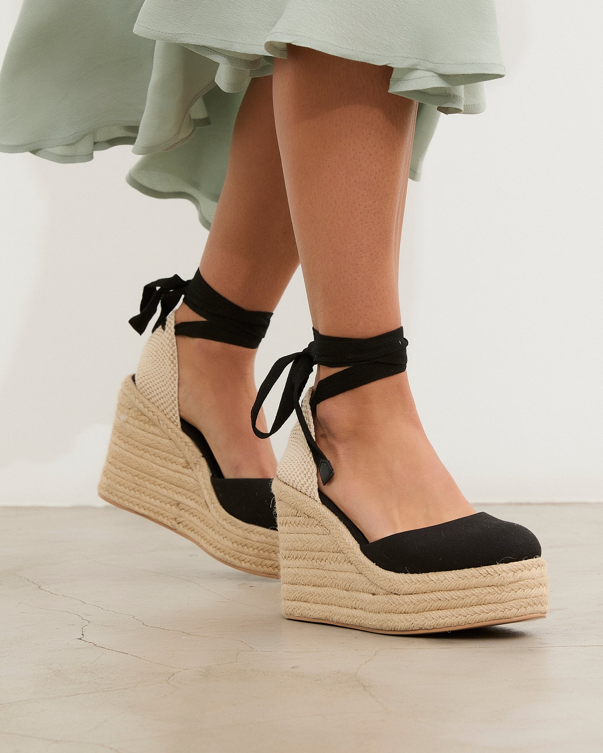 Plataforma alta de esparto en canvas color negro. Parte delantera cerrada y cinta para anudar al tobillo.
