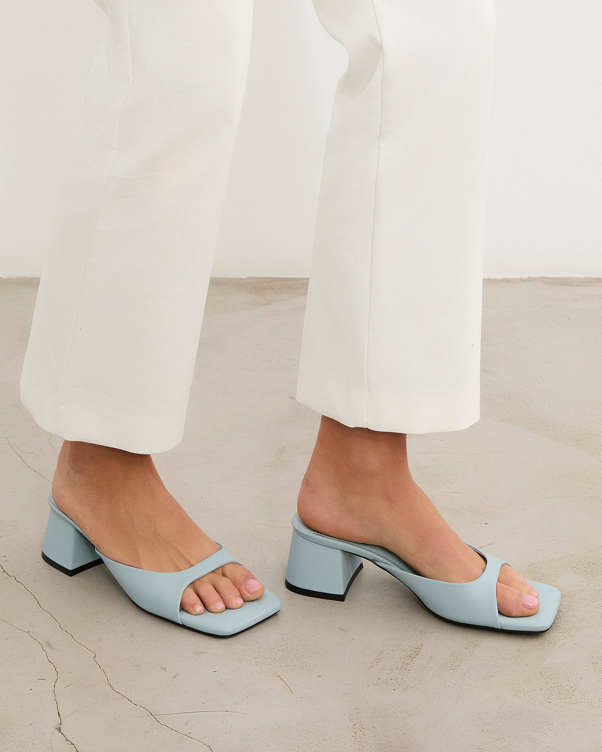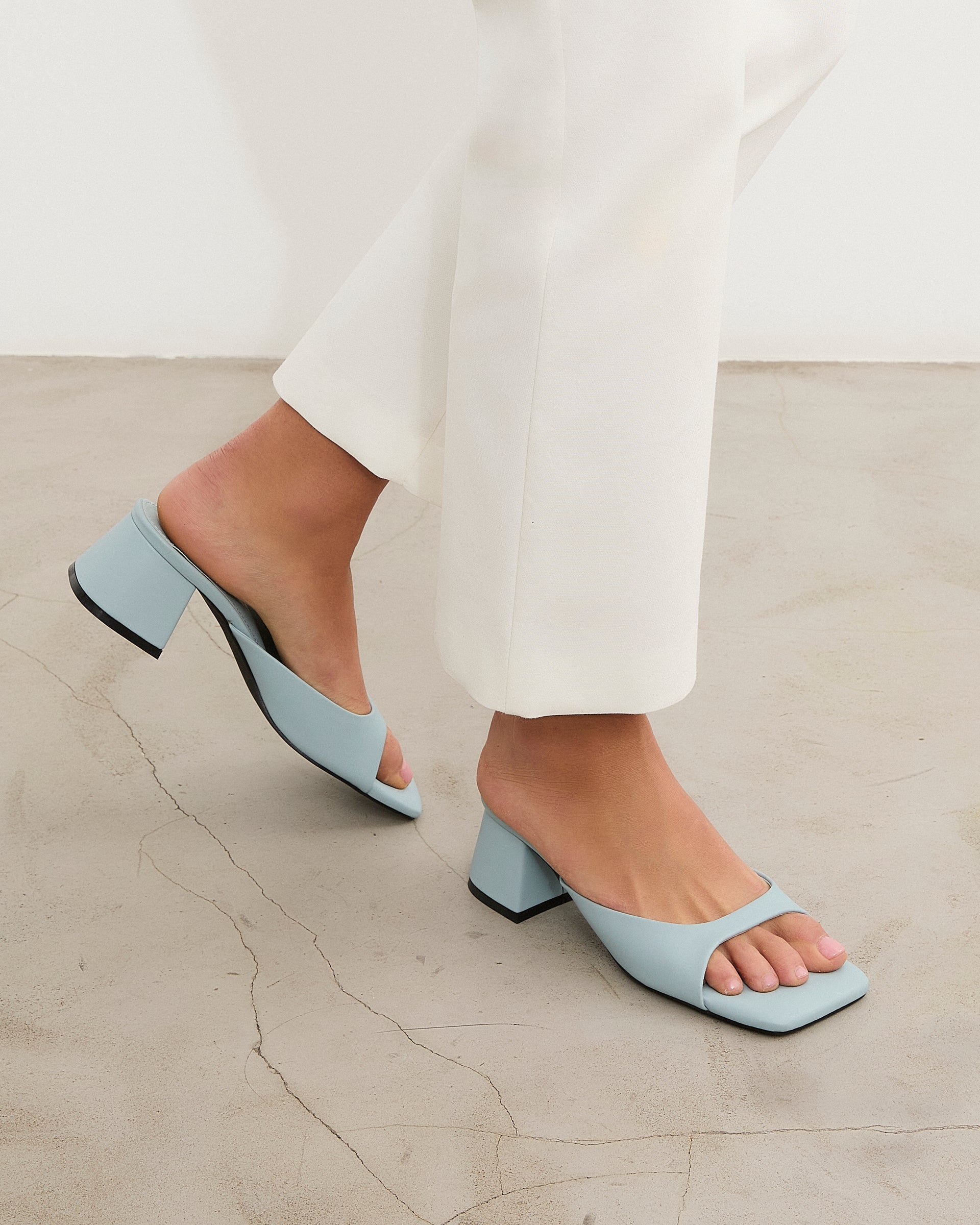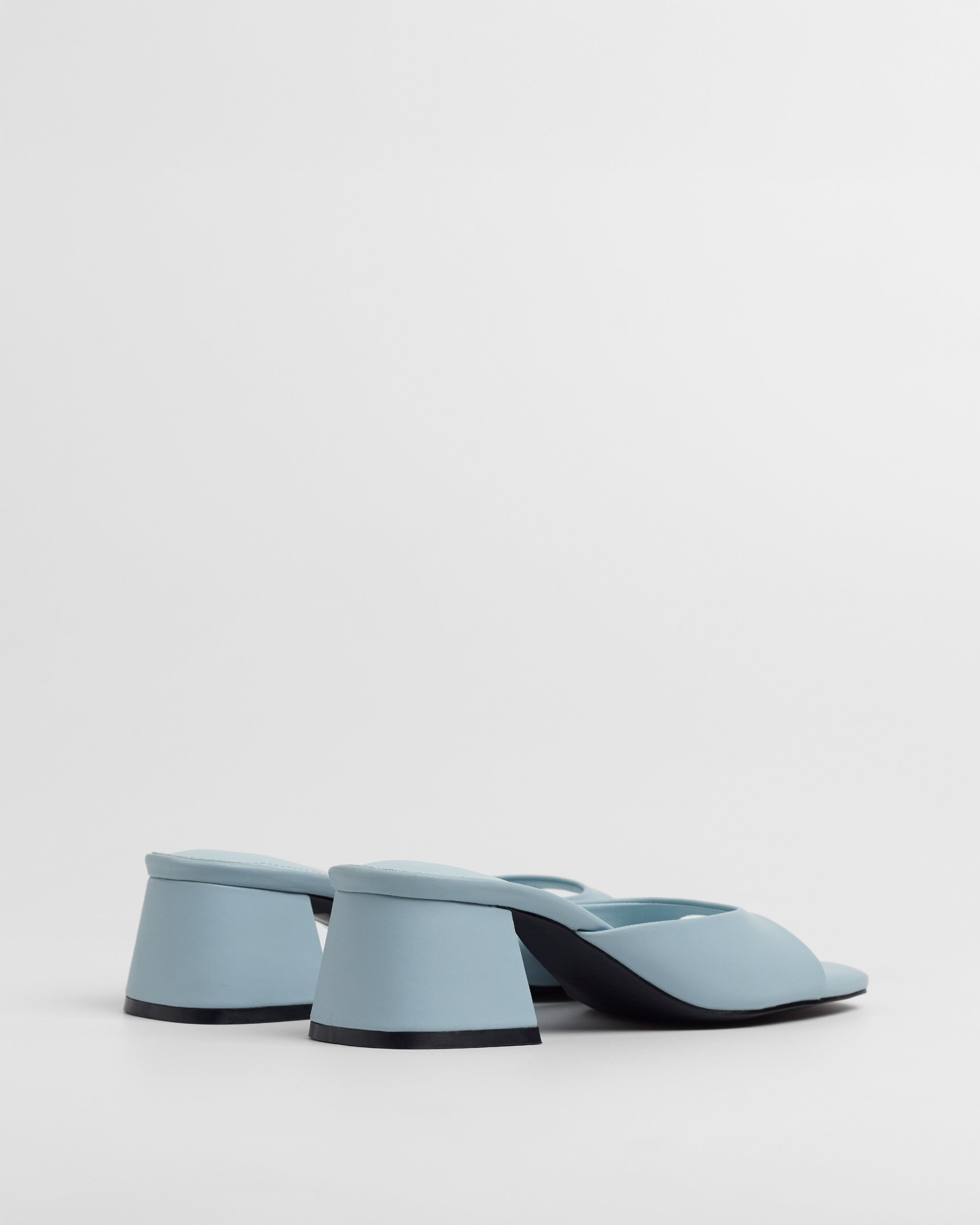 Sandalia de tacón tipo mule con puntera cuadrada en color celeste. Tira delantera envolvente en laterales. Tacón cuadrado bajo.