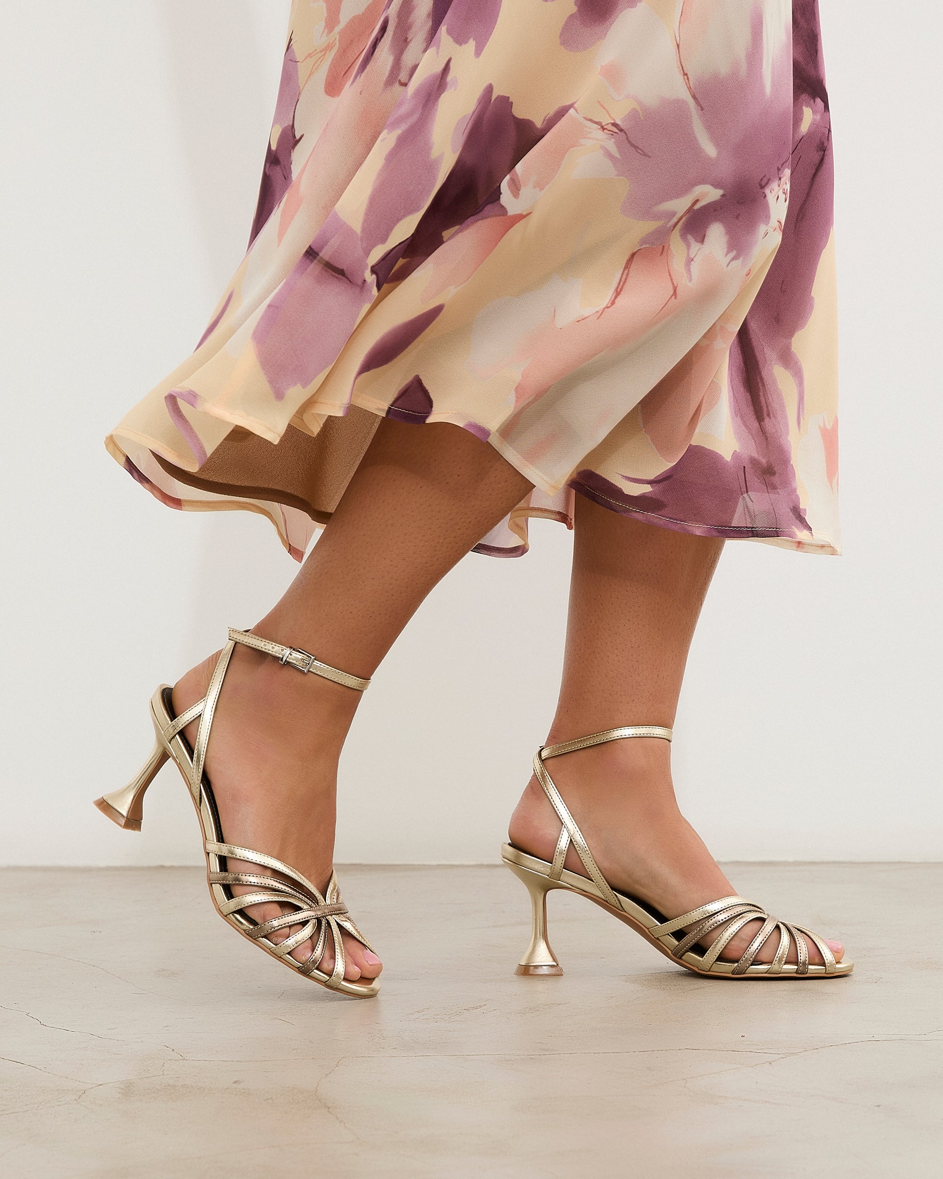 Sandalia de tacón con punta redondeada en color dorado. Parte delantera formada por multiples tiras unidadas por otra tira central. Tira trasera para cierre en tobillo con hebilla. Tacón de aguja fino con base ancha.
