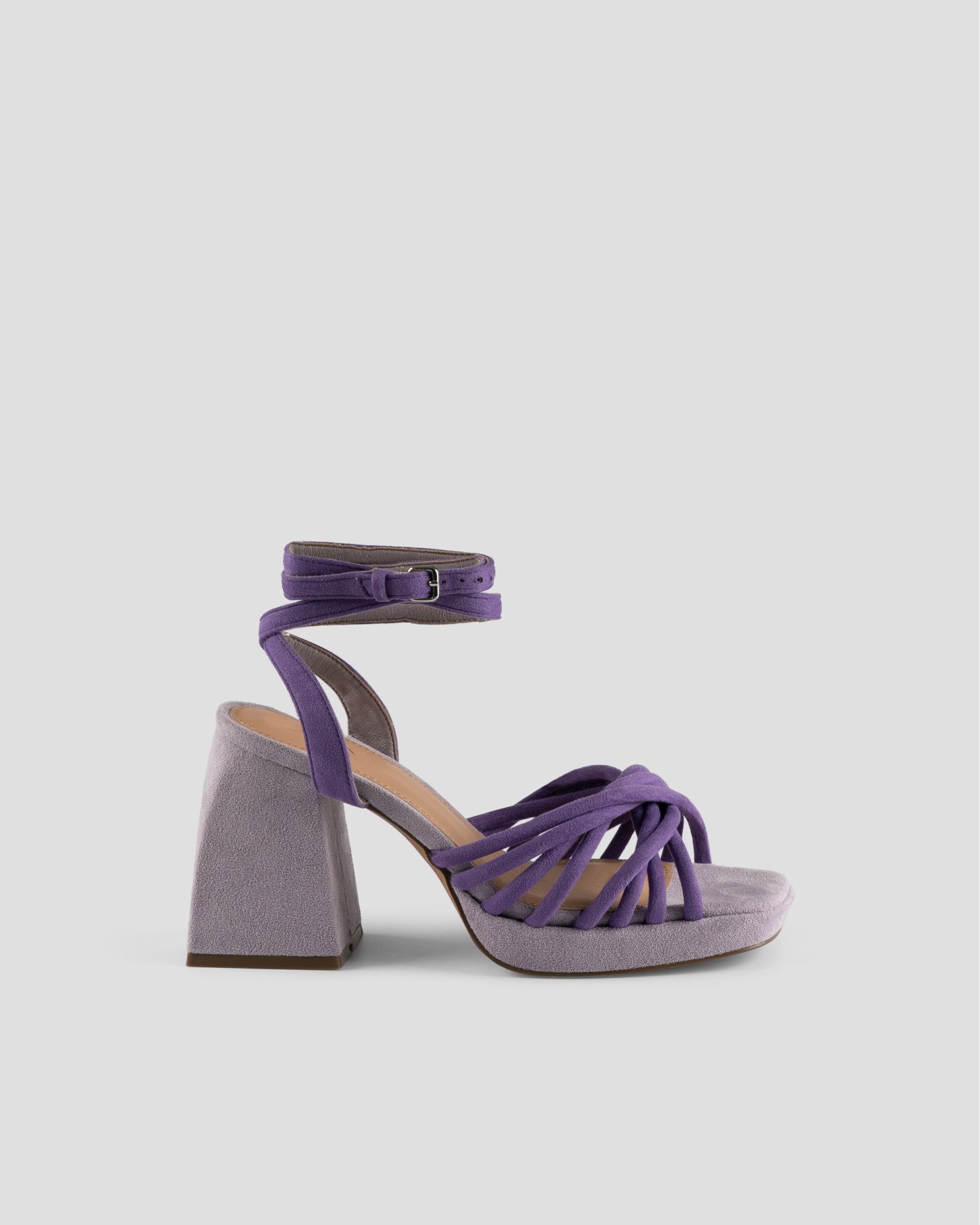 Sandalia de tacón en ante vegano color malva. Parte delantera abierta cuadrada con plataforma y varias tiras delanteras. Cierre de tiras al tobillo con hebilla metálica.