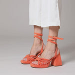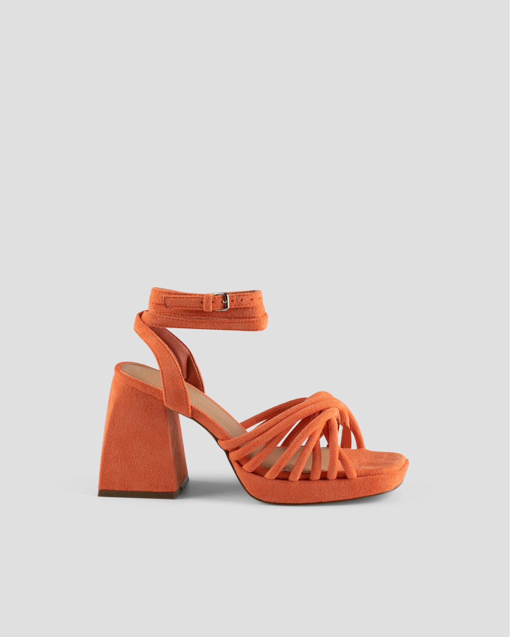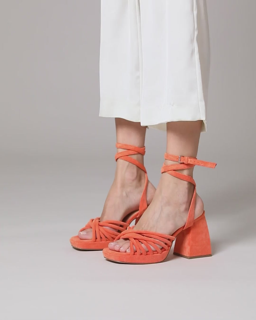 Sandalia de tacón en ante vegano color naranja. Parte delantera abierta cuadrada con plataforma y varias tiras delanteras. Cierre de tiras al tobillo con hebilla metálica.