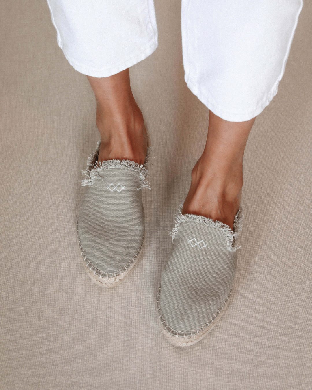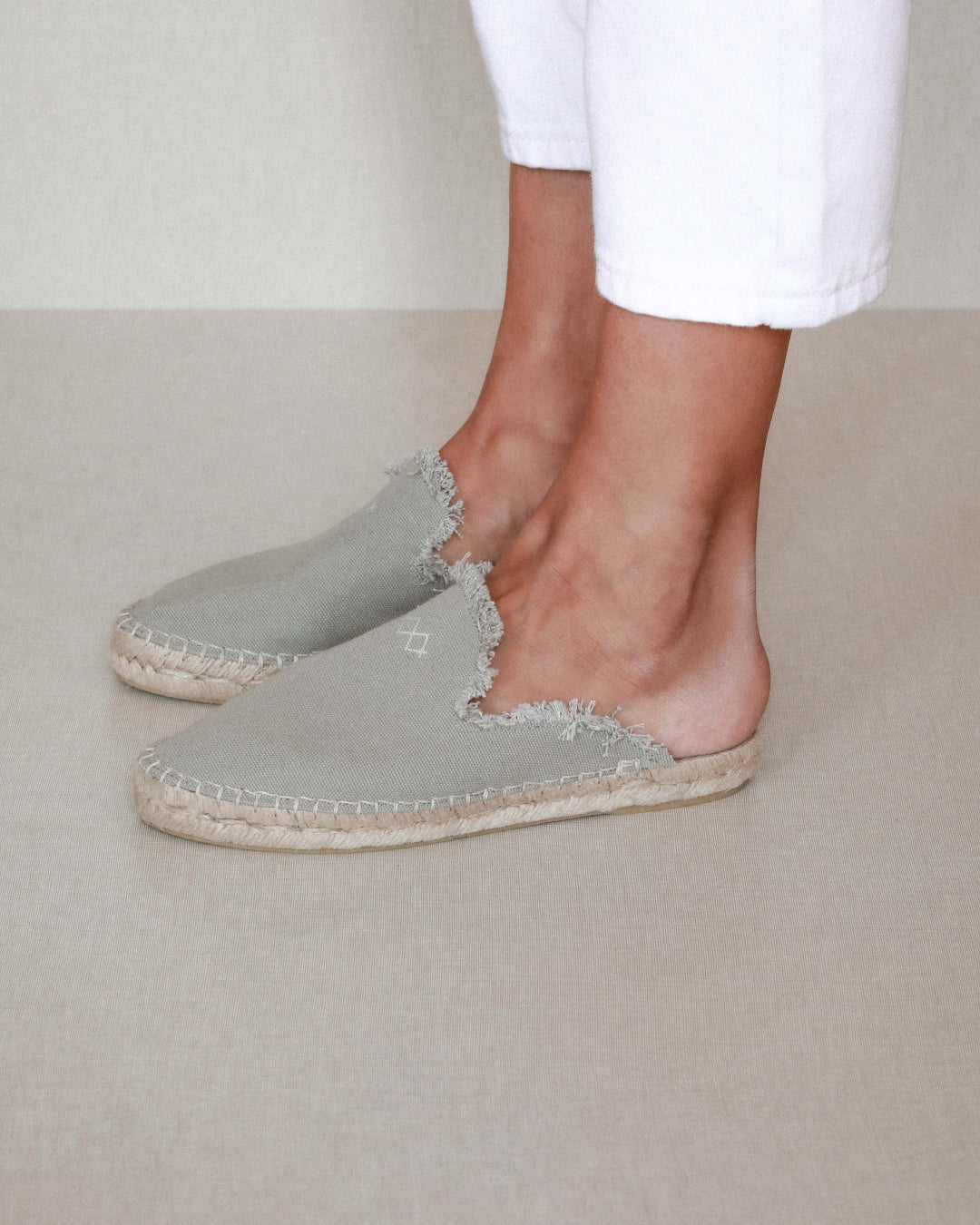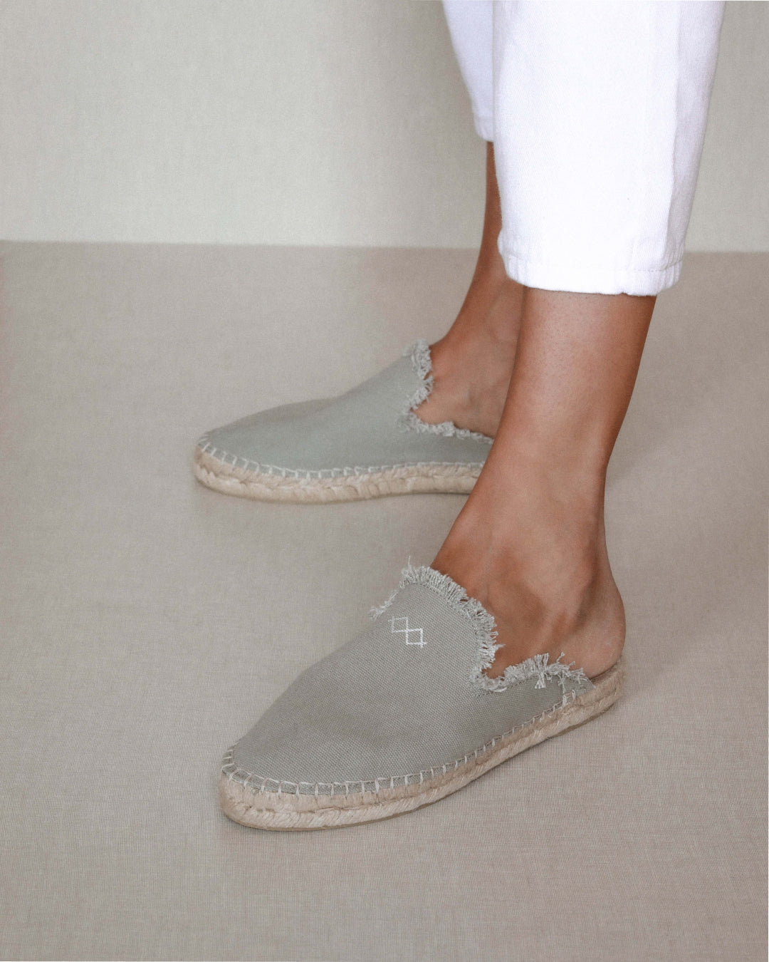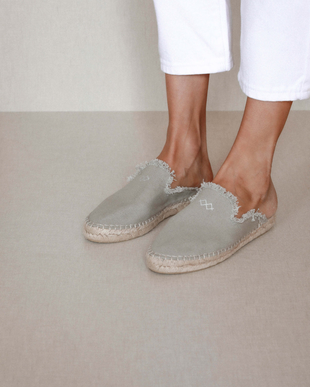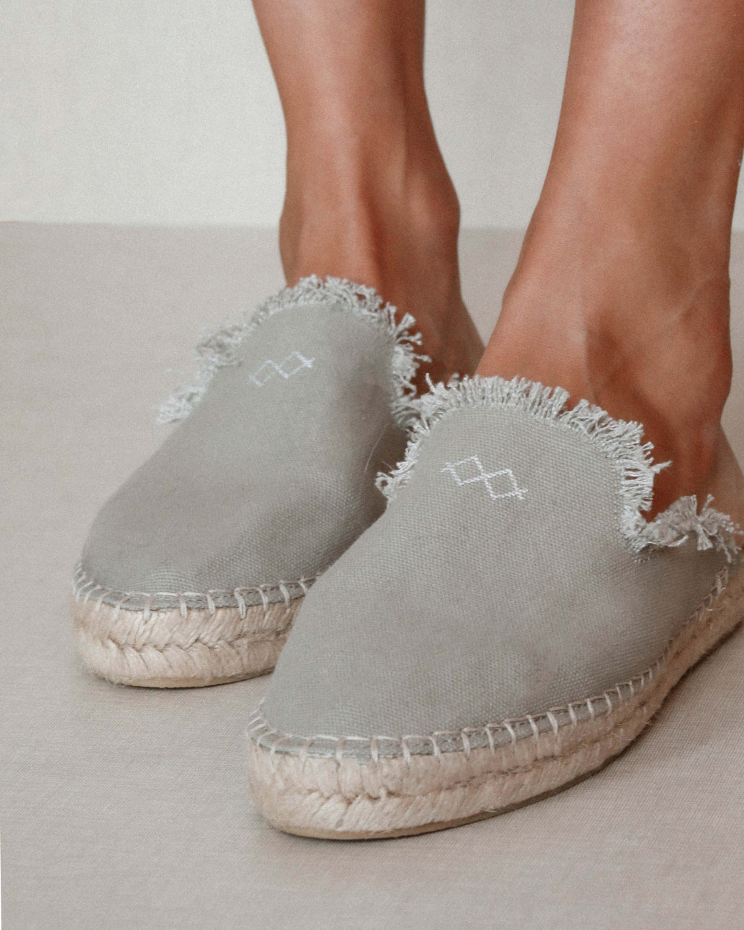 Alpargata plana de napa, destalonada de color gris con suela de esparto.