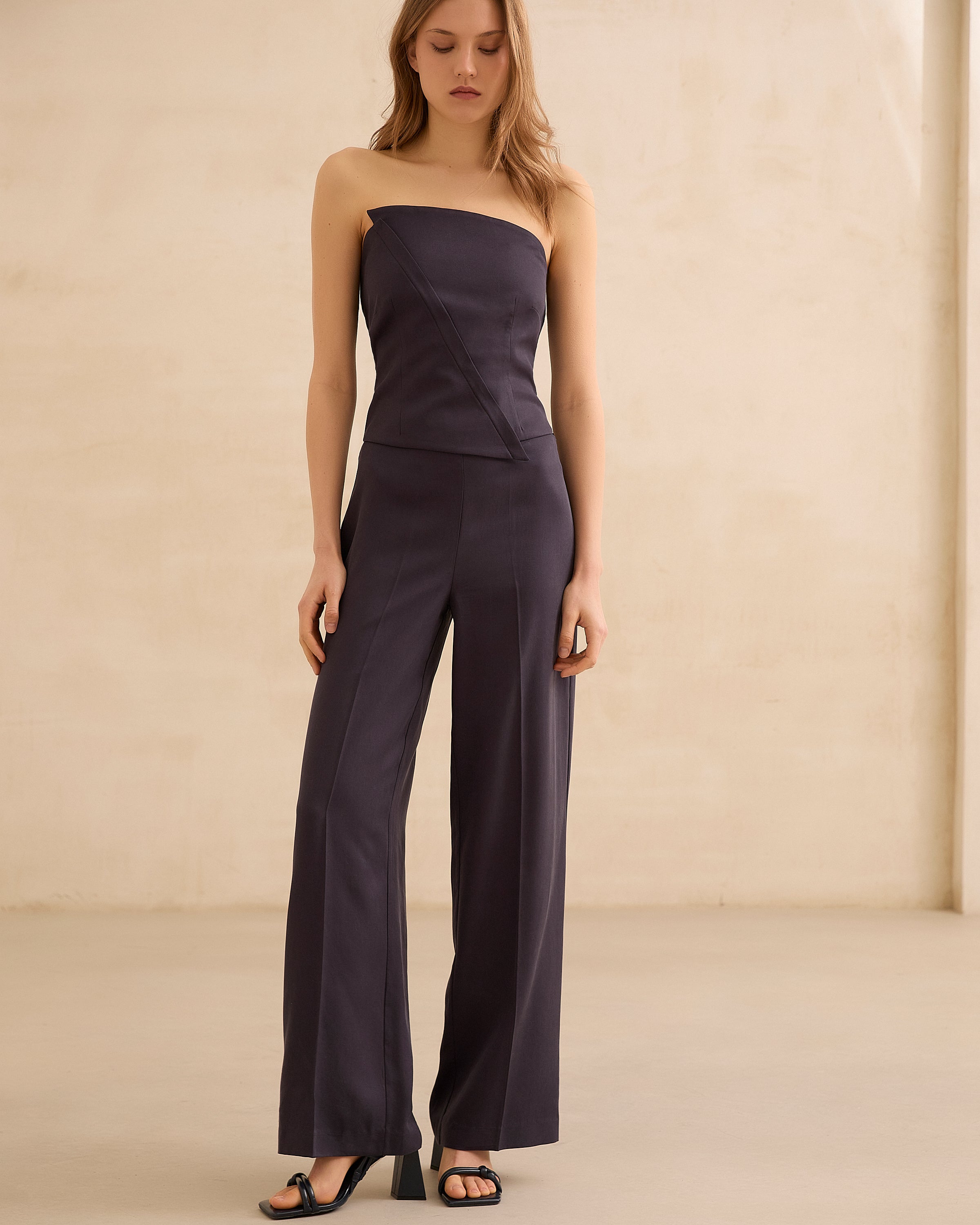 Pantalón recto de tiro medio en tejido fluido azul marino. Pierna ancha larga y cremallera lateral invisible.