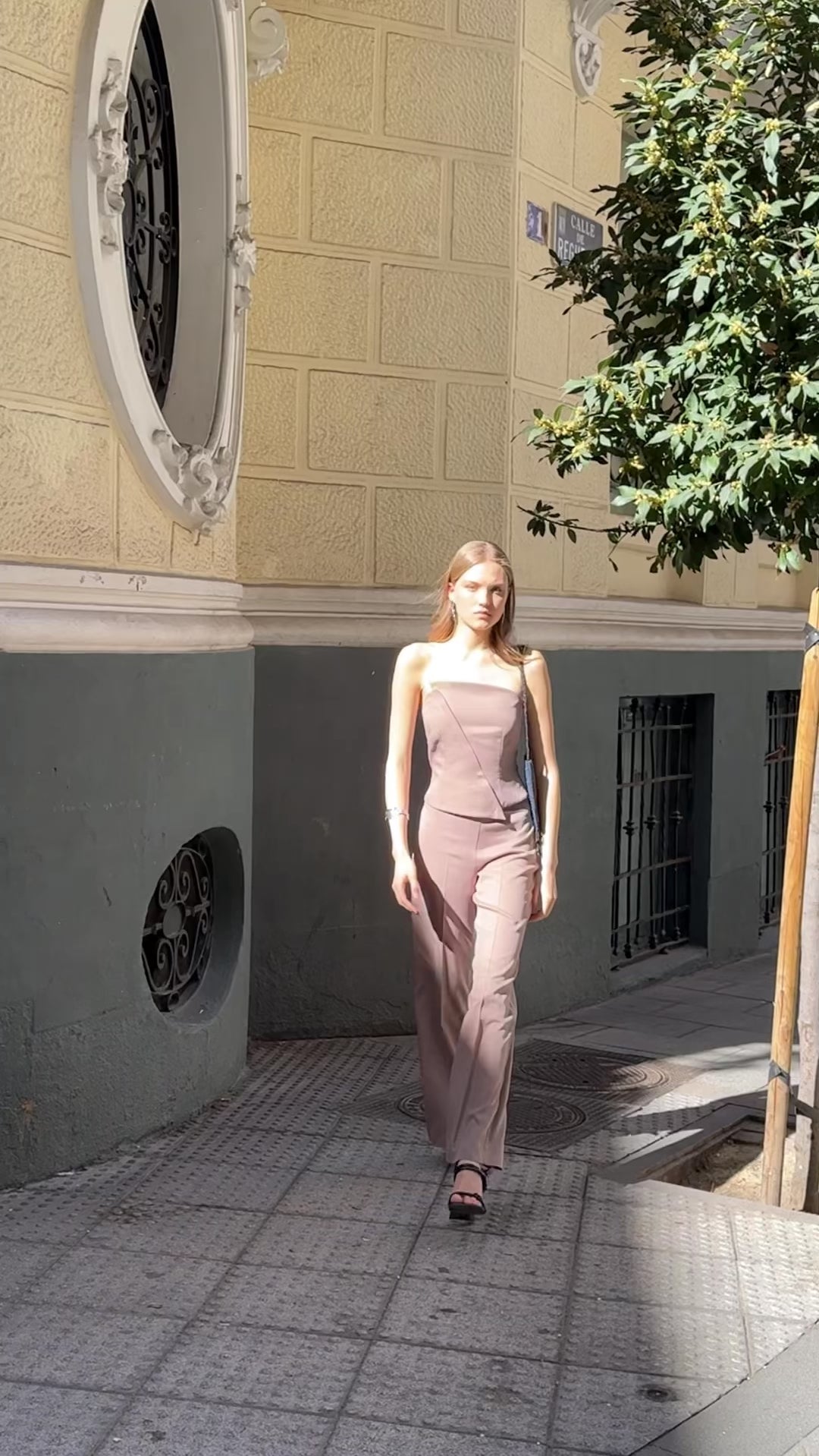 Pantalón recto de tiro medio en tejido fluido kaki. Pierna ancha larga y cremallera lateral invisible.