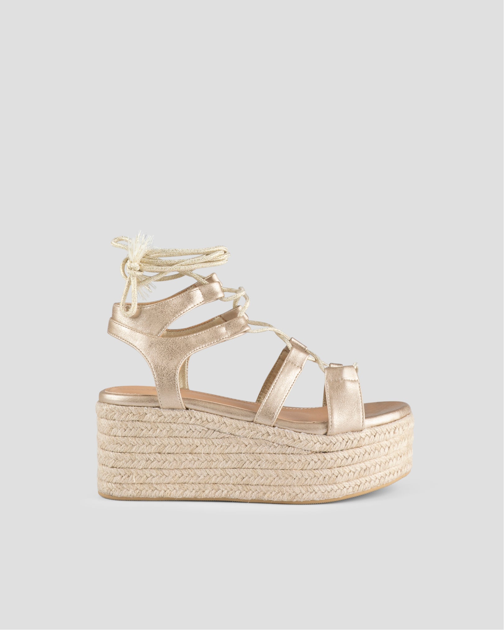 Sandalia con plataforma de esparto. Con tiras de piel vegano color dorado, anudadas al tobillo con cordones a tono.