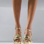 Sandalia de tacón con plataforma dorada. Parte delantera con finas tiras en forma de estrella. Tira trasera y otra por delante del empeine para la sujeción en el tobillo. Cierre con hebilla cuadrada metalizada.