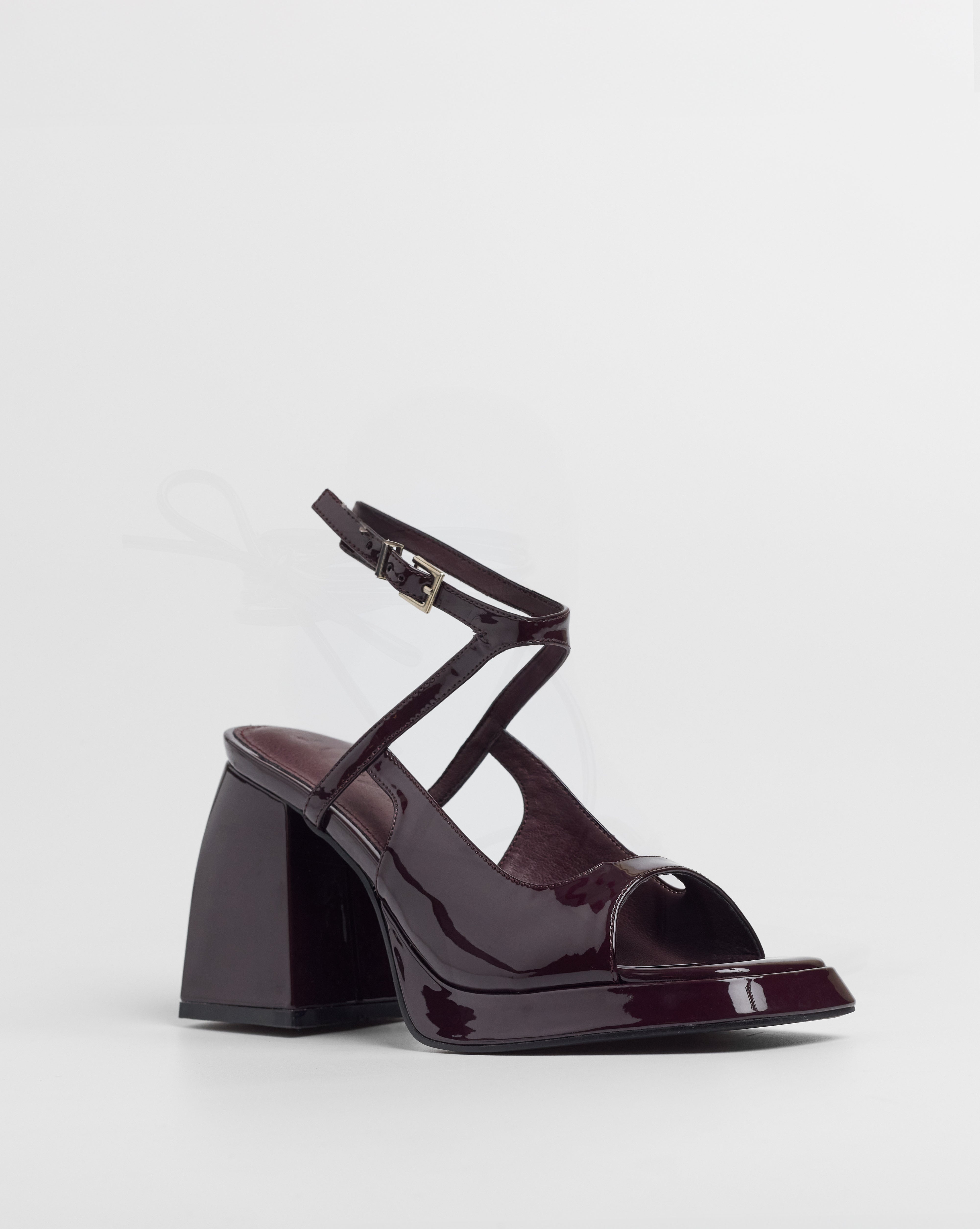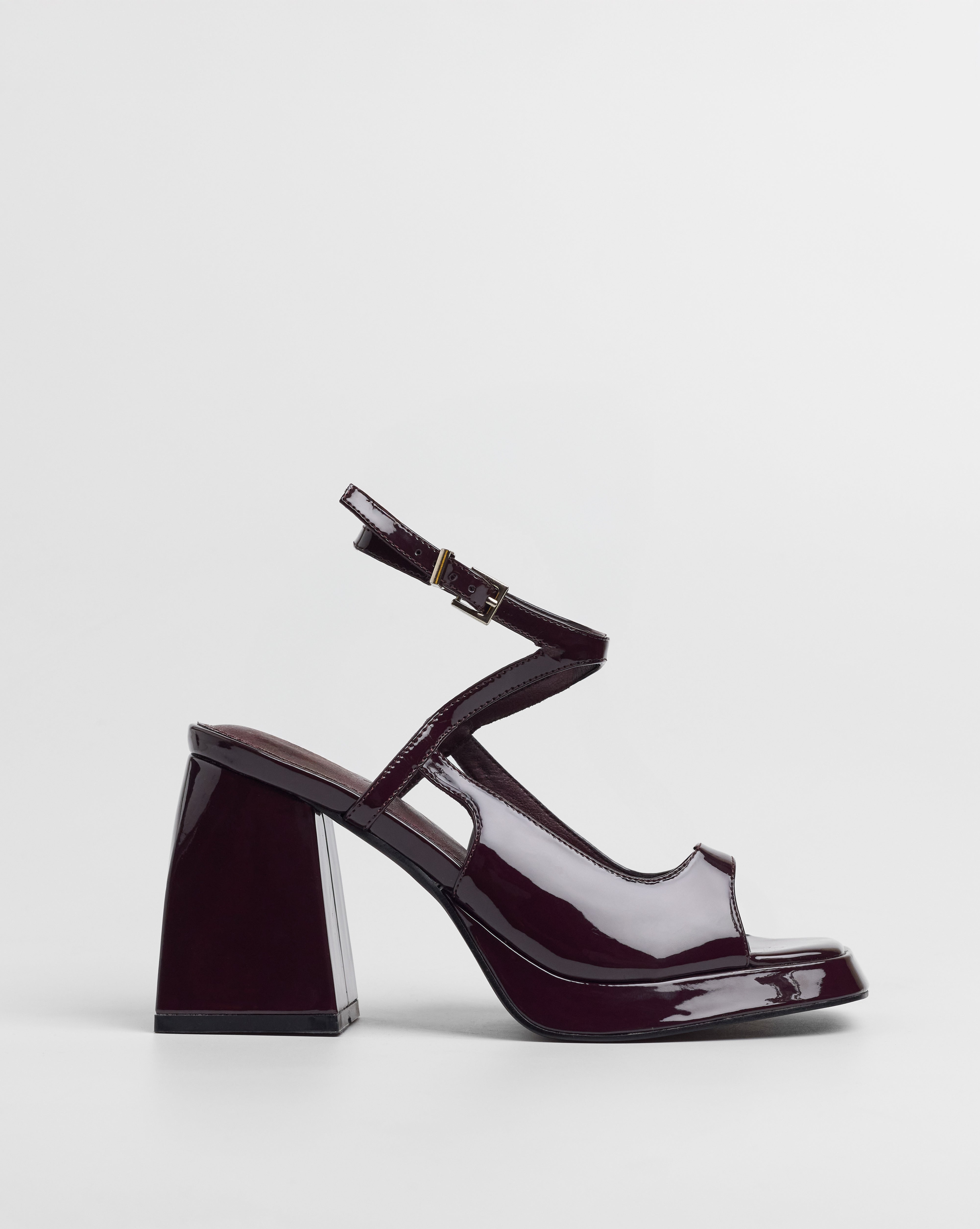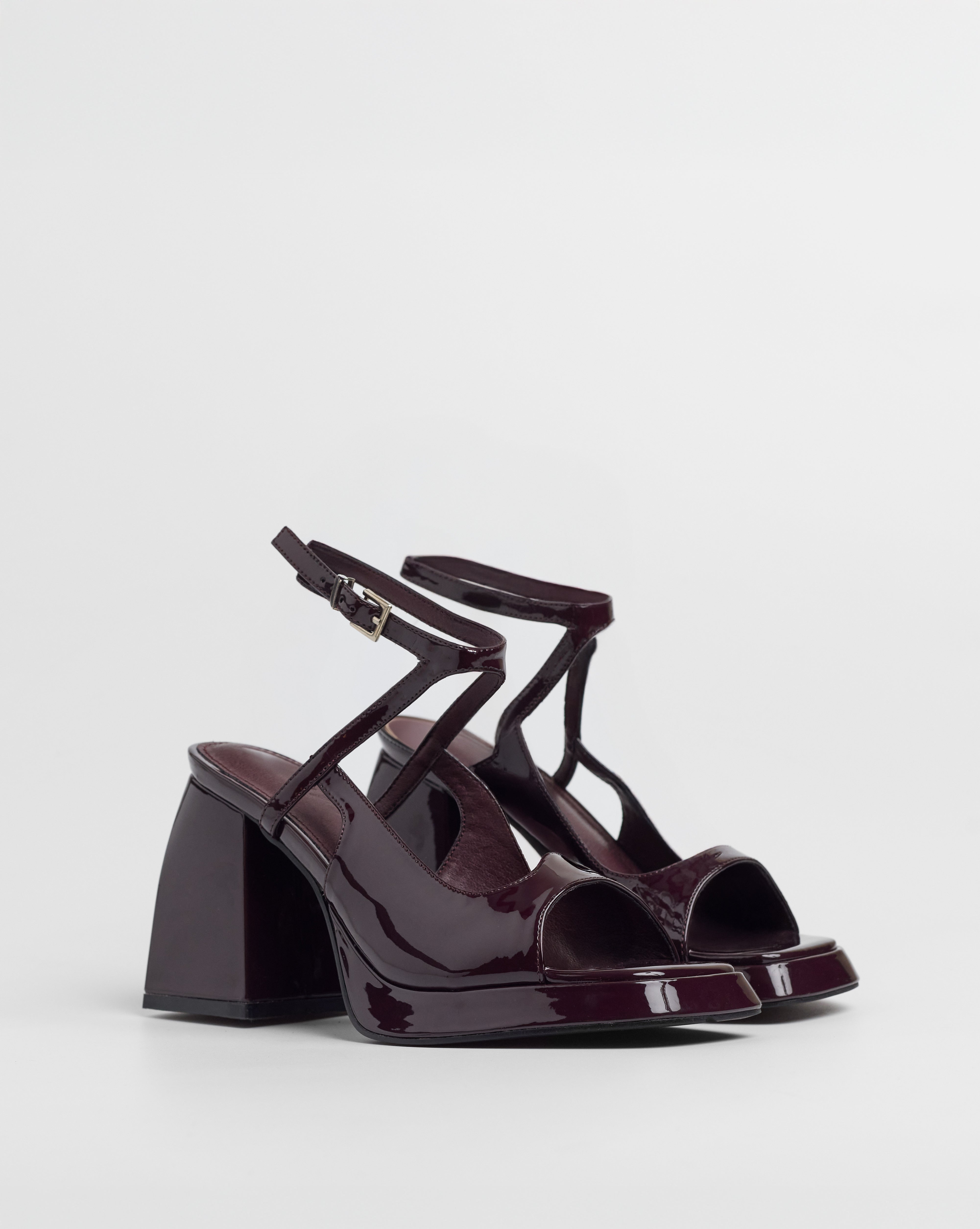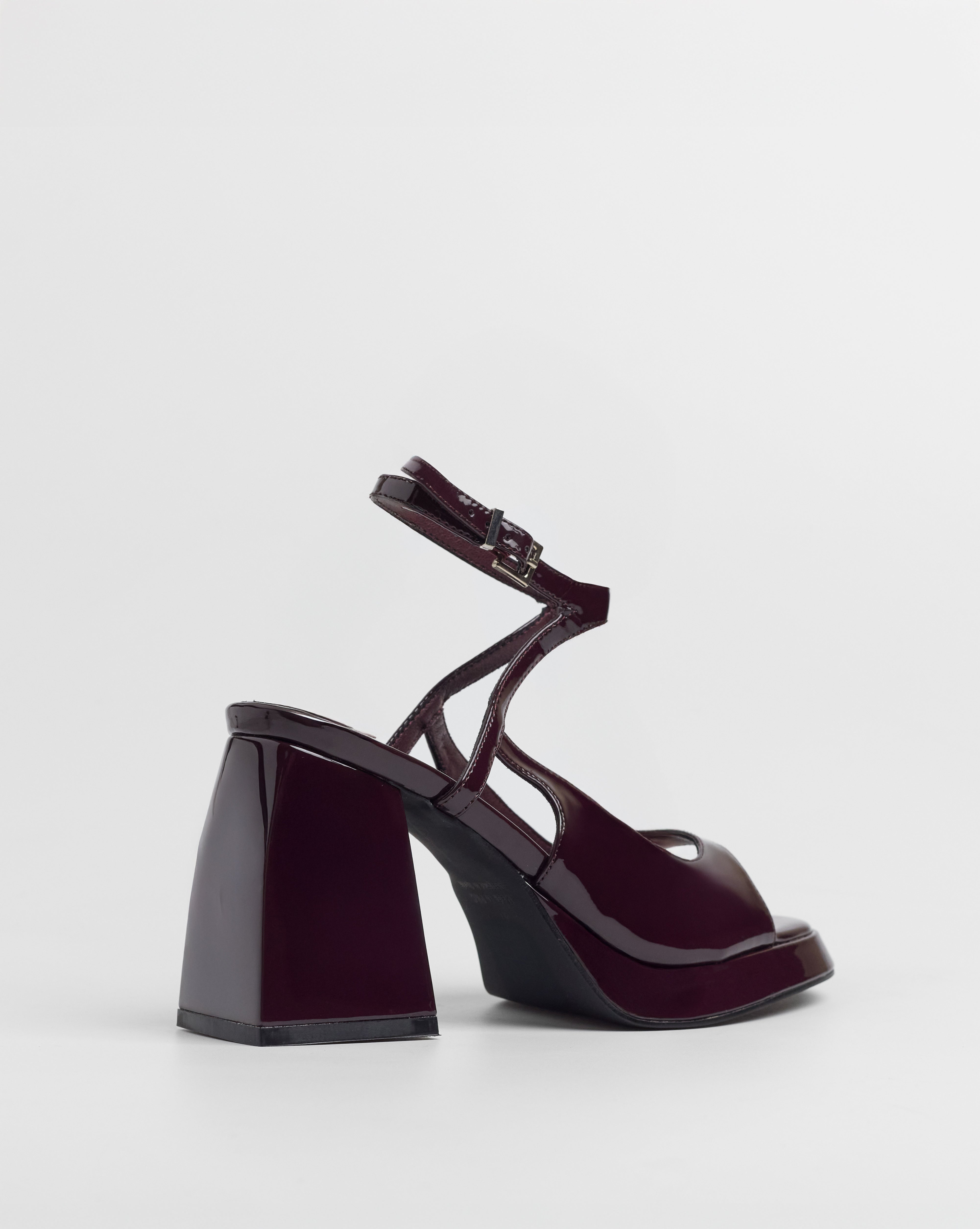 Sandalia de tacón con plataforma de puntera geometrica en color burdeos.Tira delantera envolvente en laterales, unida a tira trasera con sujección de pulsera con hebilla en tobillo. Tacón alto ancho.