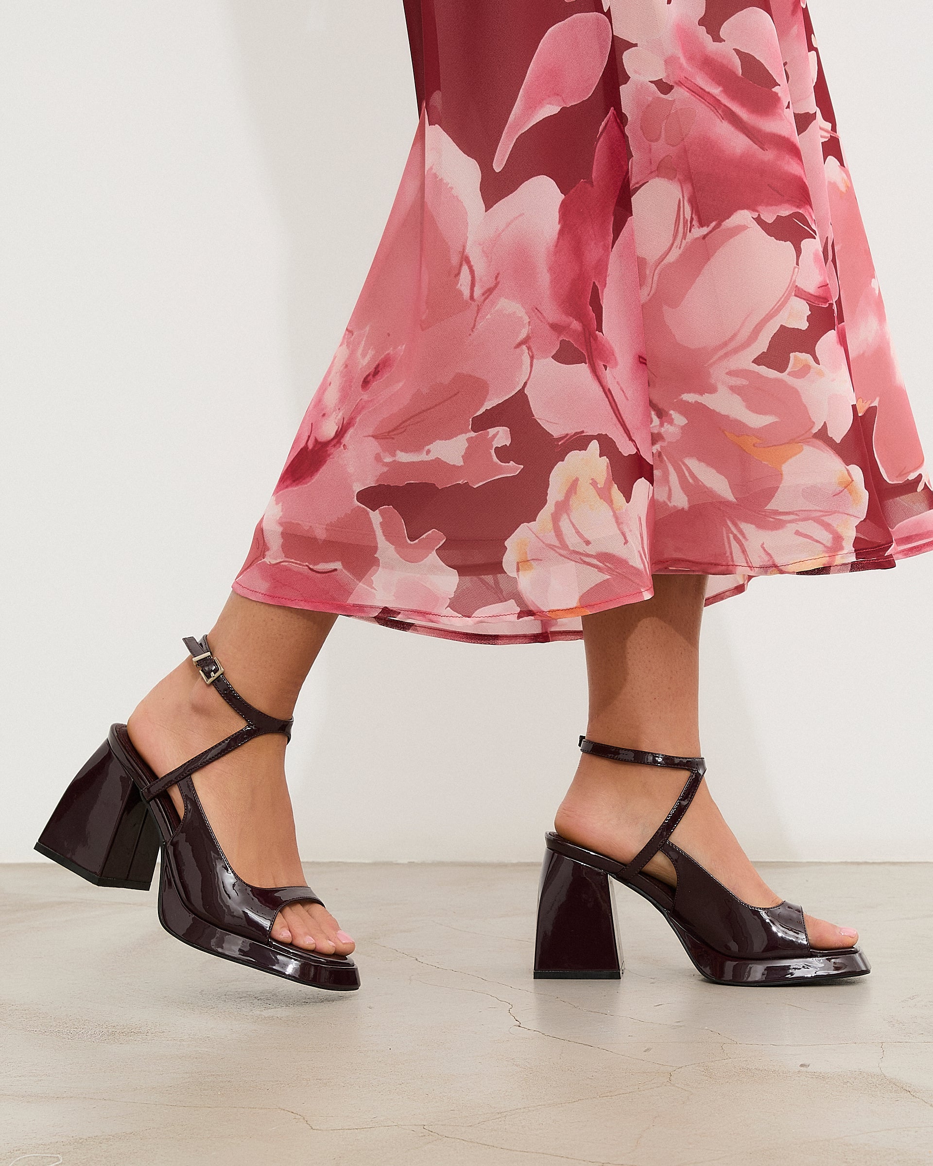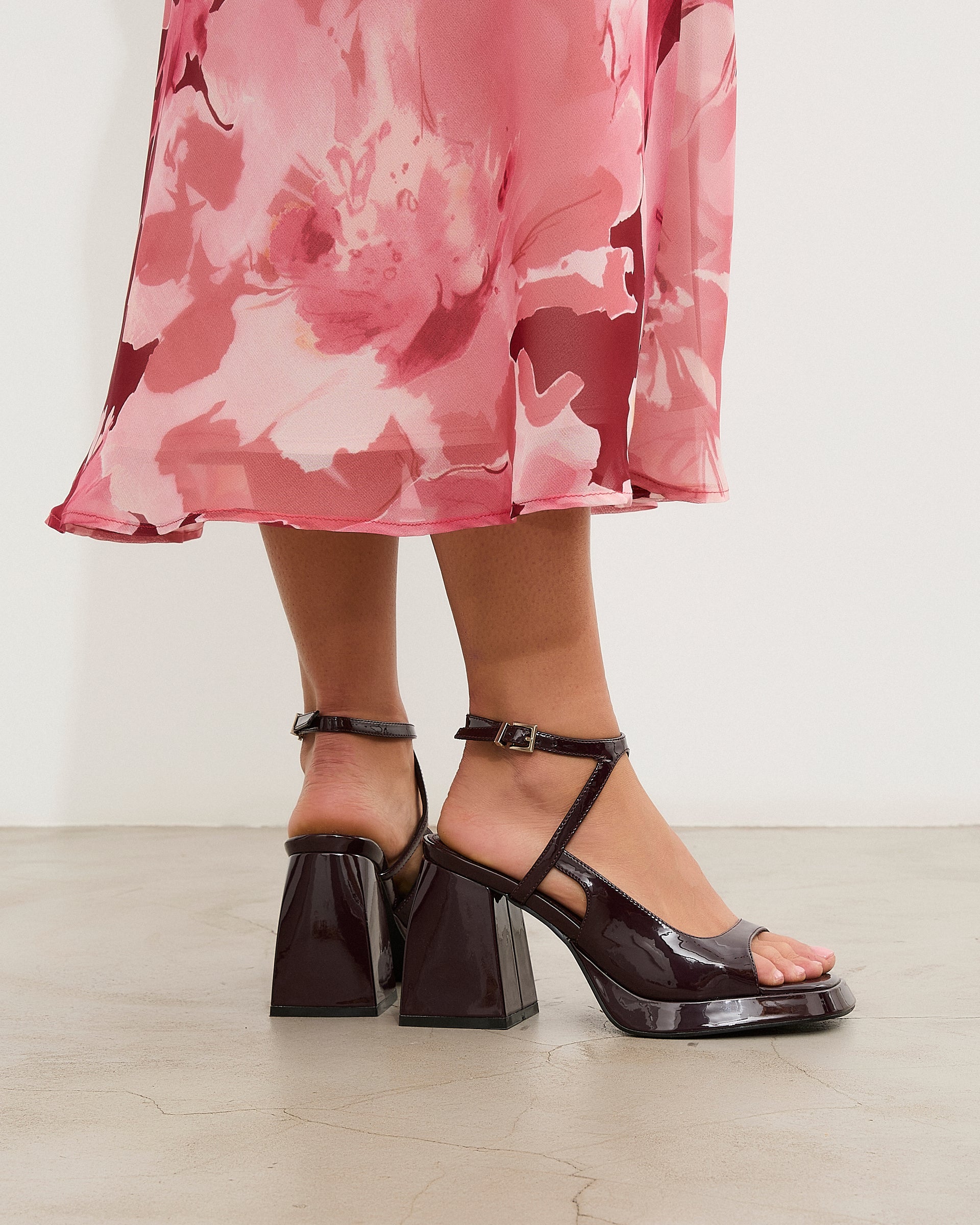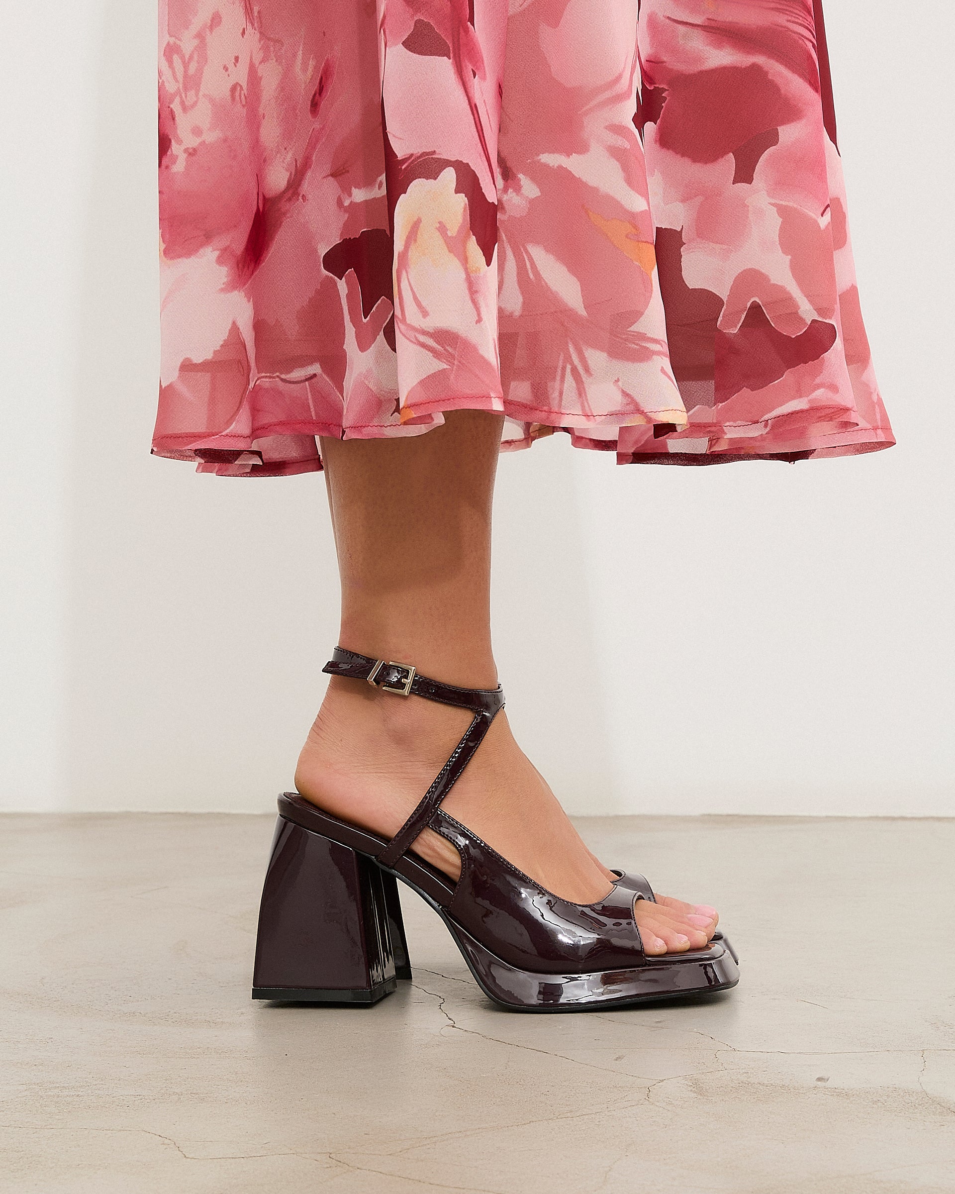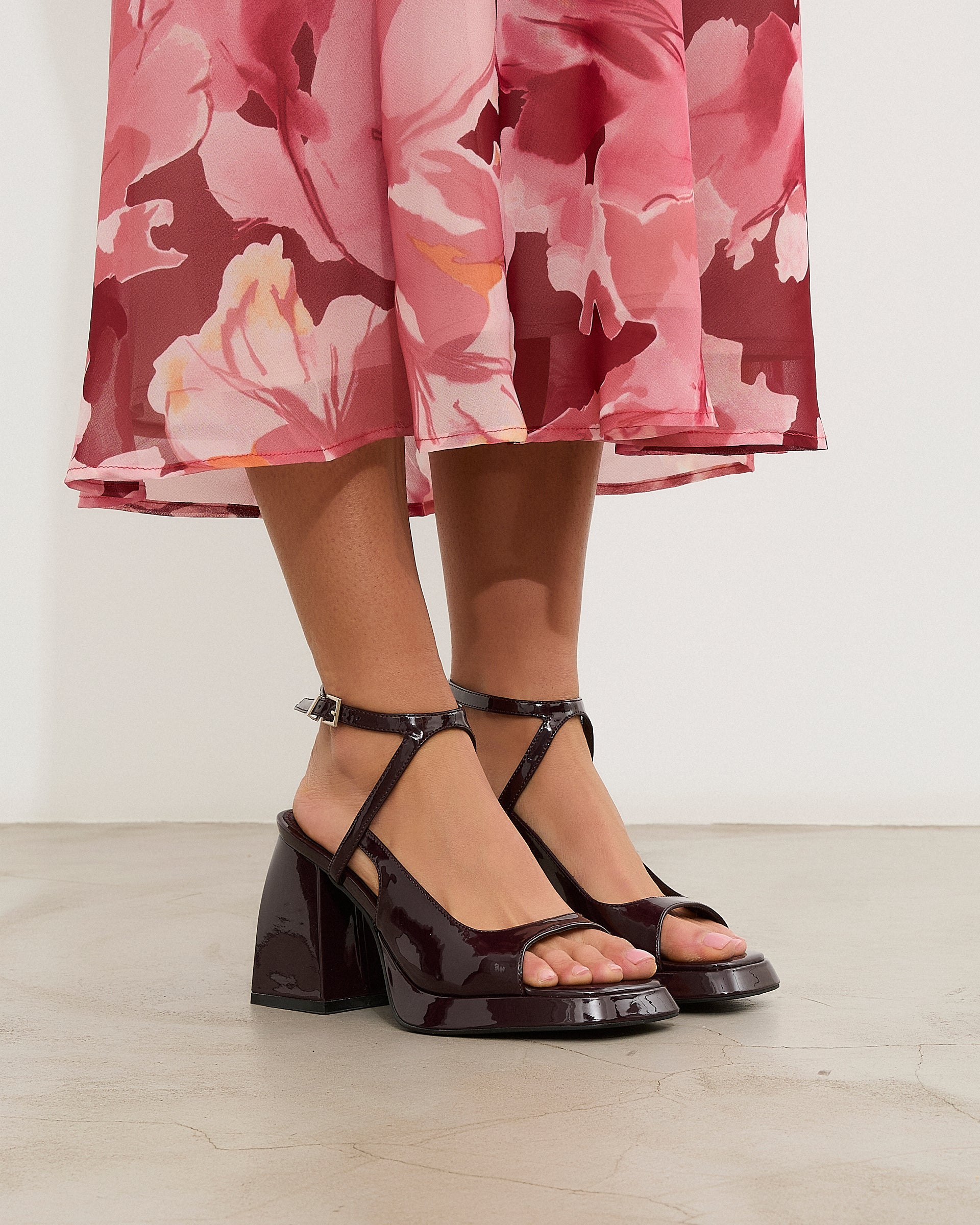 Sandalia de tacón con plataforma de puntera geometrica en color burdeos.Tira delantera envolvente en laterales, unida a tira trasera con sujección de pulsera con hebilla en tobillo. Tacón alto ancho.