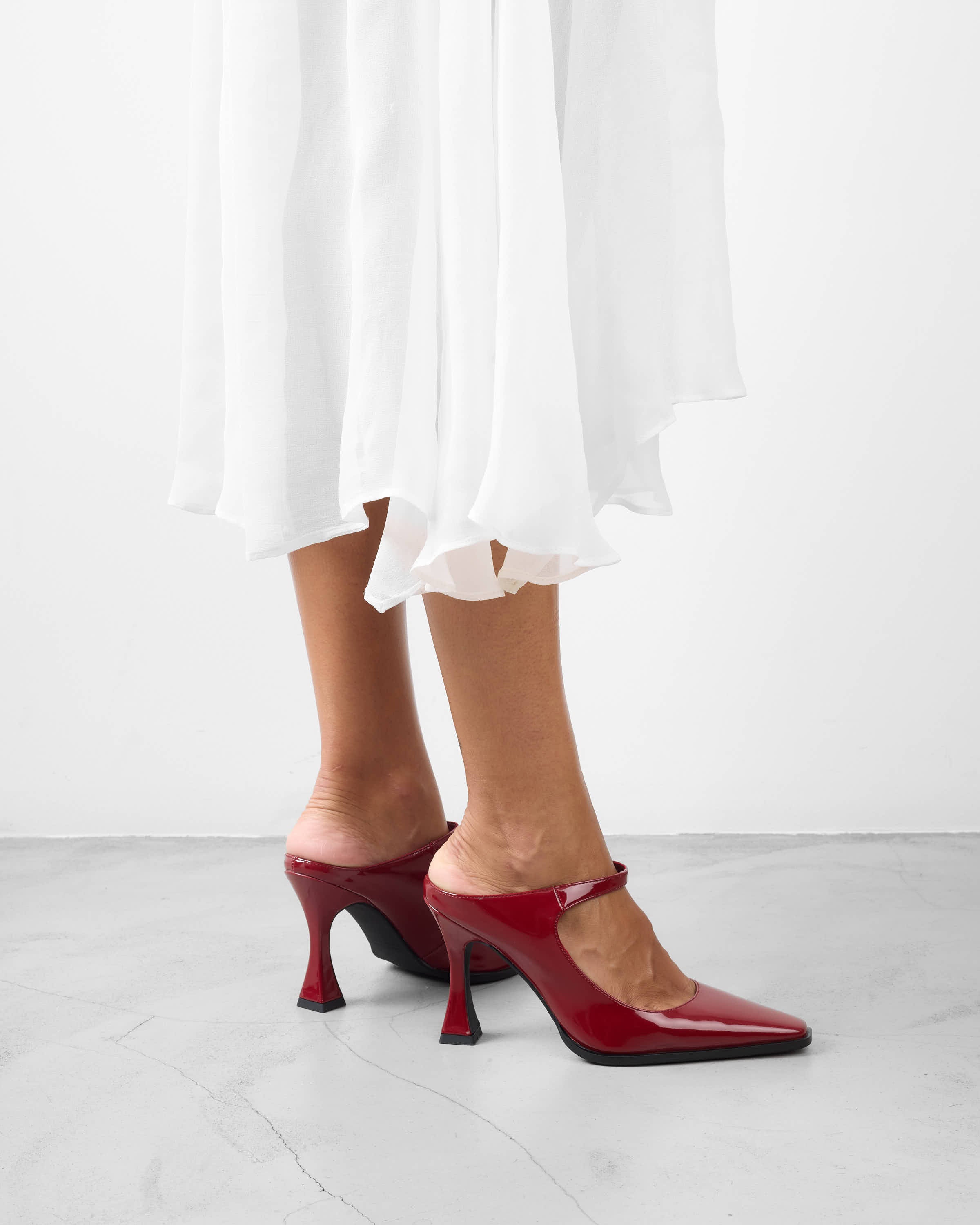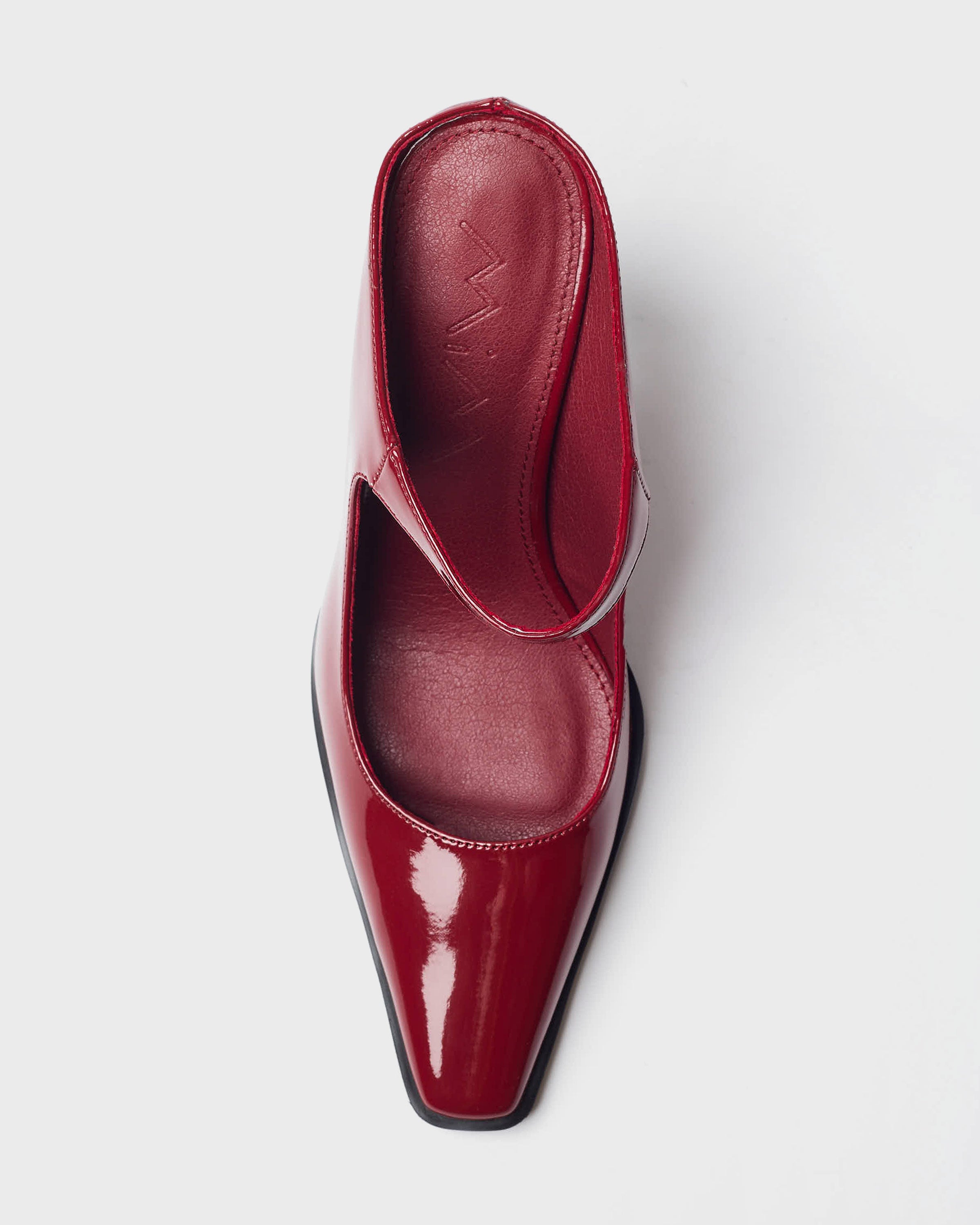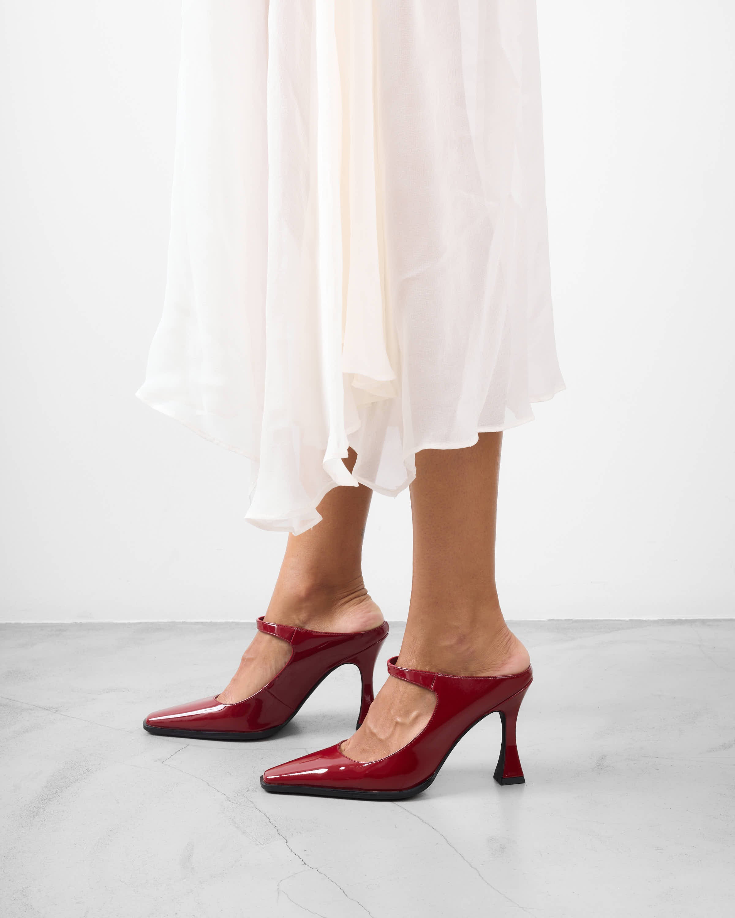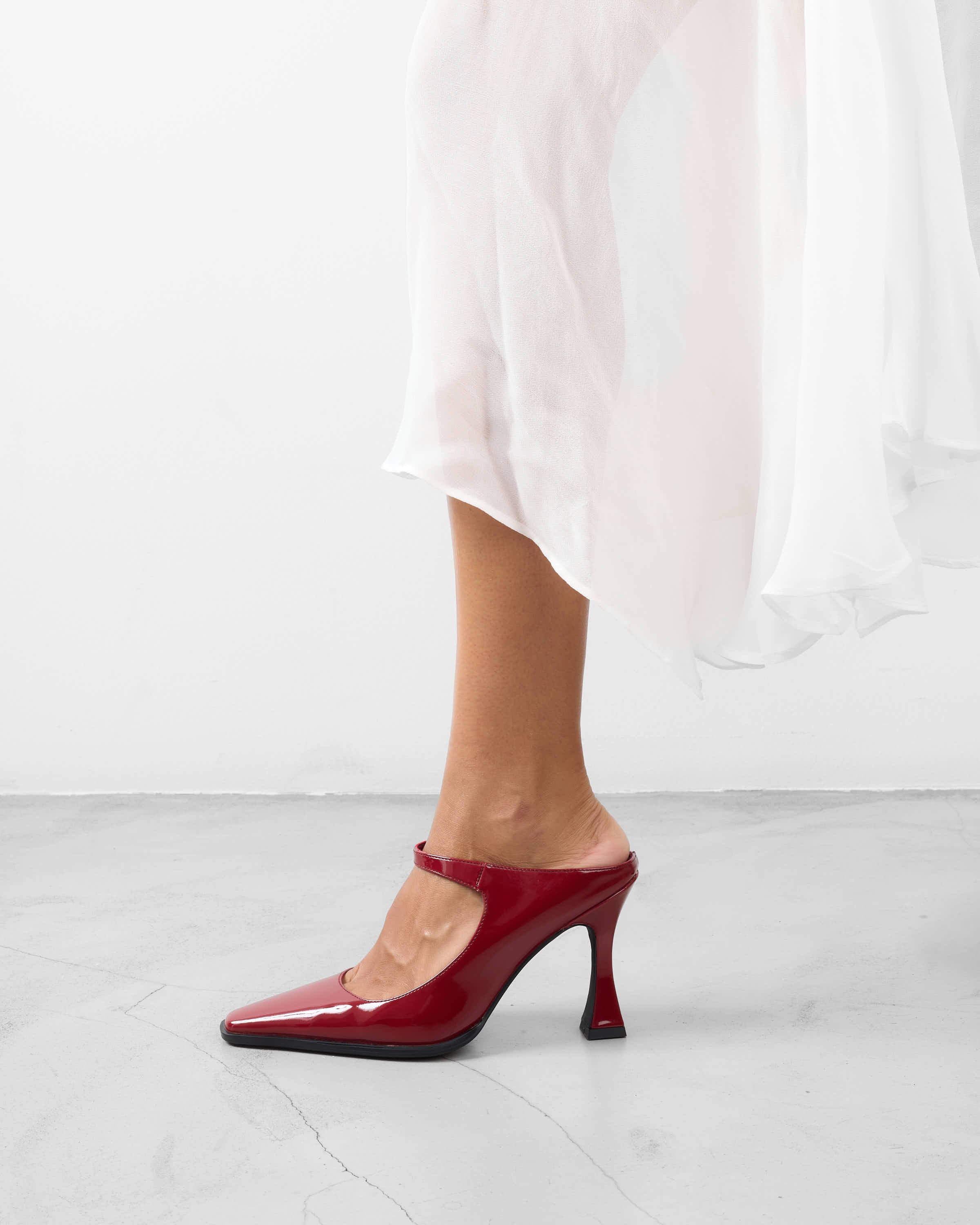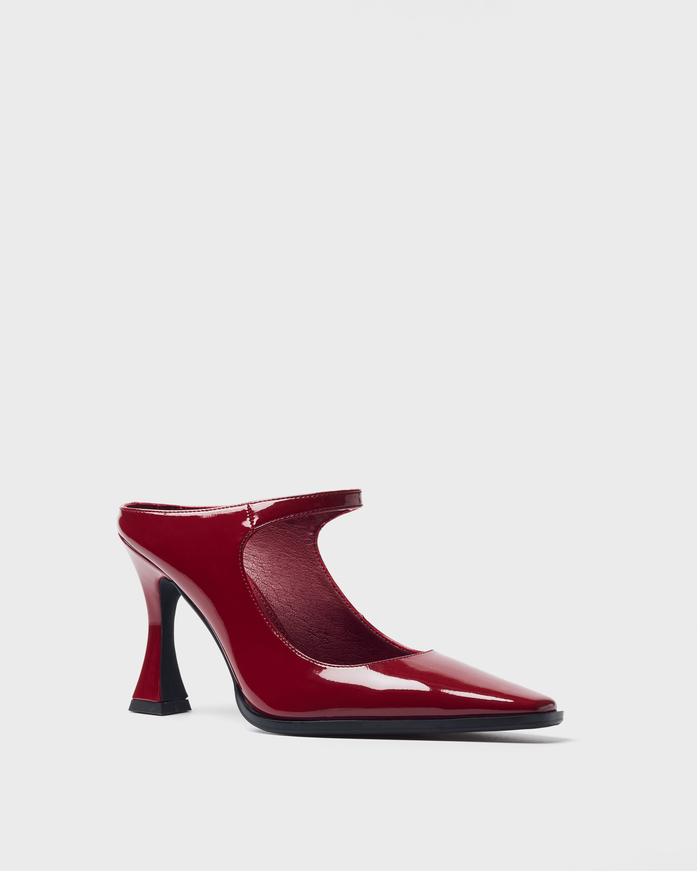 Zapato de tacón cerrado con parte delantera en punta color rojo efecto charol. Parte trasera destalonada con tira en el empeine para la sujección.