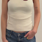 Top de punto en color beige. Escote redondo y tirantes anchos con vivo a contraste. Detalle de tirante cruzado en cuello.