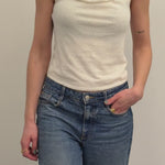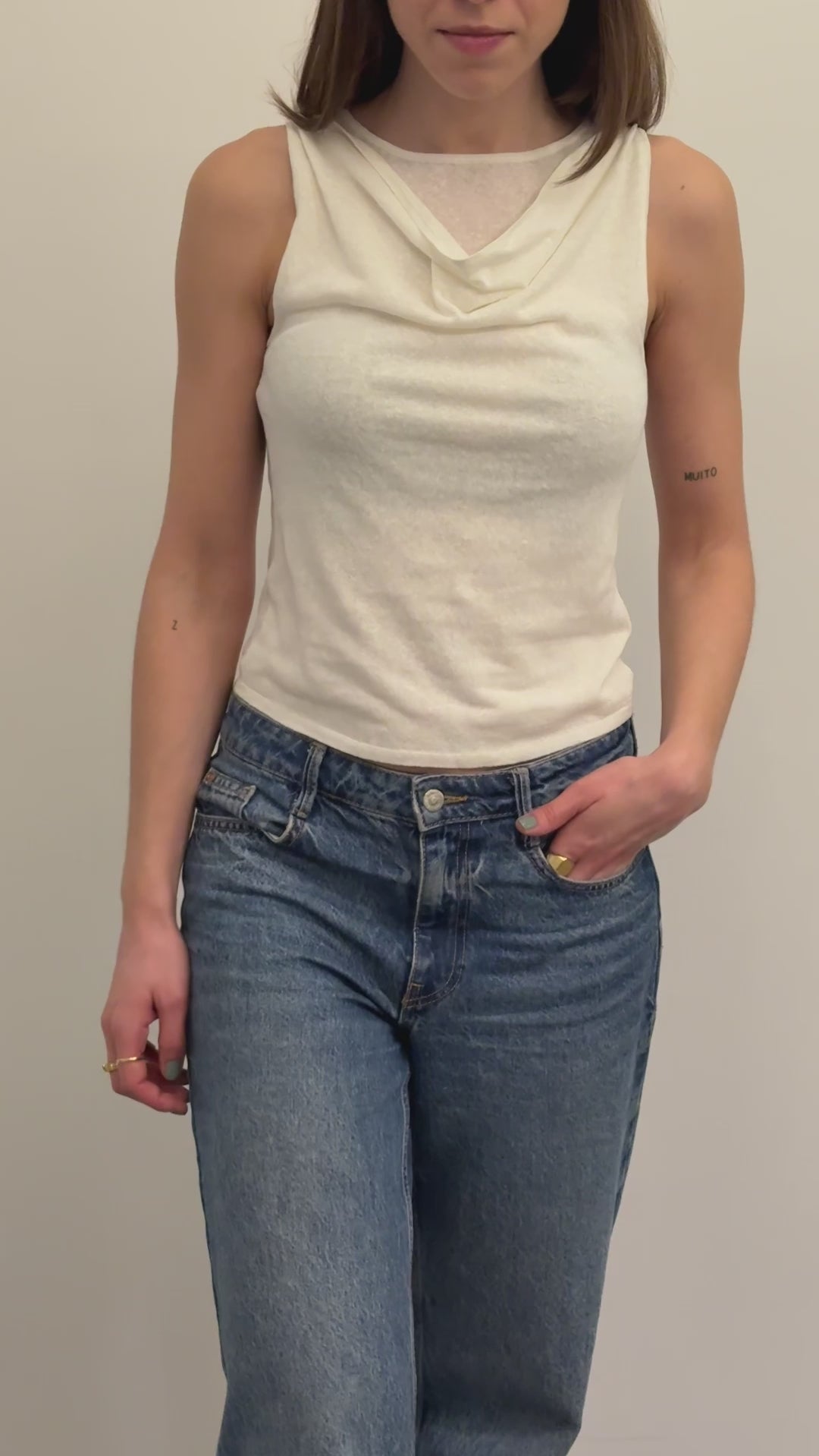 Top de punto en color beige. Escote barco sin mangas. Detalle drapeado en cuello y espalda descubierta.