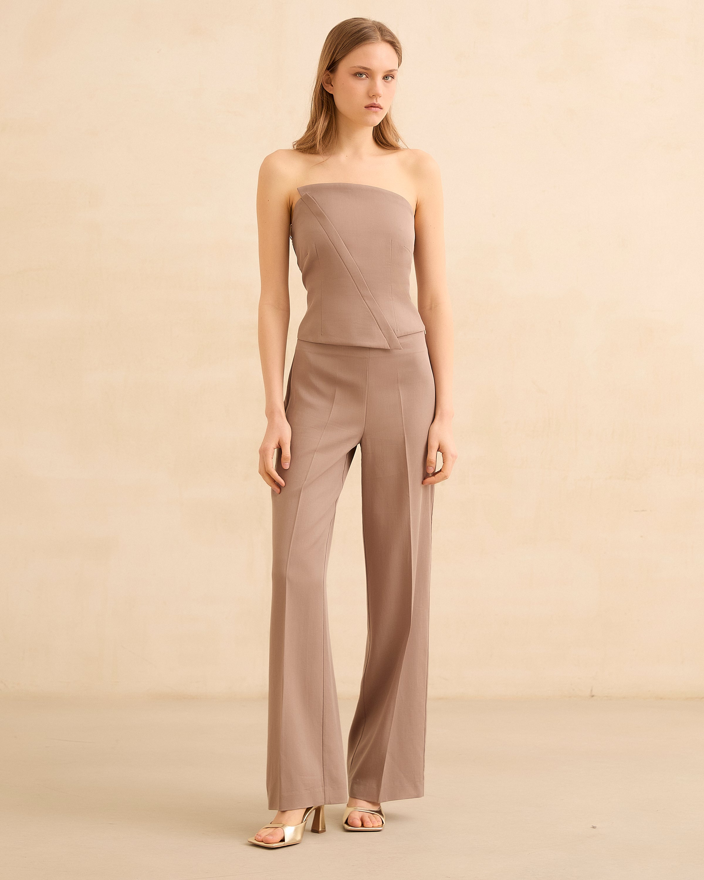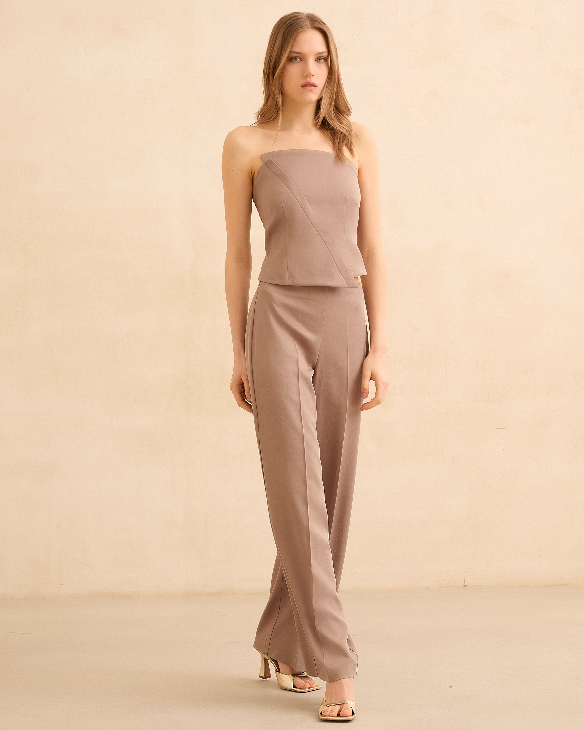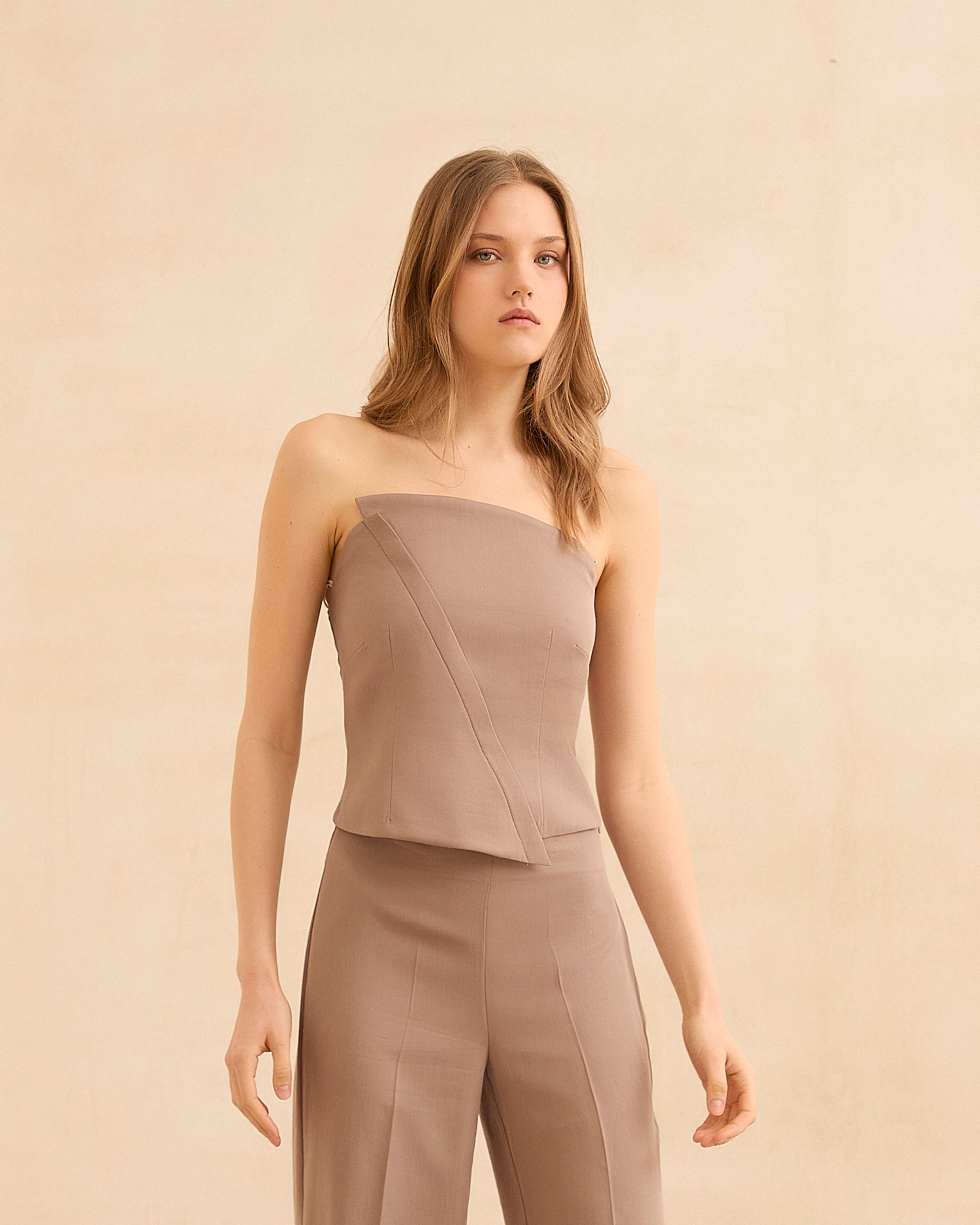 Top palabra de honor en color topo. Corte asimétrico y cierre con cremallera lateral invisible. Ajuste trasero con fruncido en nido de abeja.
