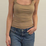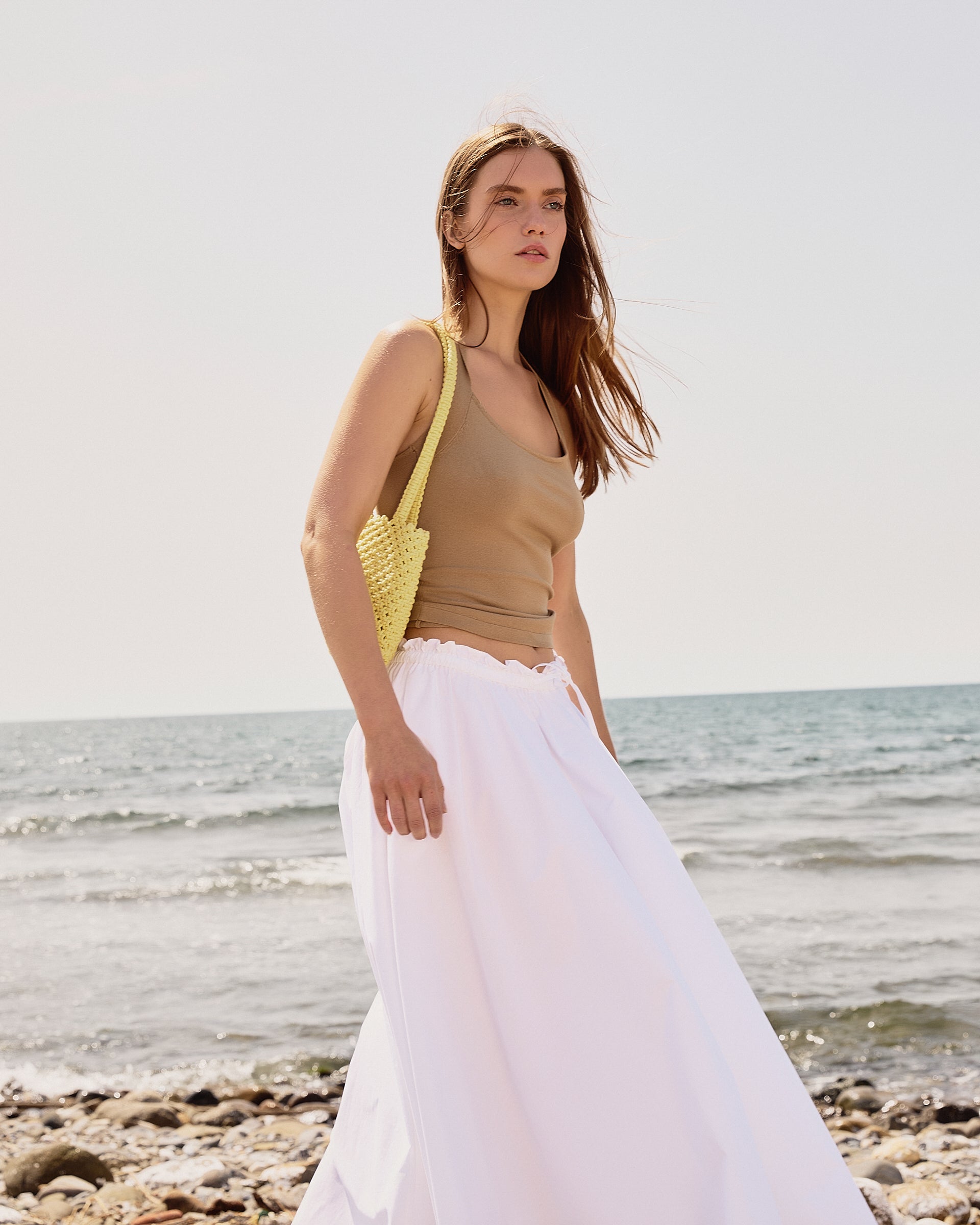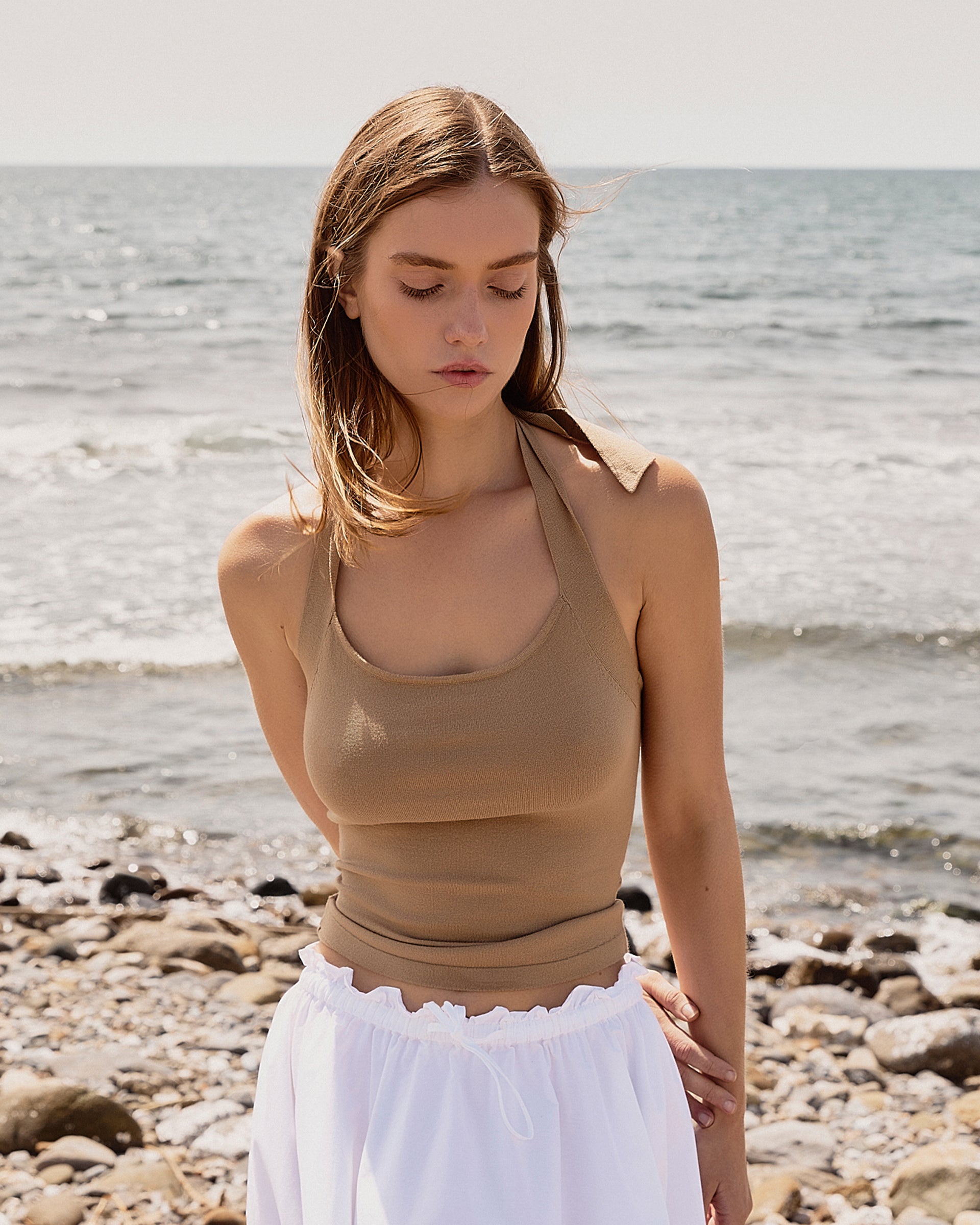 Top de punto en color caramelo. Corte tipo halter con ajuste en cuello. Espalda descubierta.