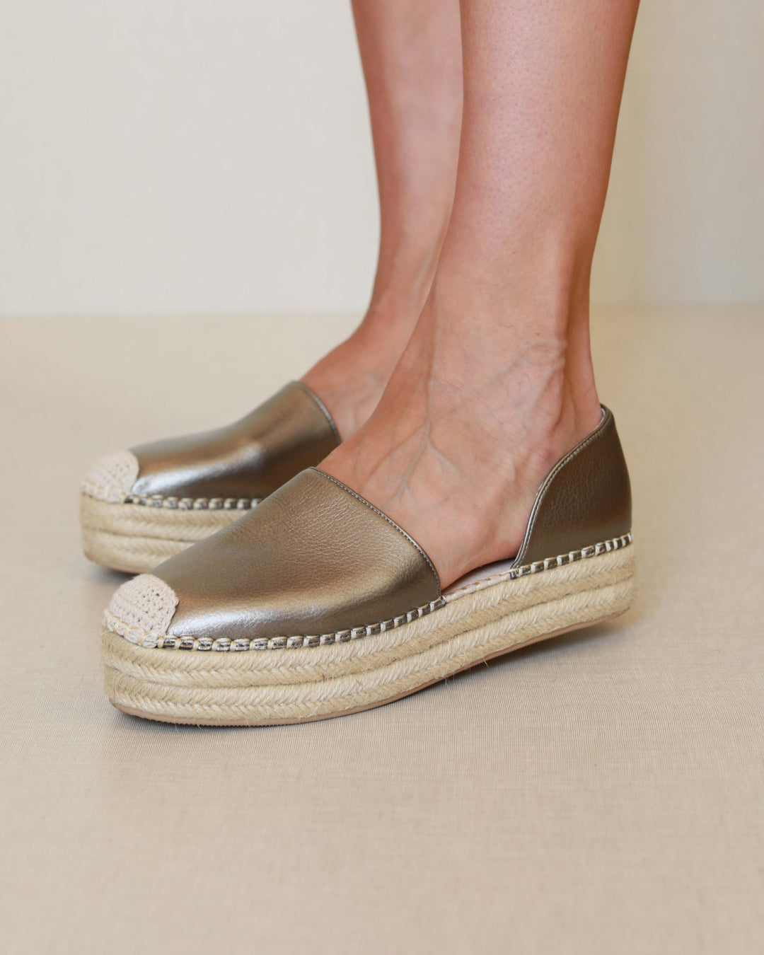 Alpargata con doble suela de esparto. Parte delantera y trasera cerradas de piel vegana plateada.