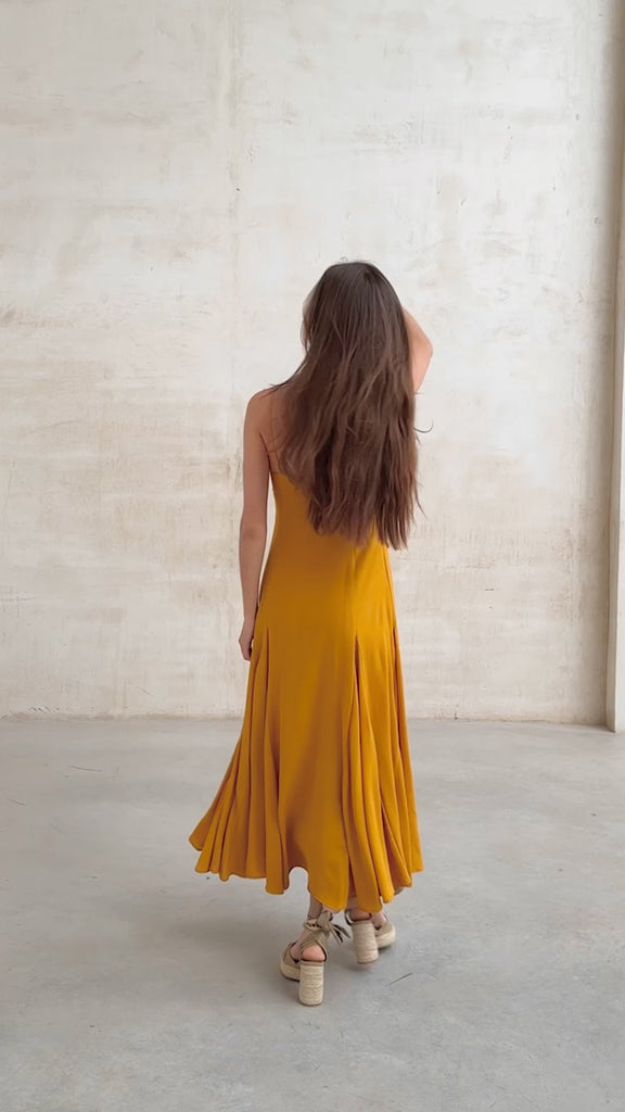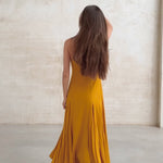 Vestido largo de tirante fino en color mostaza. Ajuste en cintura y falda con vuelo. Forro interior combinado a contraste. Cremallera lateral invisible.