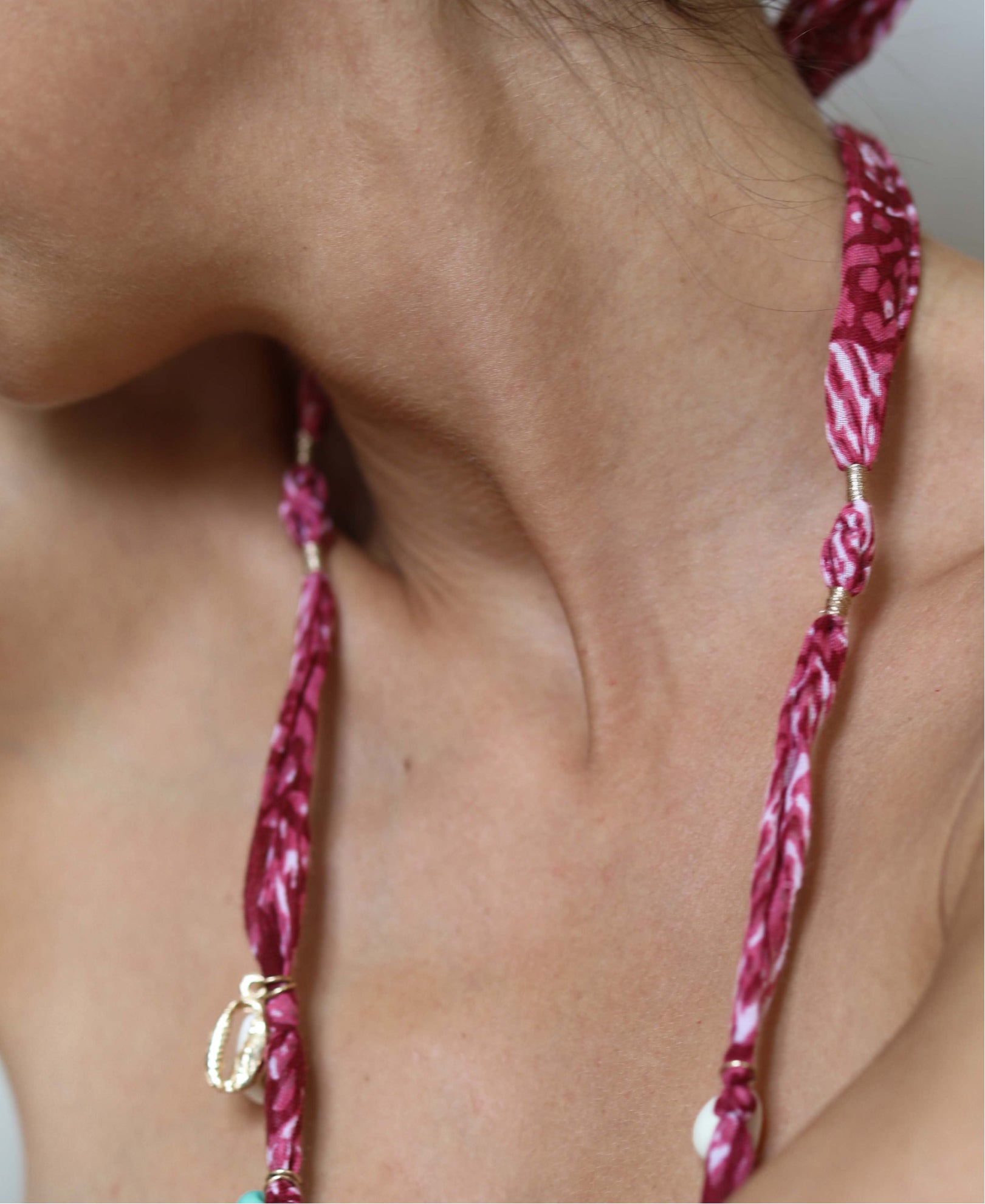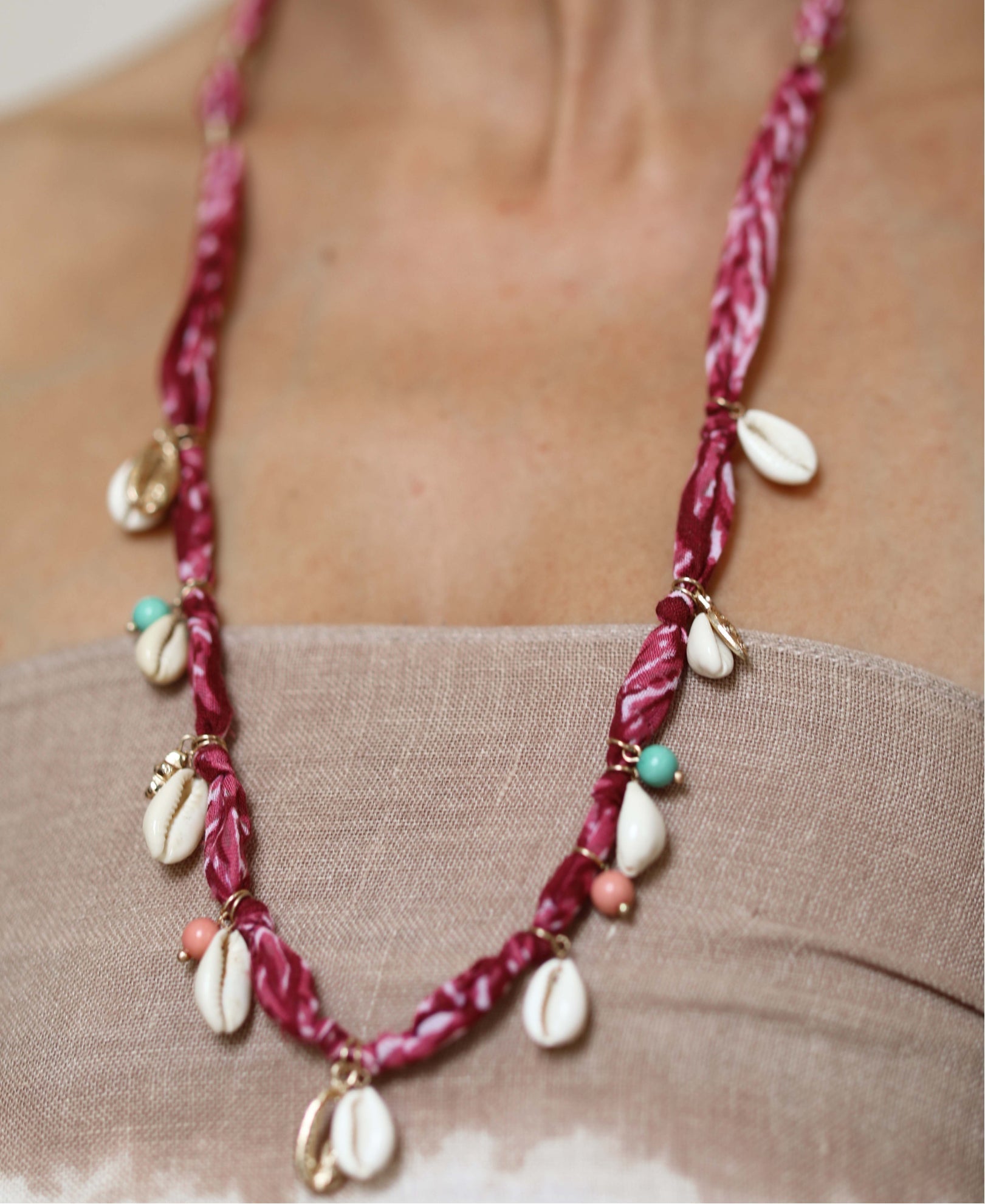Collar de tela en color rosa fucsia, con conchas y abalorios entrelazados entre sí. Cierre ajustable