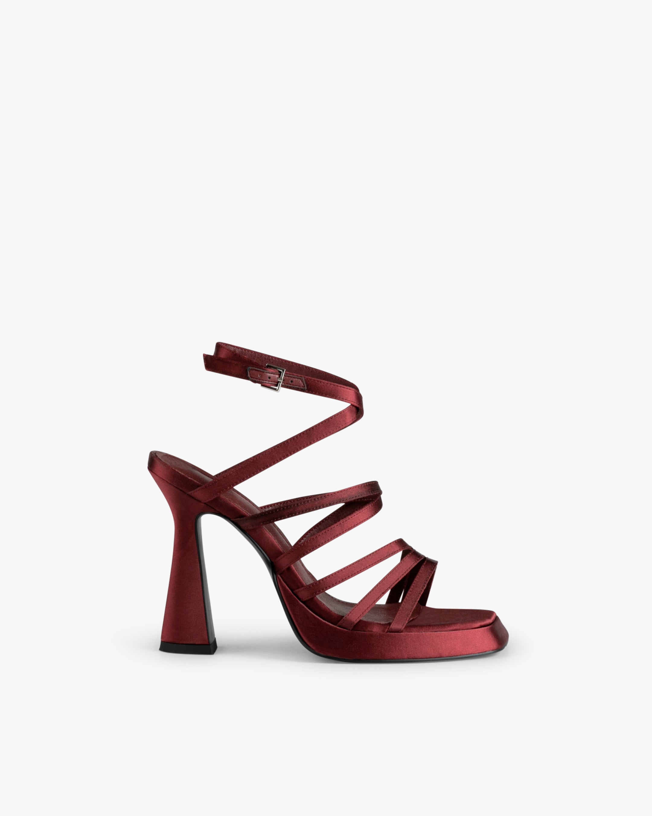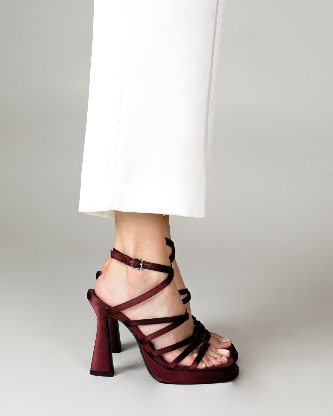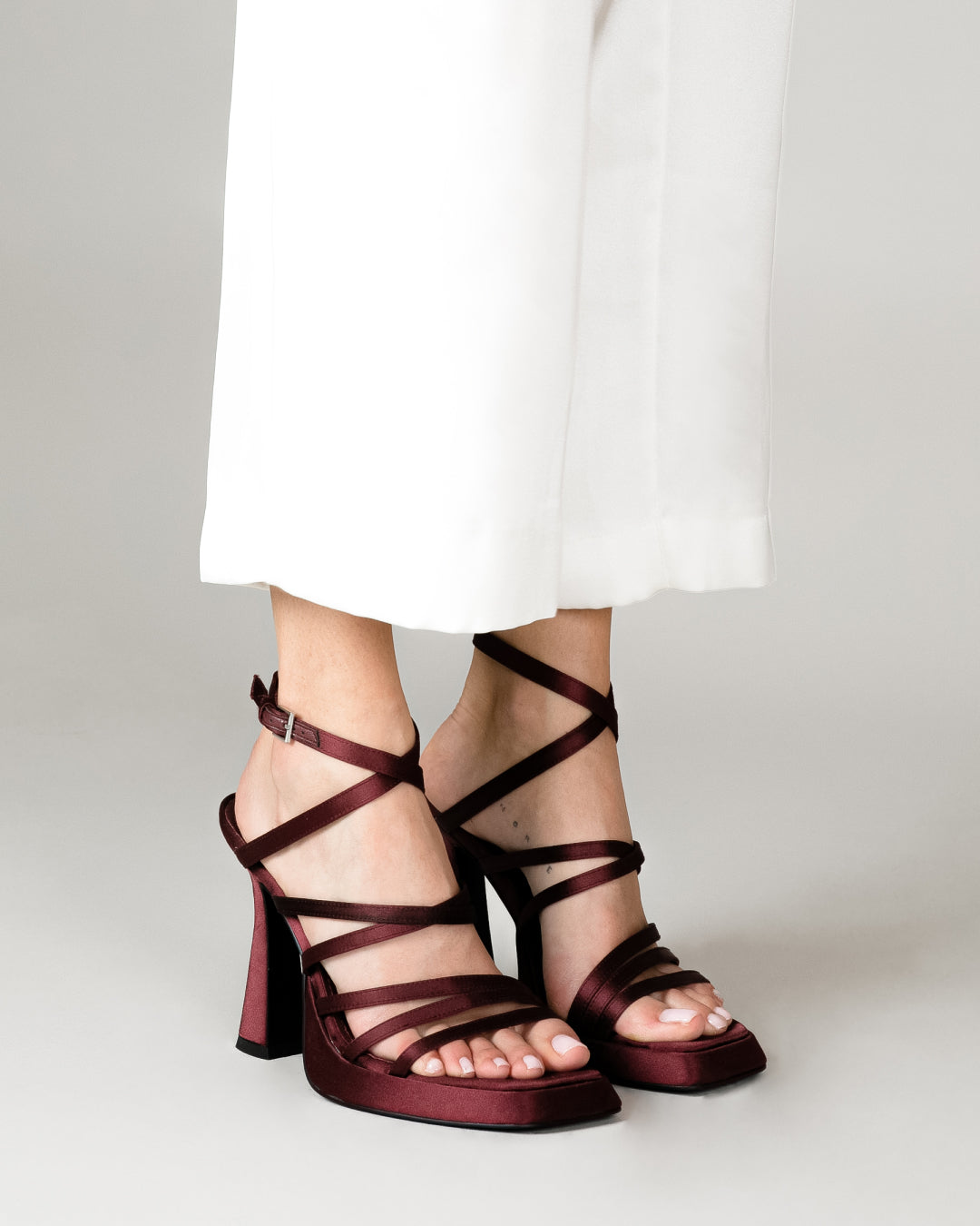 Sandalia de tacón en color burdeos y plataforma. Parte delantera abierta con tiras y tacón fino con plataforma cuadrada. Cierre de tiras al tobillo con hebilla.