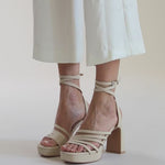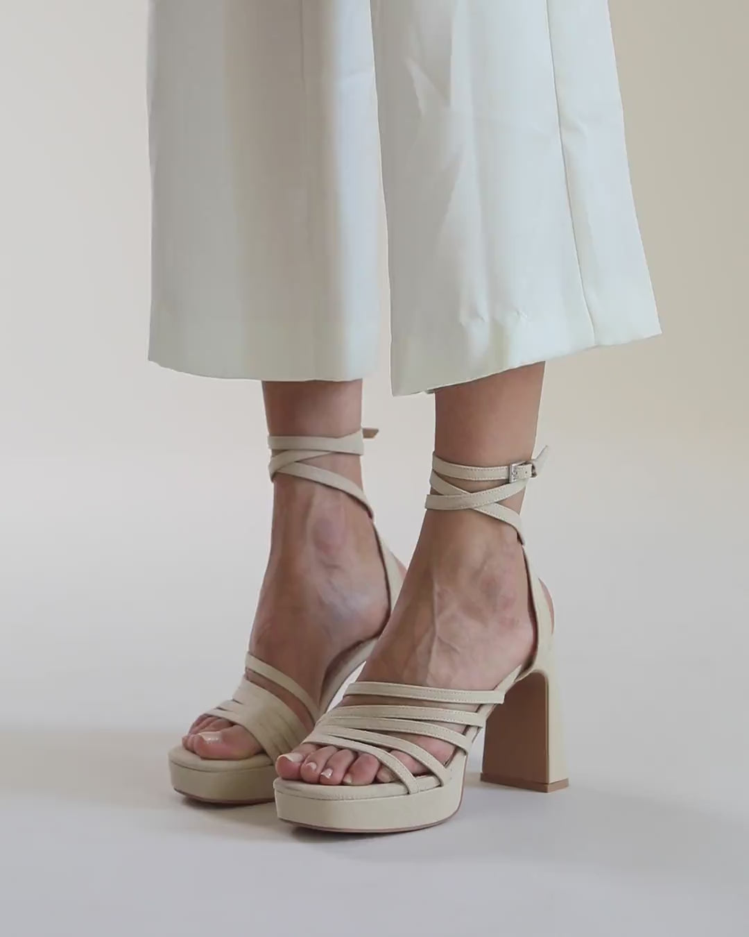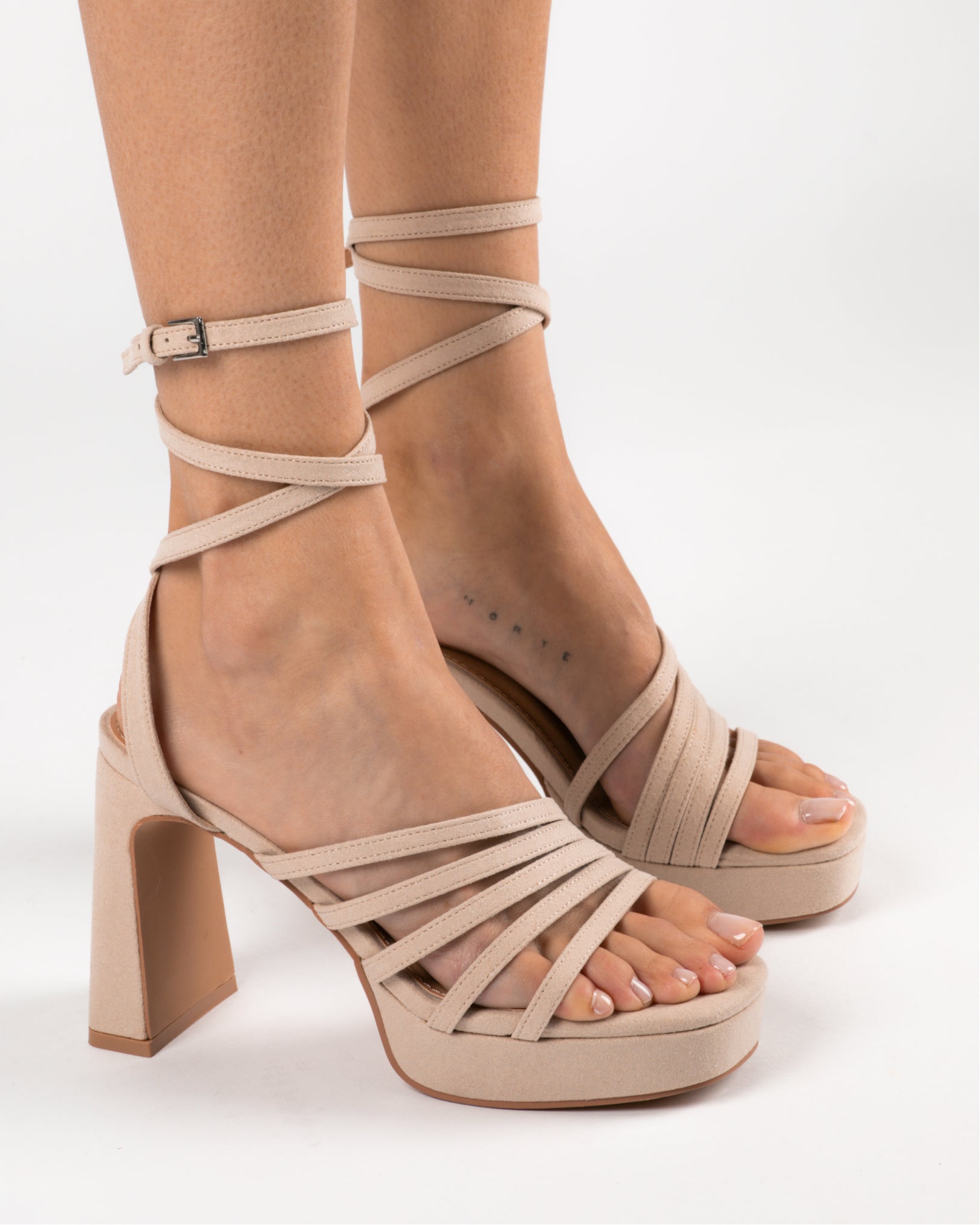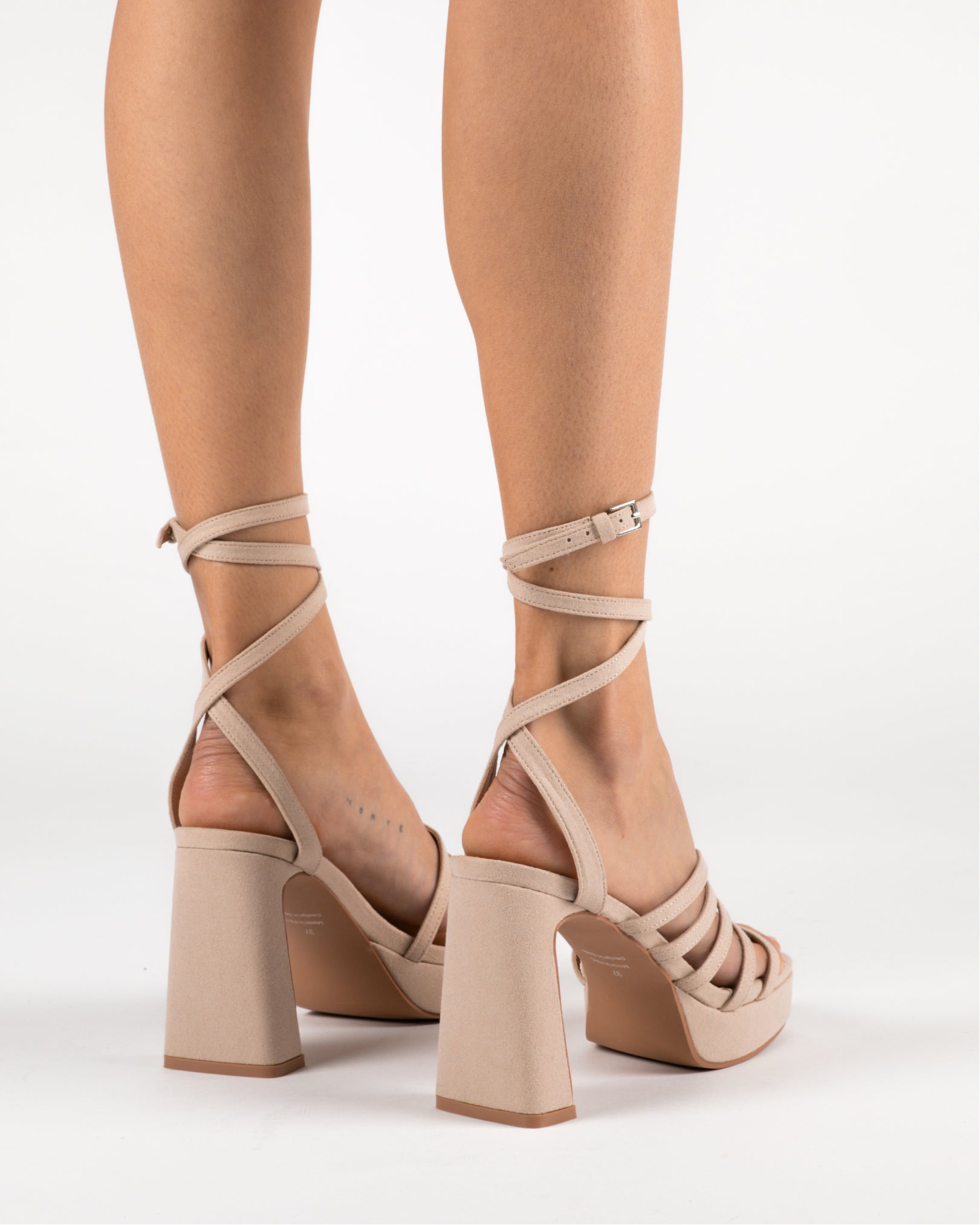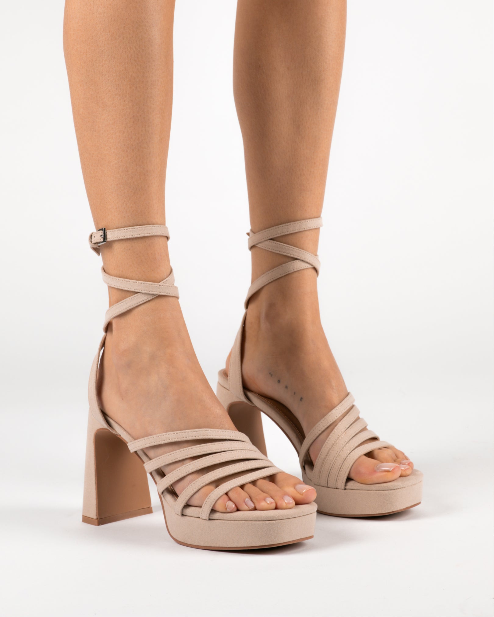 Sandalia de tacón en ante vegano color ecru. Parte delantera abierta con varias tiras y plataforma con tacón rectangular. Cierre de pulsera con varias tiras al tobillo con hebilla metálica.