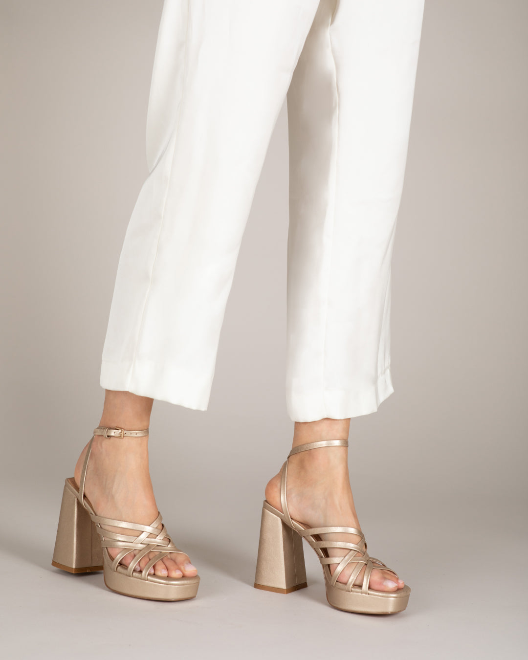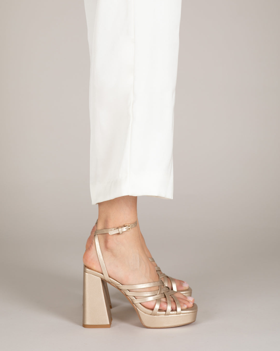 Sandalia de tacón en piel vegana color dorado. Parte delantera con tiras cruzadas y plataforma. Cierre de pulsera al tobillo con hebilla metálica.