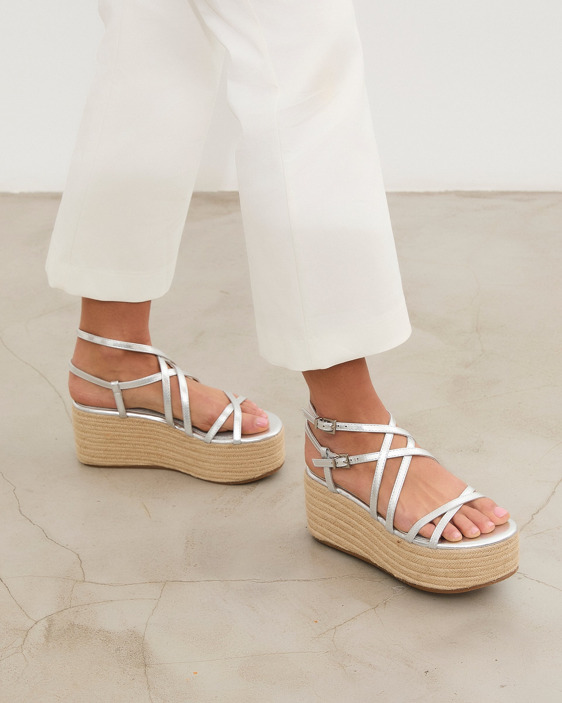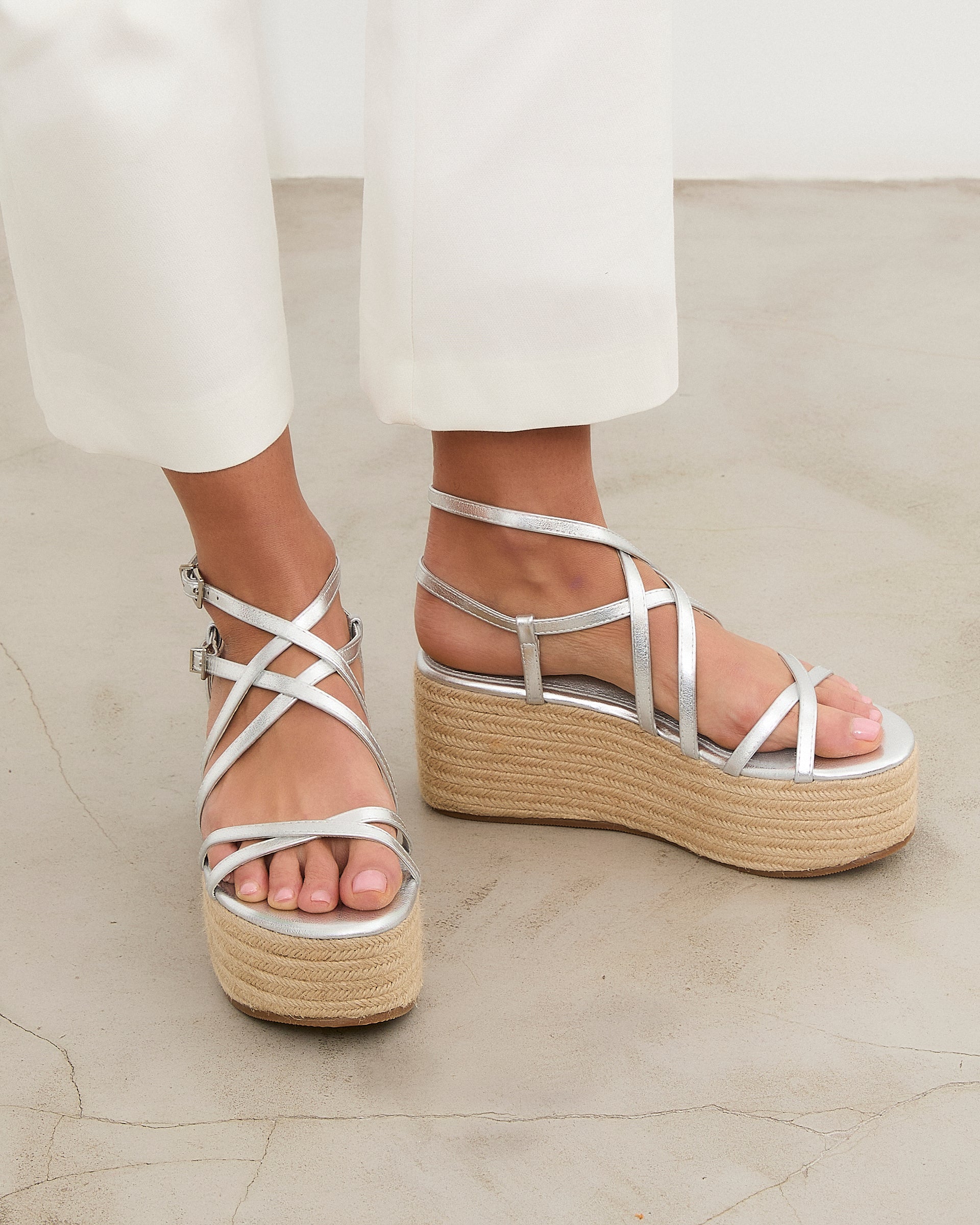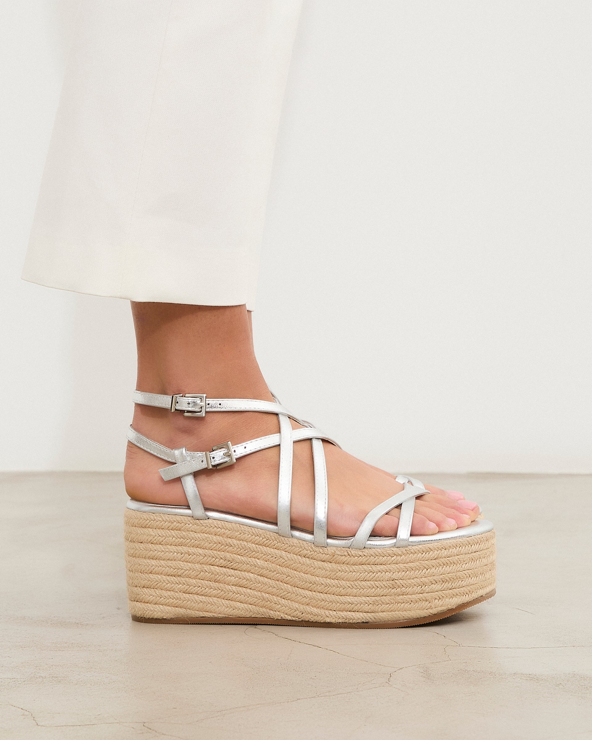 Sandalia con plataforma de esparto color plata con tiras a diferentes niveles y con doble hebilla para atar alrededor del tobillo.