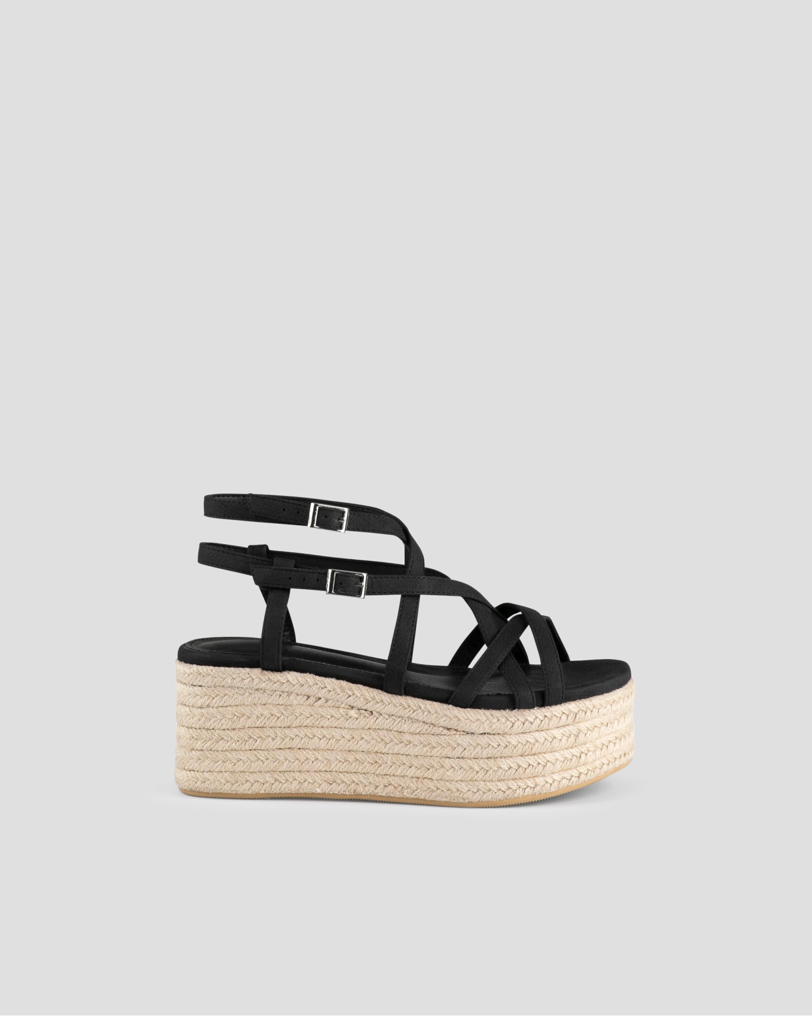 Sandalia con plataforma de esparto en ante vegano color negro con tiras a diferentes niveles y con doble hebilla para atar alrededor del tobillo.